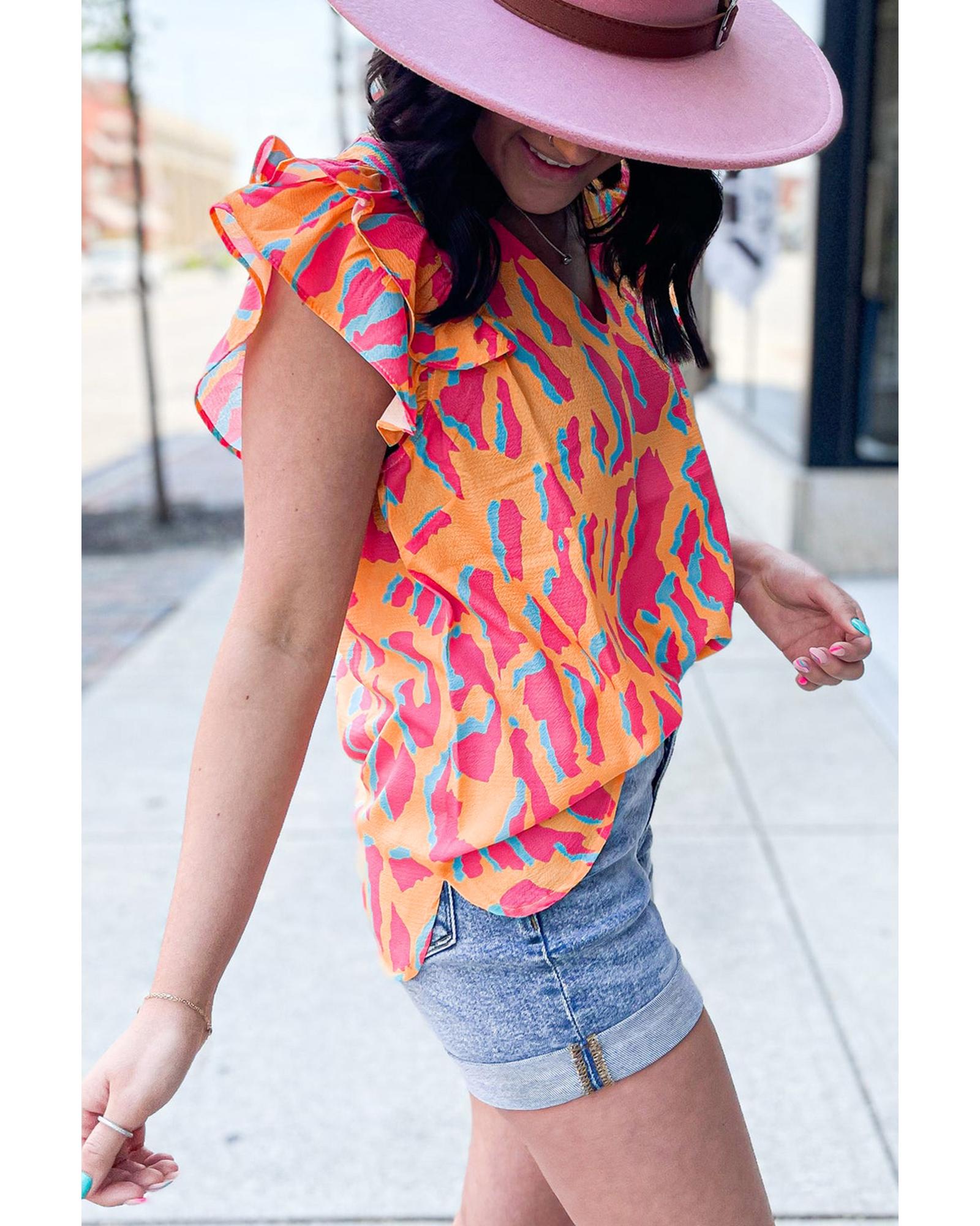 Orange Abstract Print V Neck Ruffled Sleeve Blouse – L