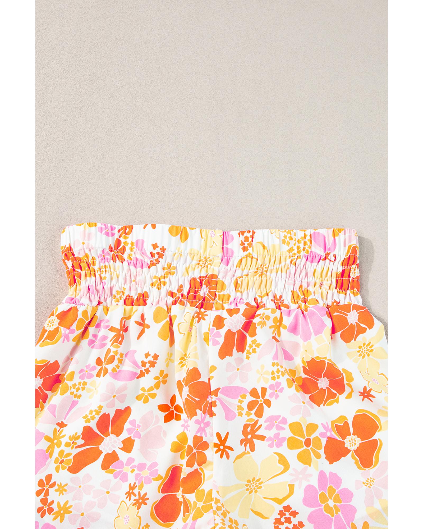 Orange Boho Floral Shirred High Waist Casual Shorts – L