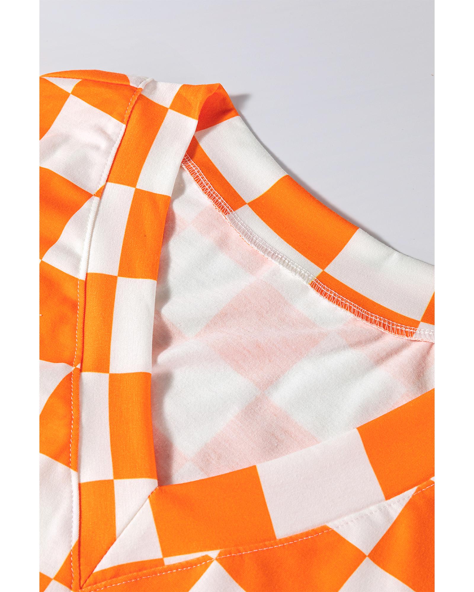 Orange Checkerboard Print V Neck Loose Tee and Shorts Lounge Set – M