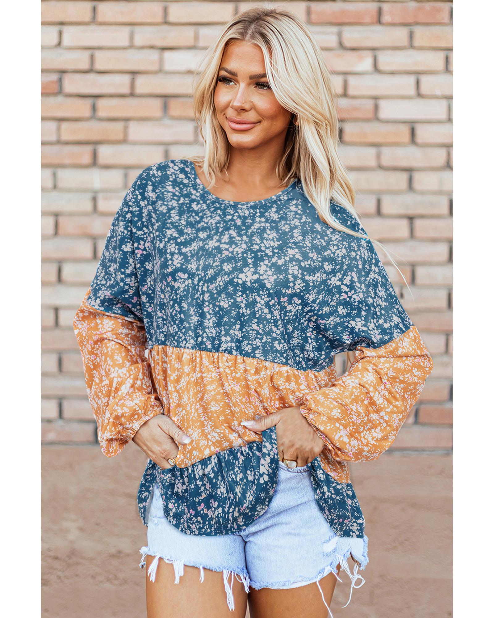 Orange Floral Color Block Patchwork Ruffled Hem Round Neck Blouse – L