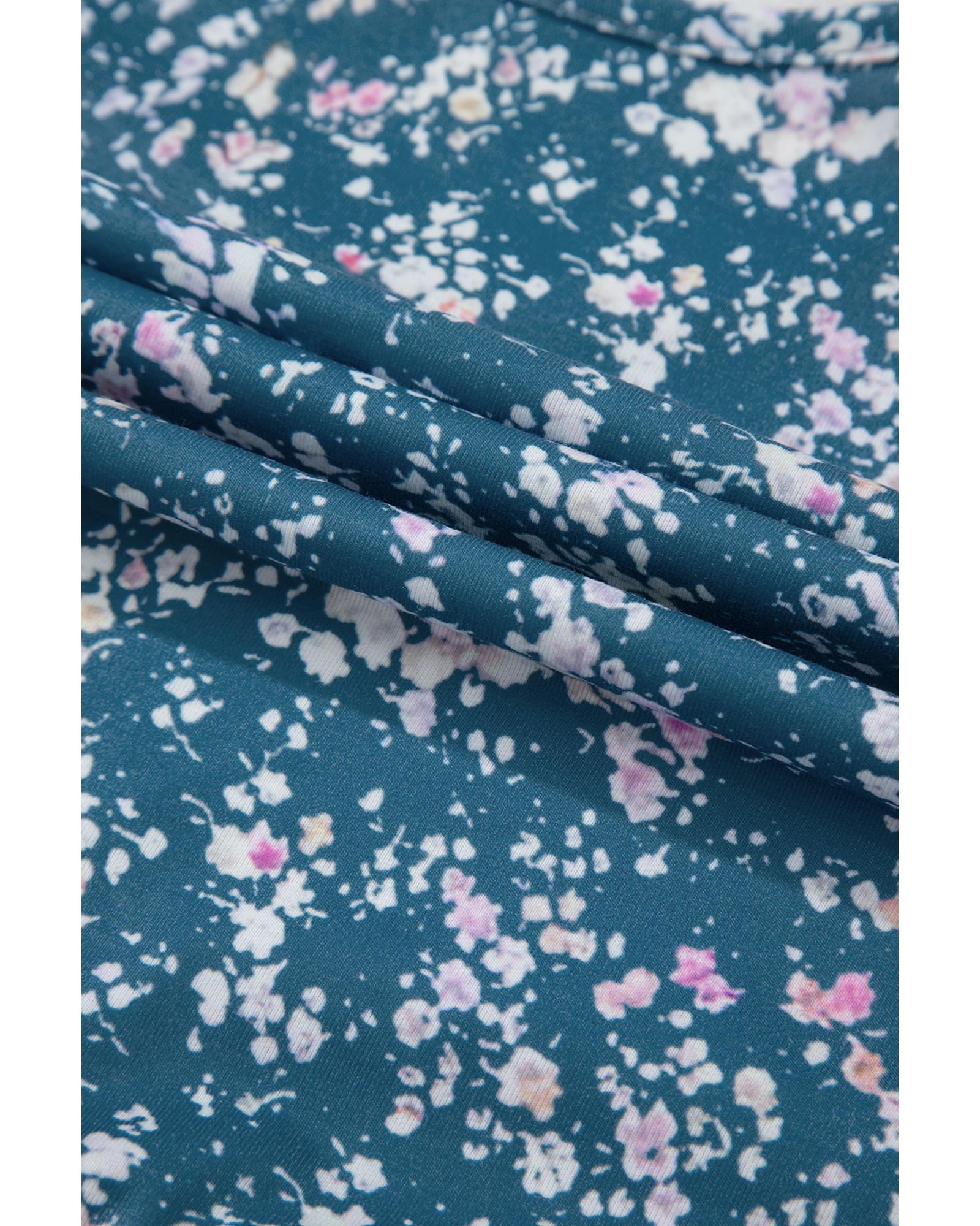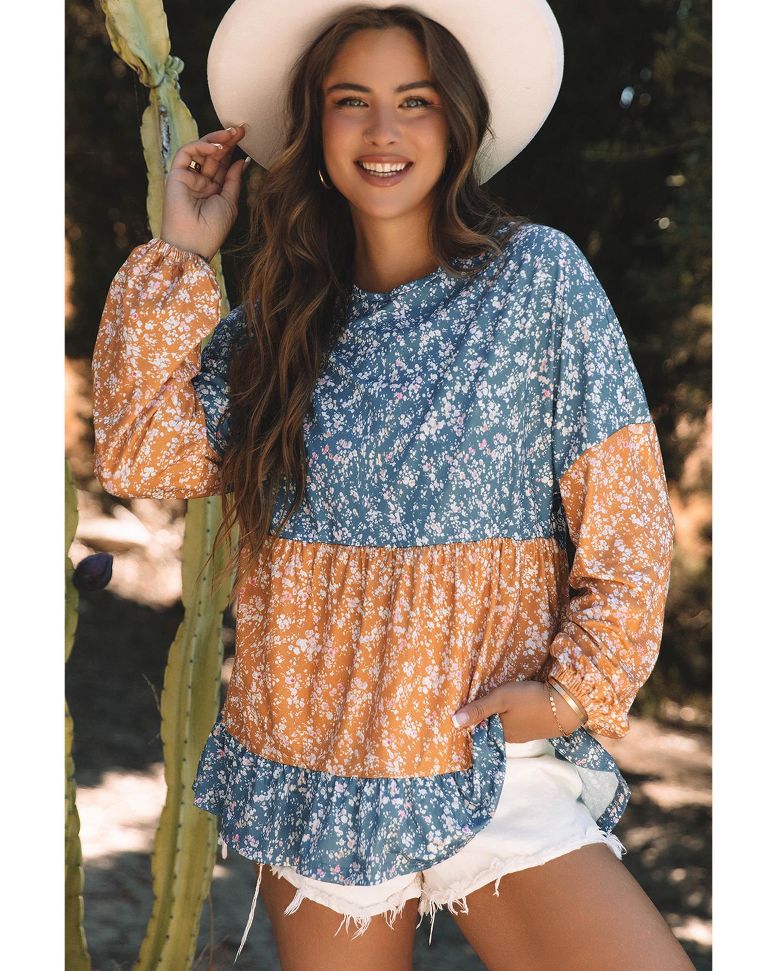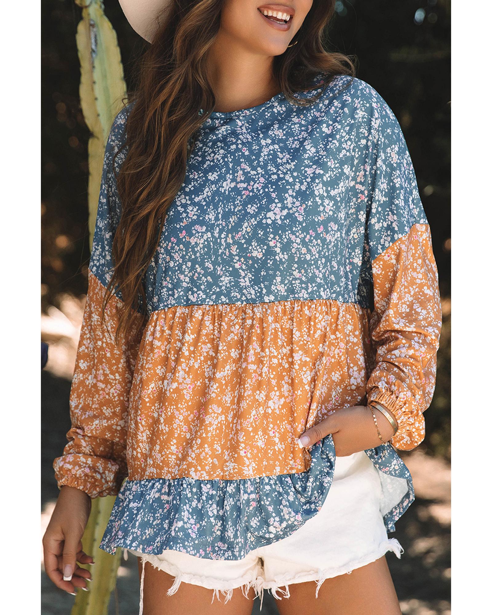 Orange Floral Color Block Patchwork Ruffled Hem Round Neck Blouse – XL