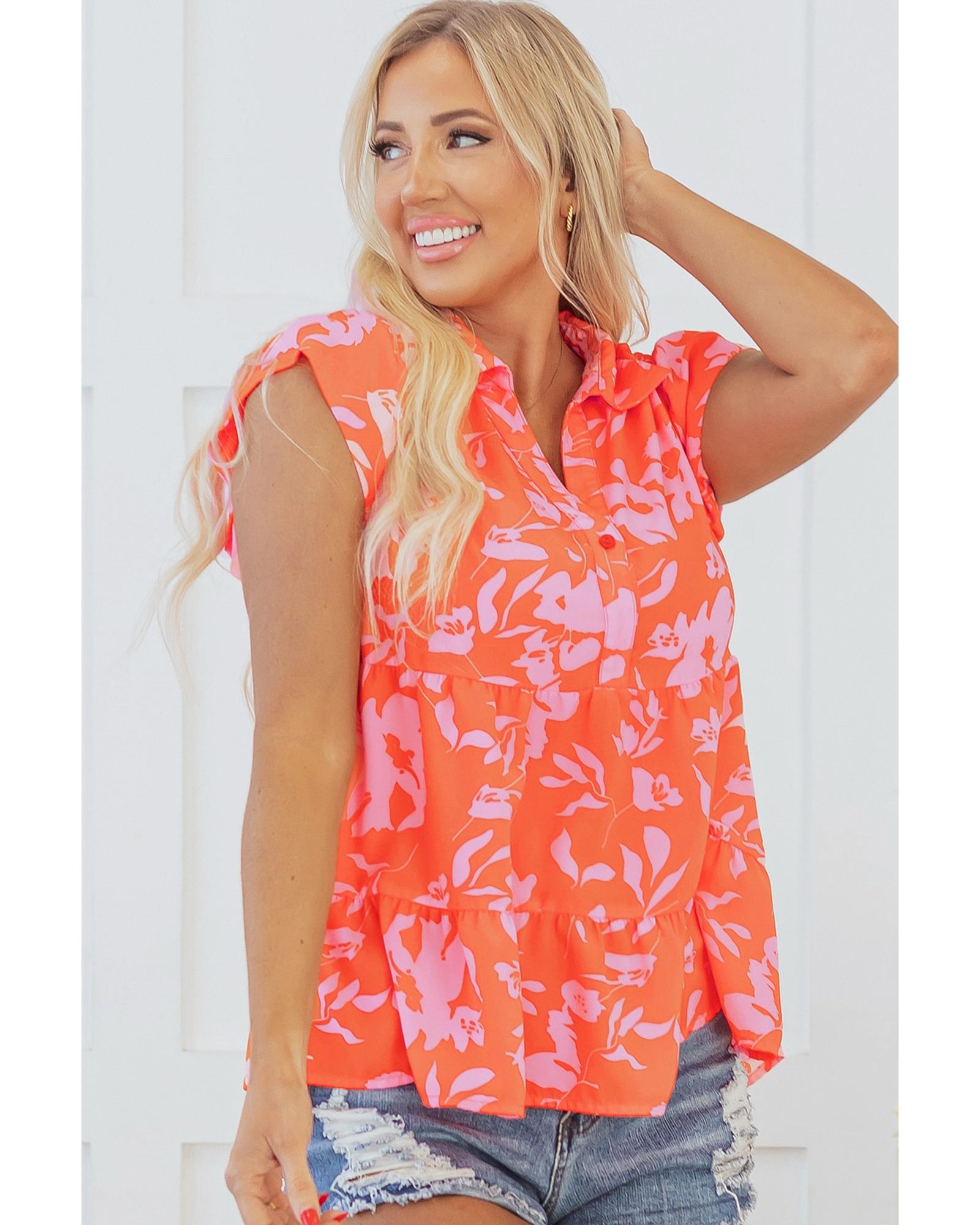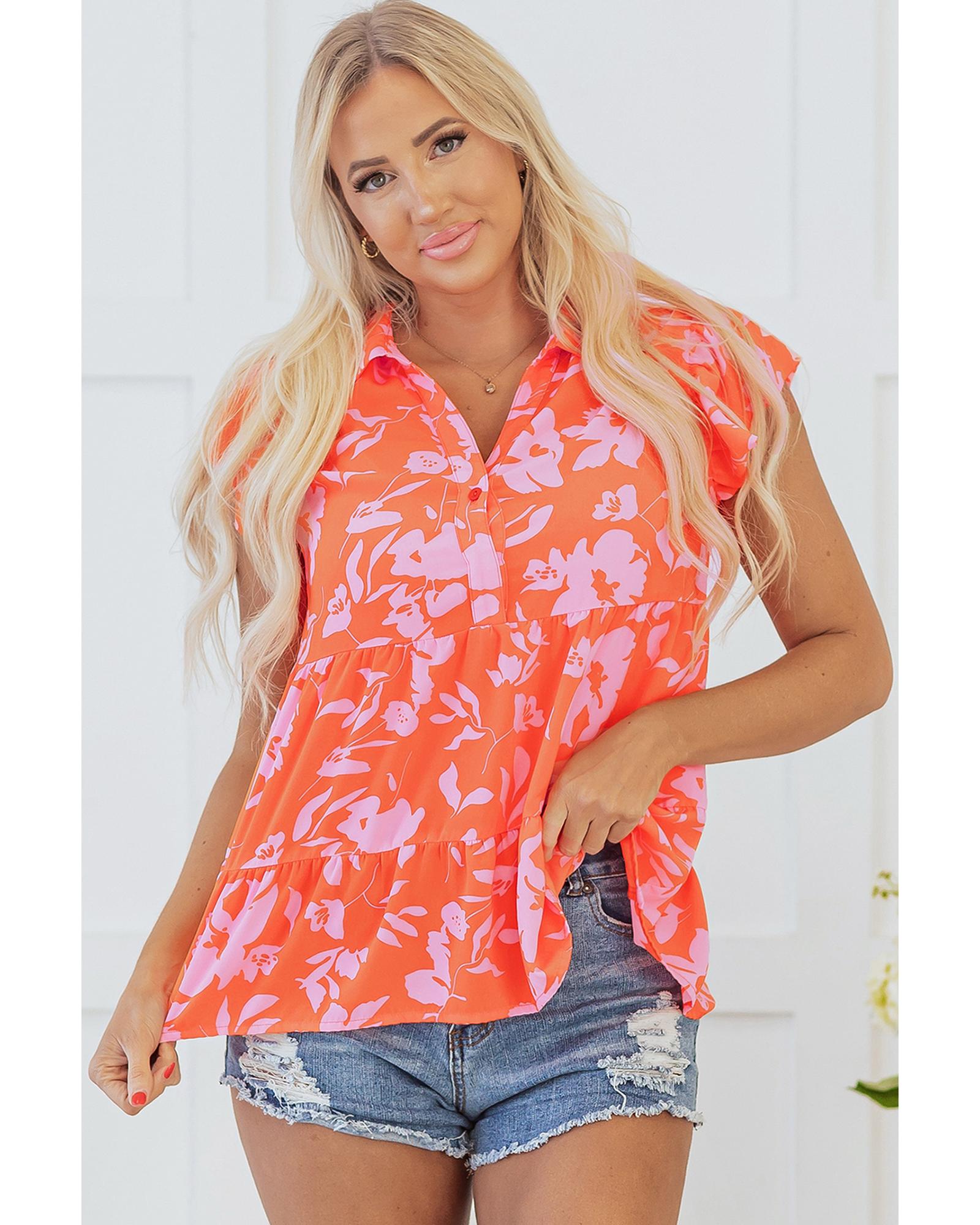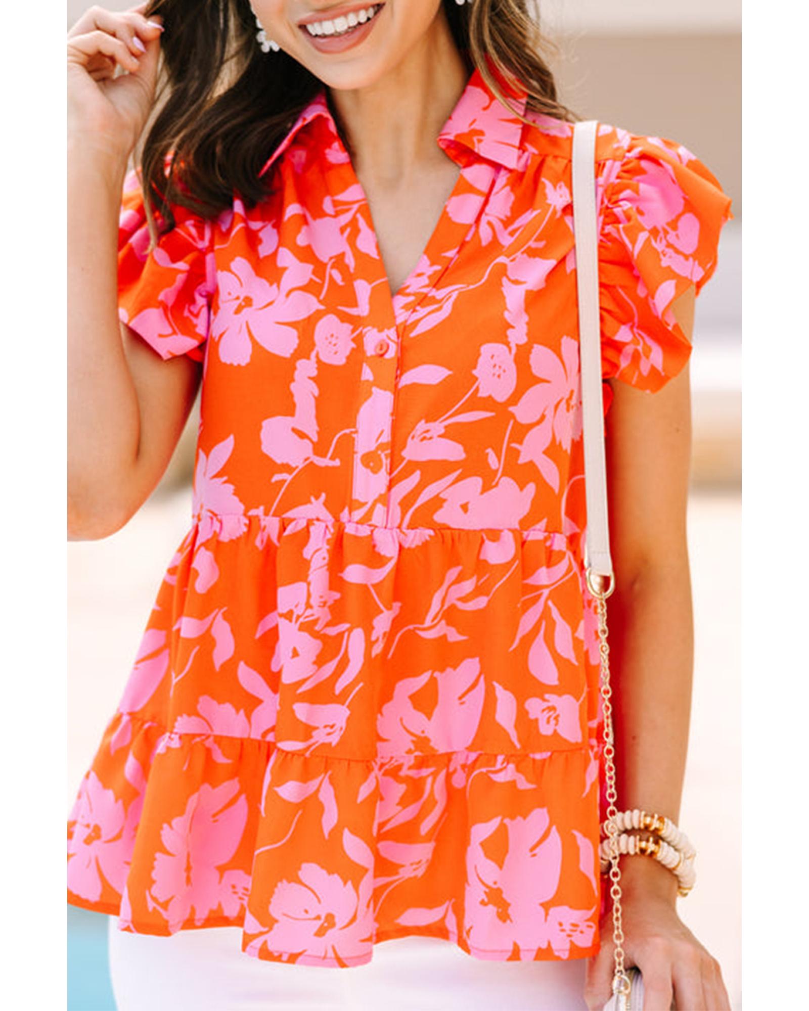 Orange Floral Print Collared Button Neckline Flutter Sleeve Blouse – S