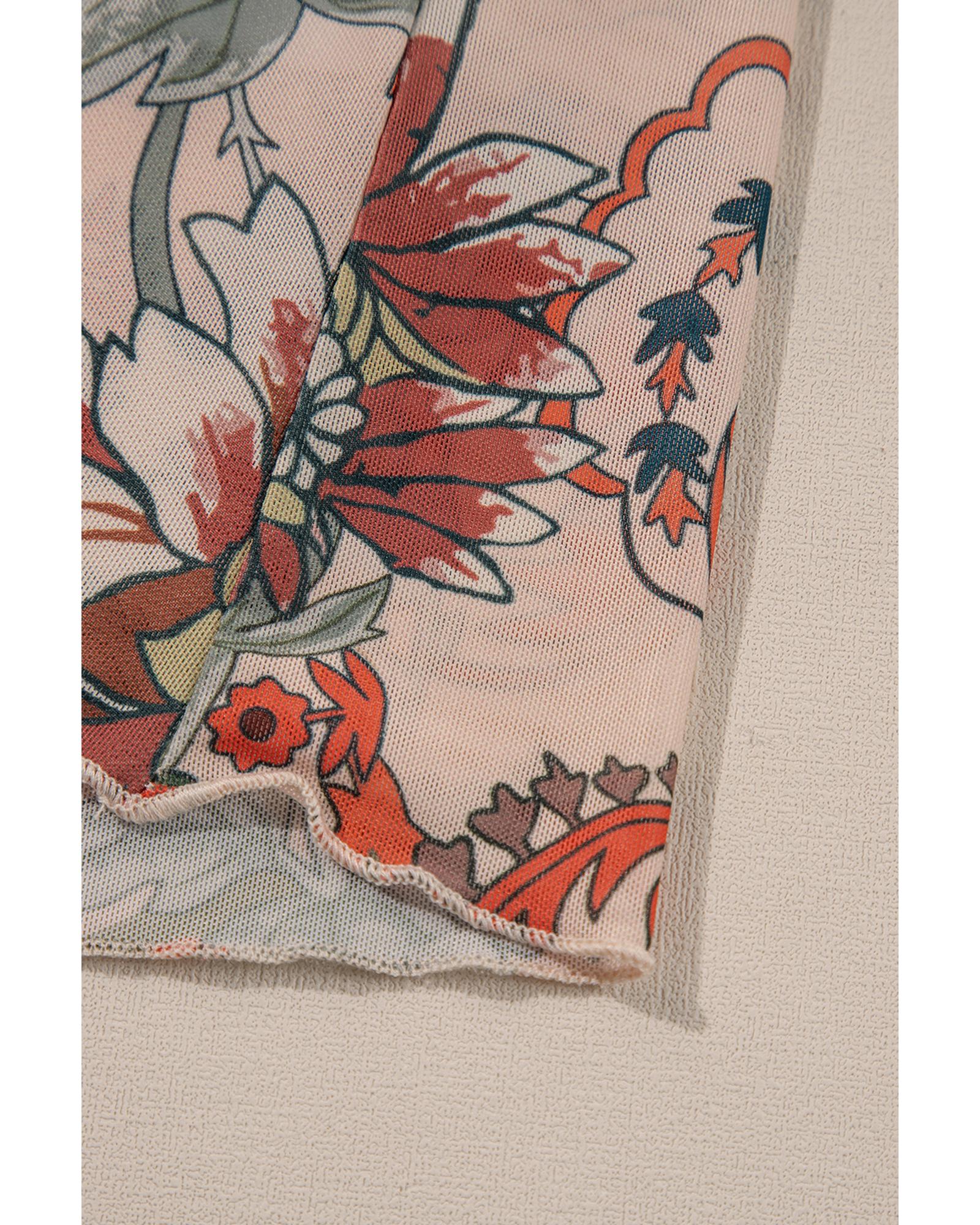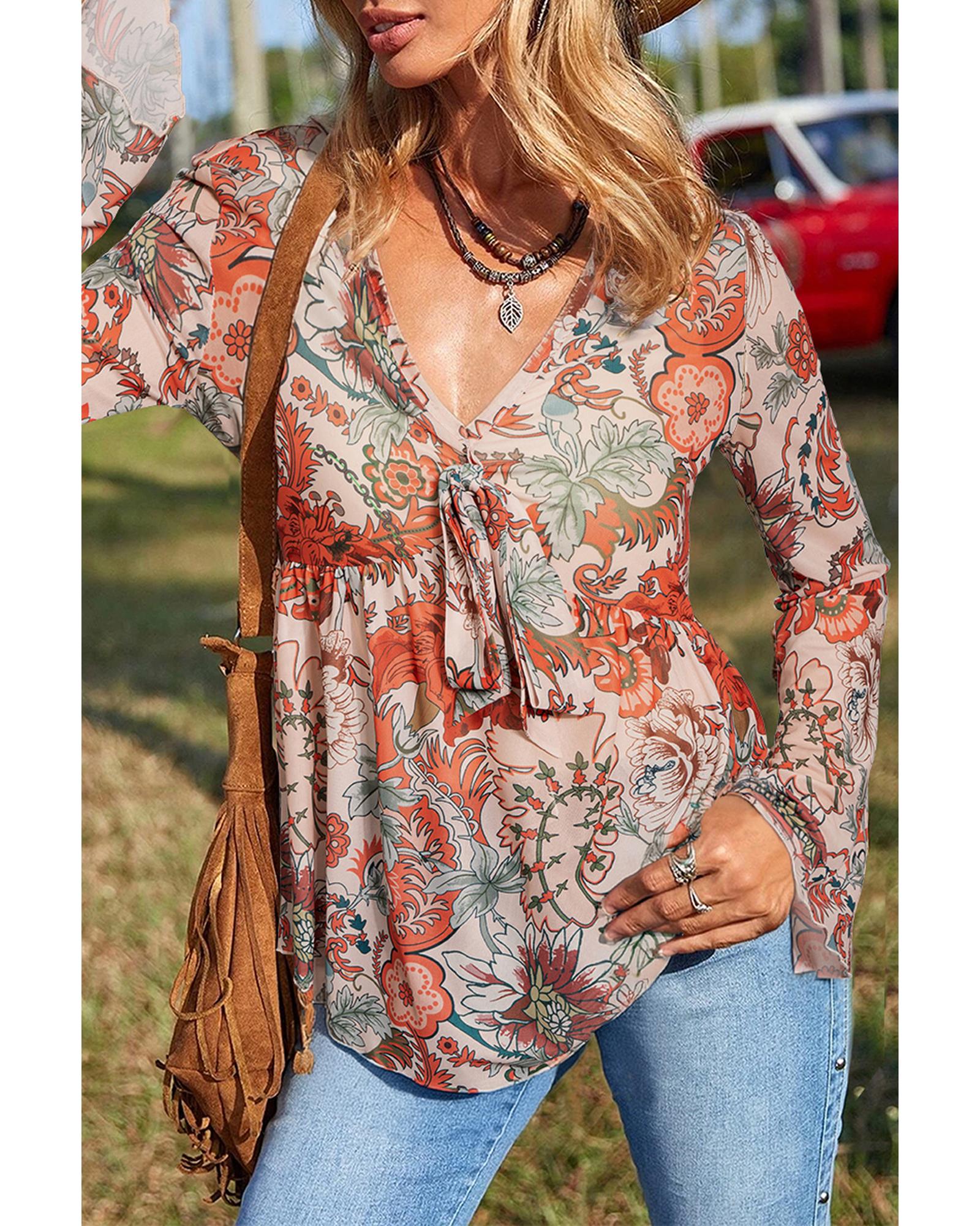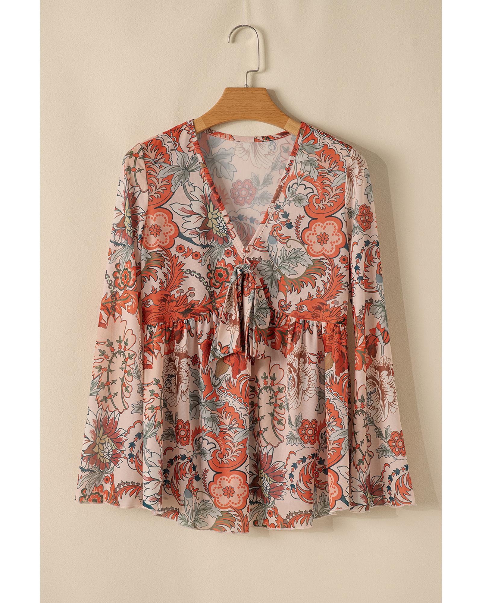 Orange Floral Print Deep V Neck Knot Bell Sleeve Blouse – L