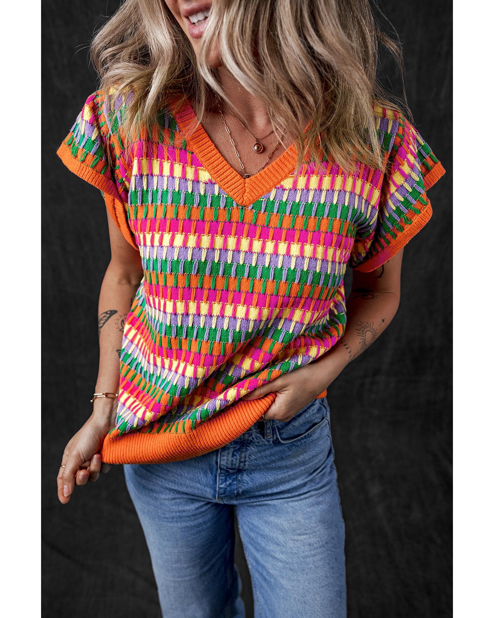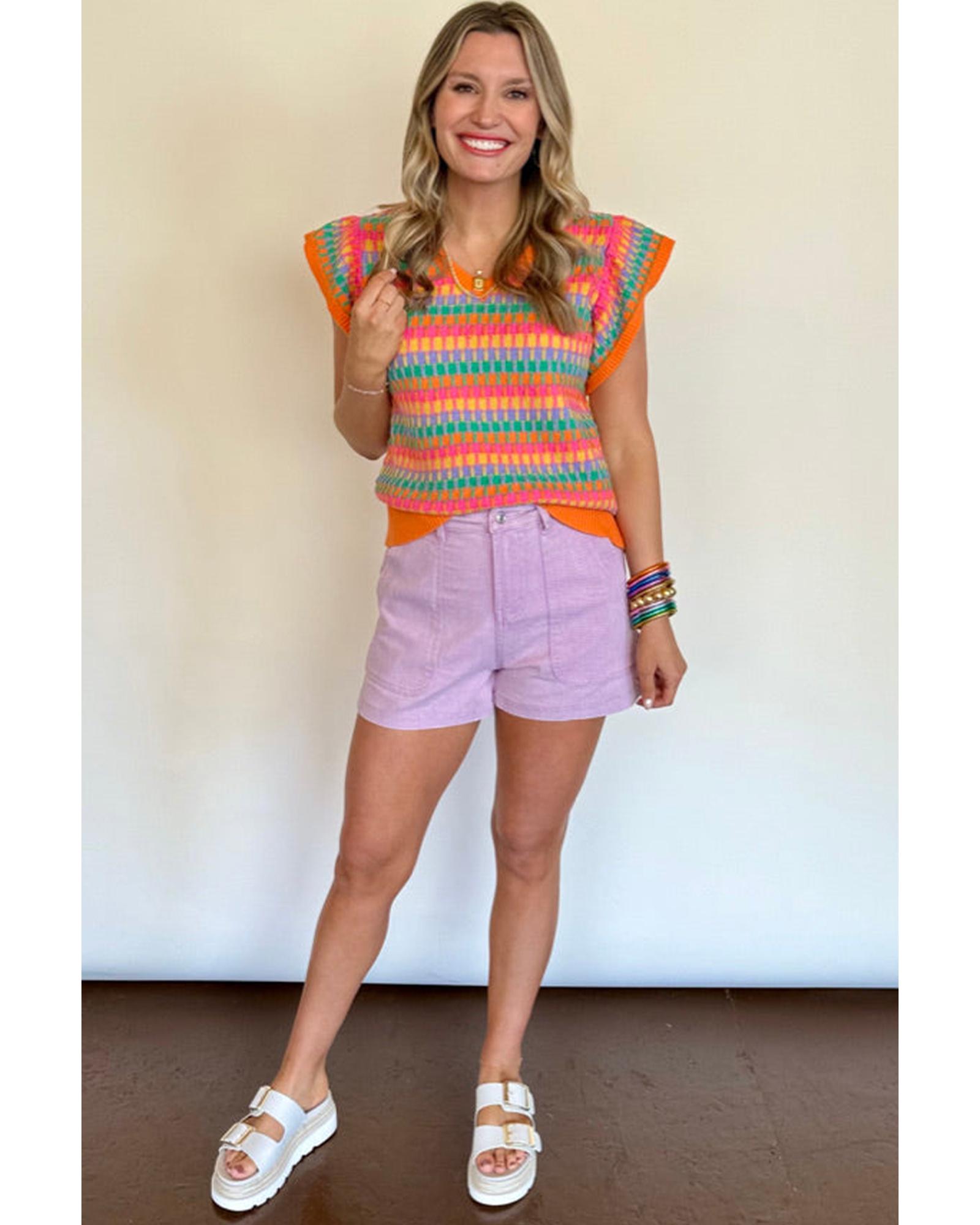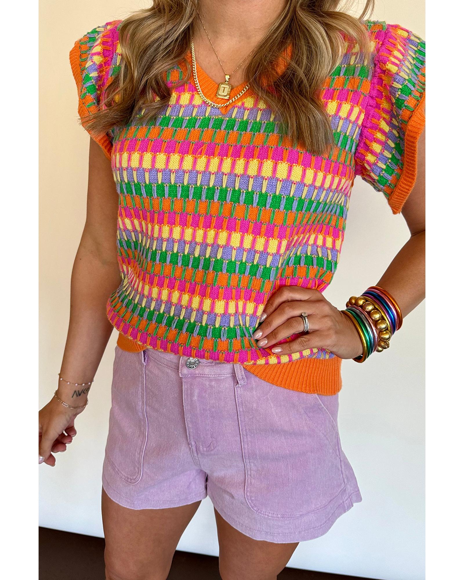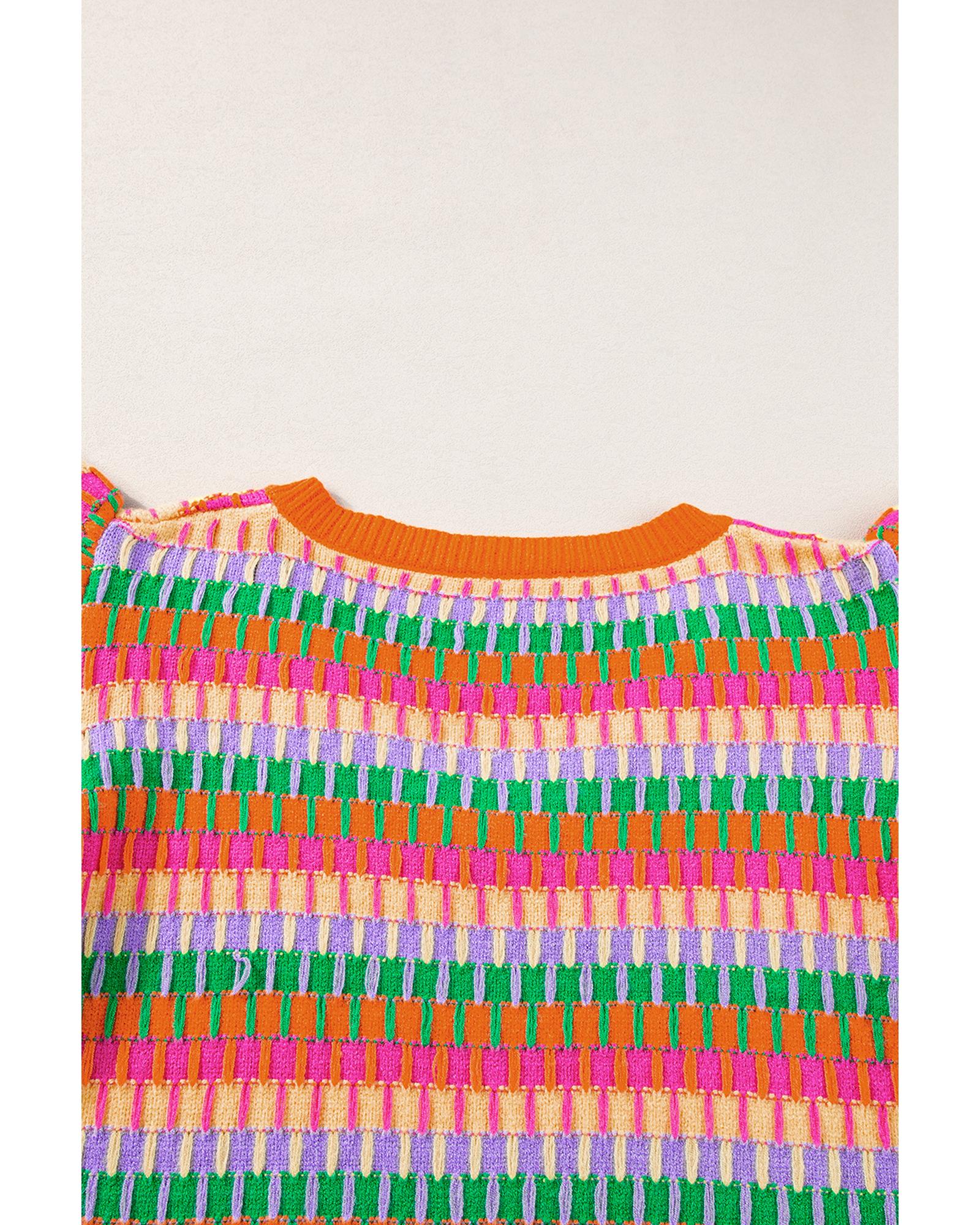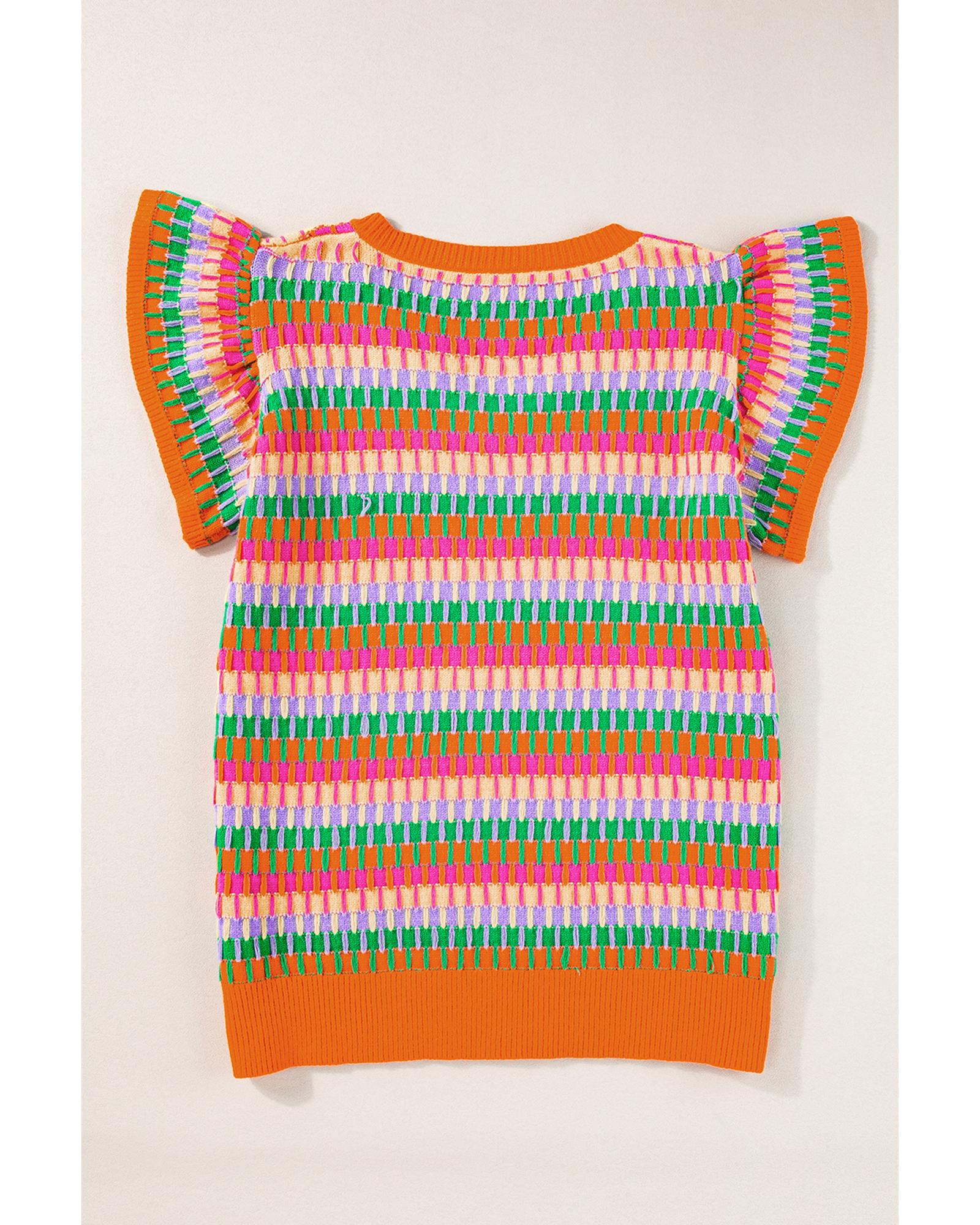 Orange Multicolor Flutter Sleeve Knitted Sweater Top – S