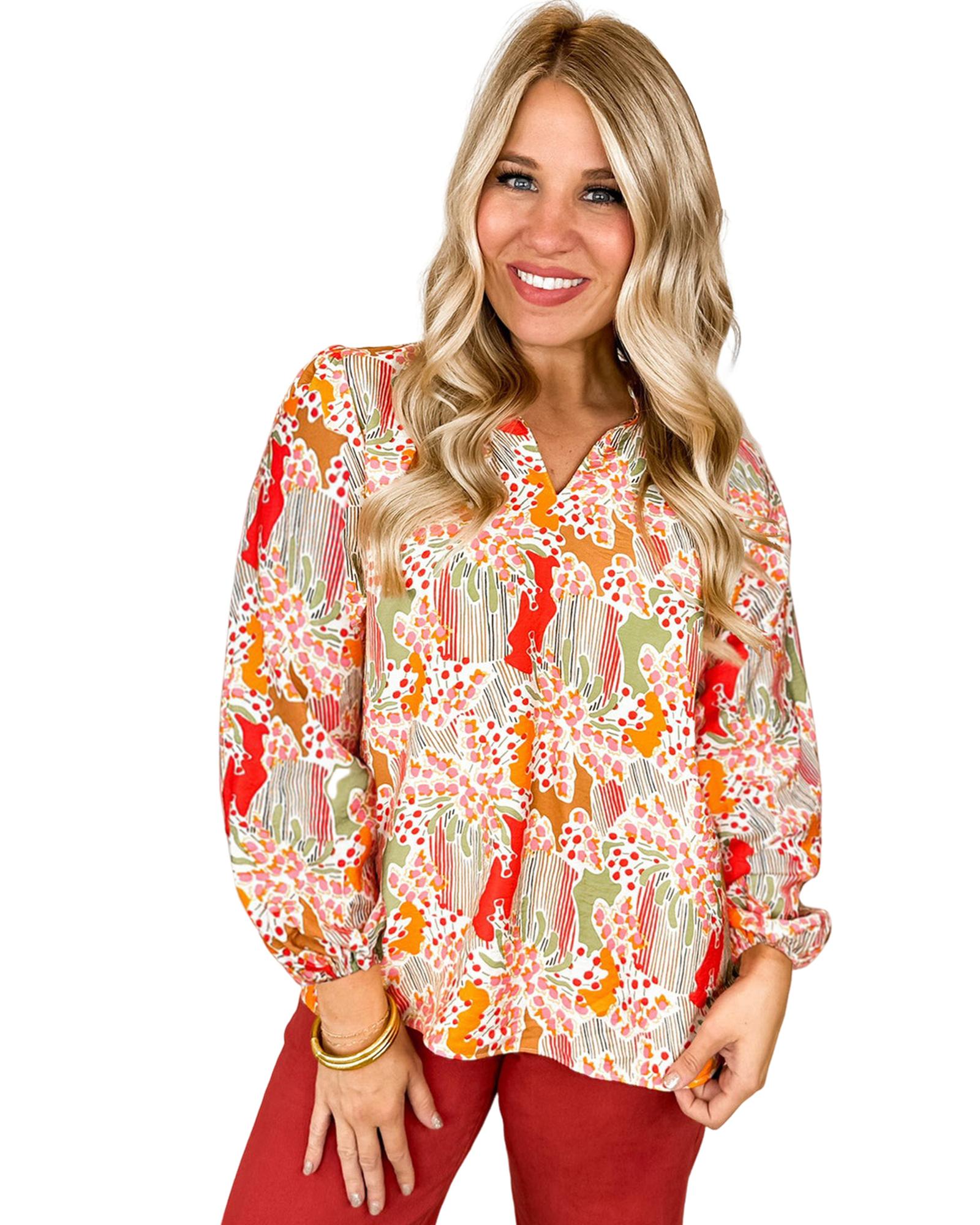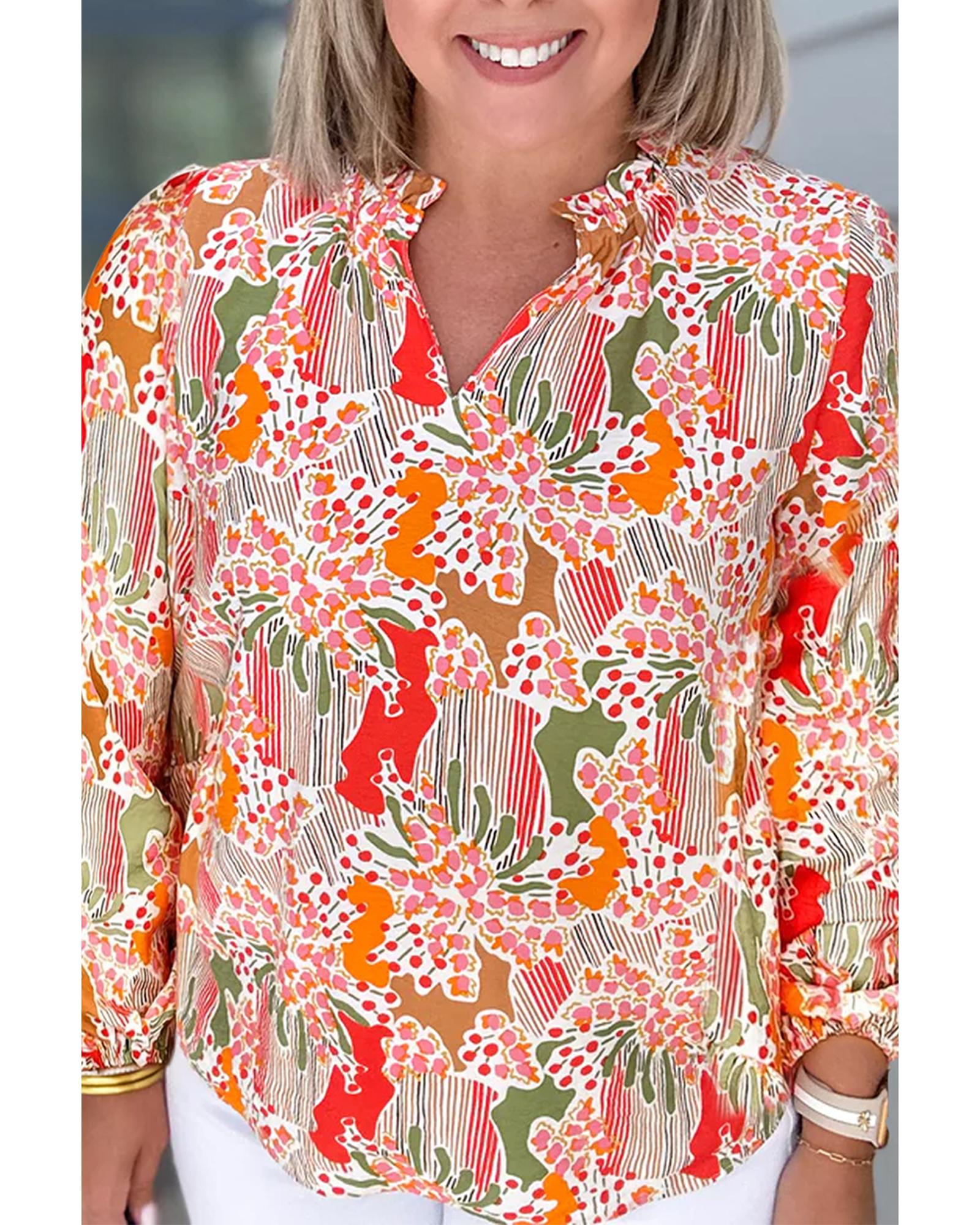 Orange Printed Floral Abstract Print Frilled V Neck Plus Size Blouse – 3X