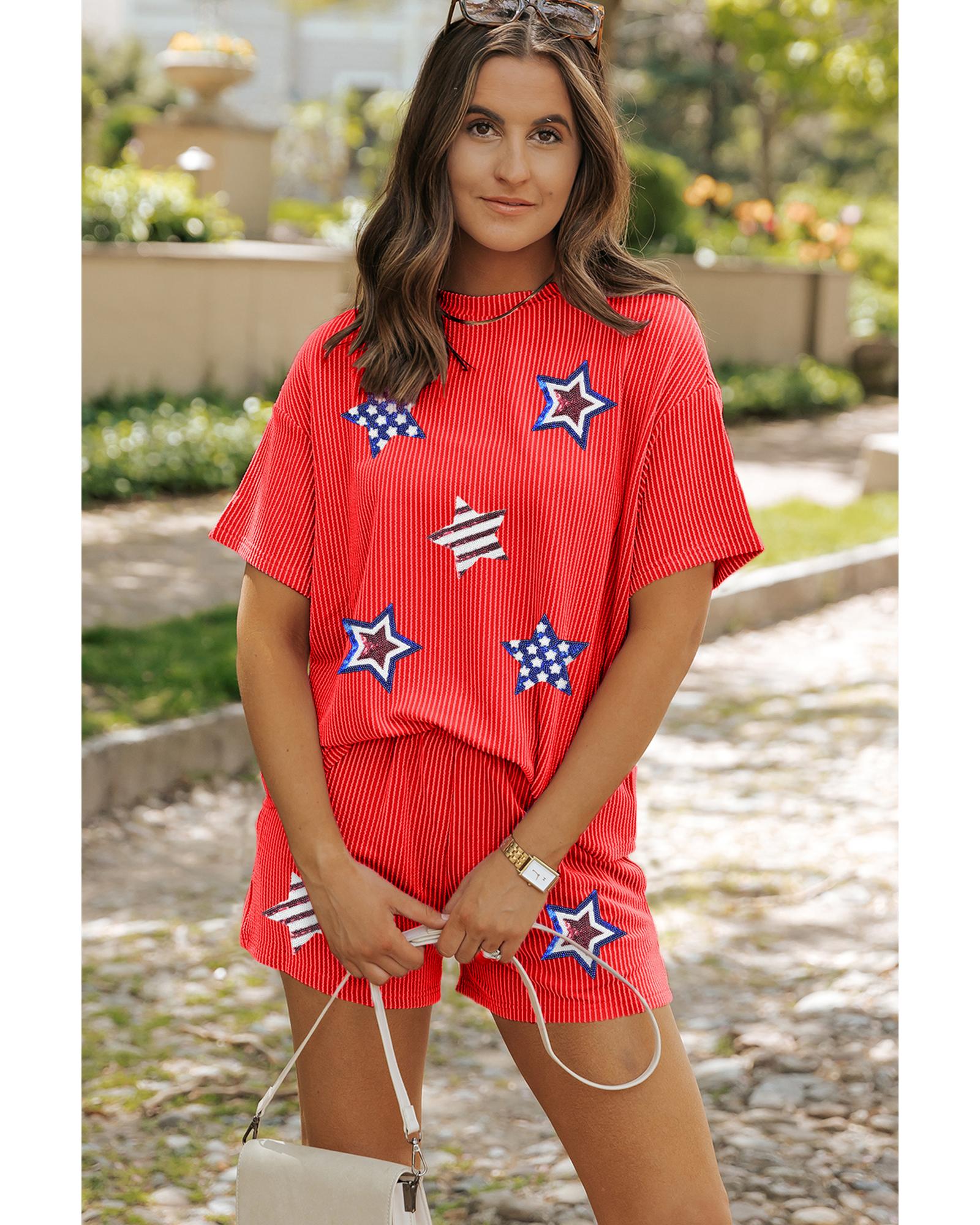 • Orange Sequin USA Flag Star Graphic Corded T Shirt and Shorts Set