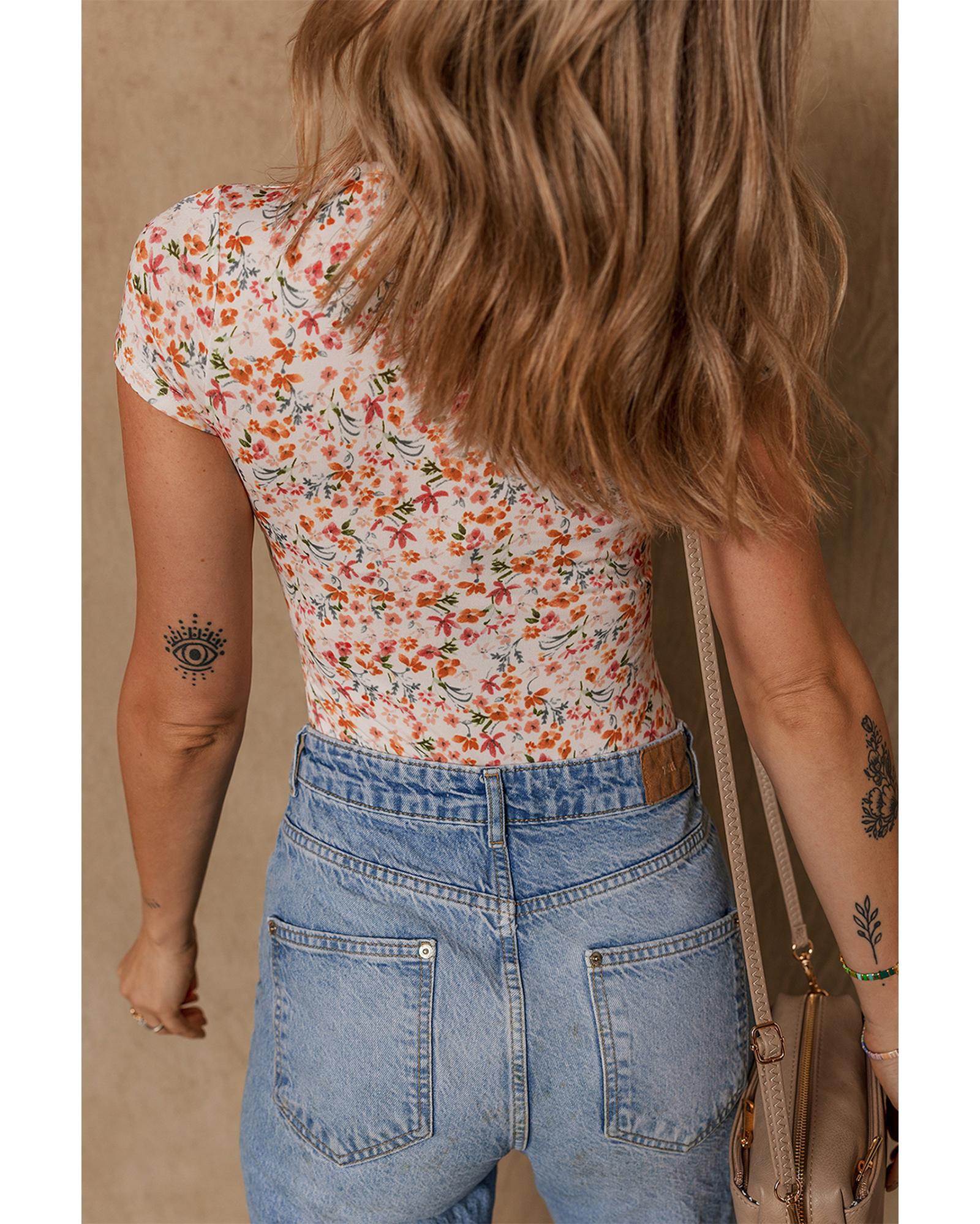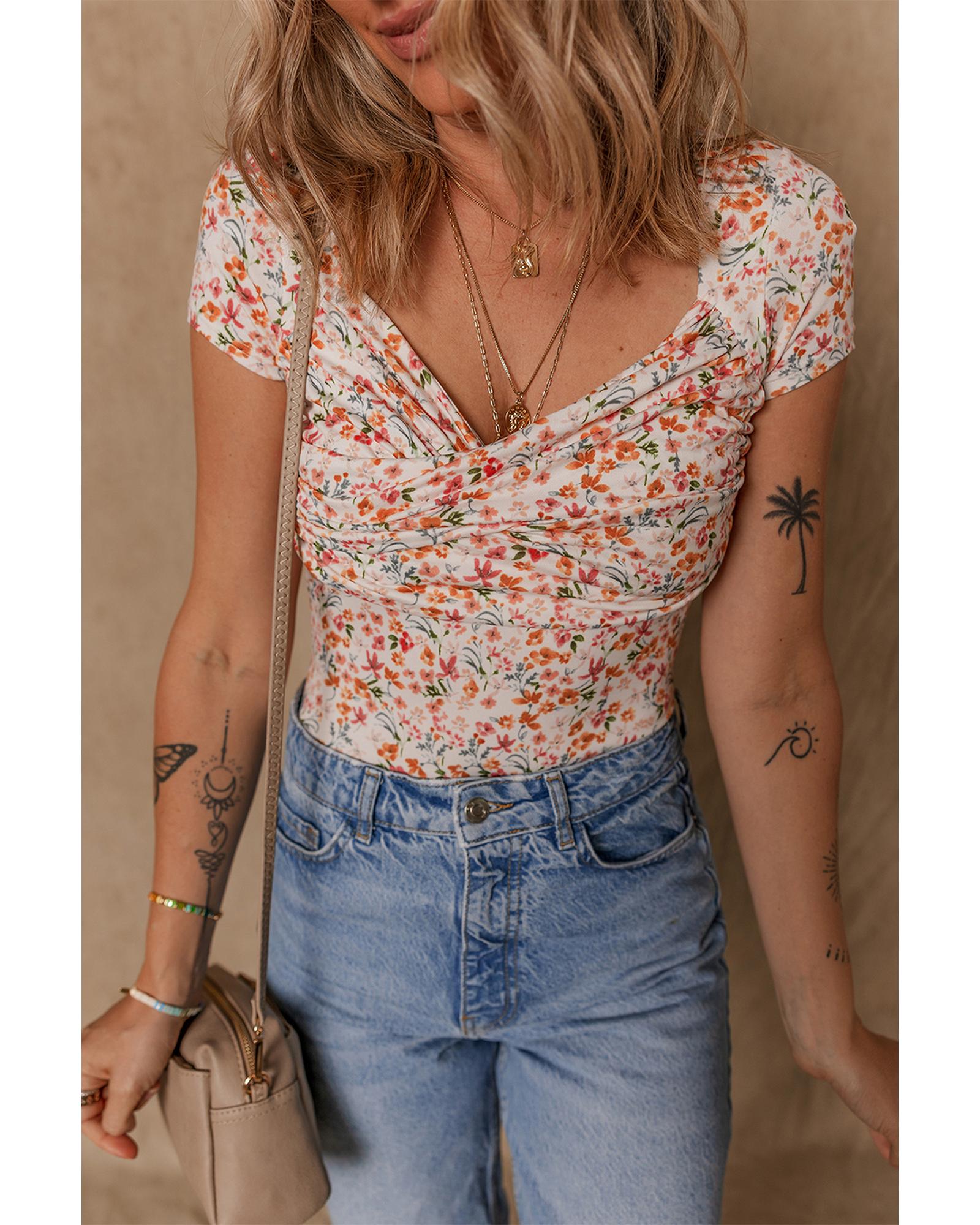 Orange Short Sleeve Floral Ruched Sweetheart Bodysuit – S