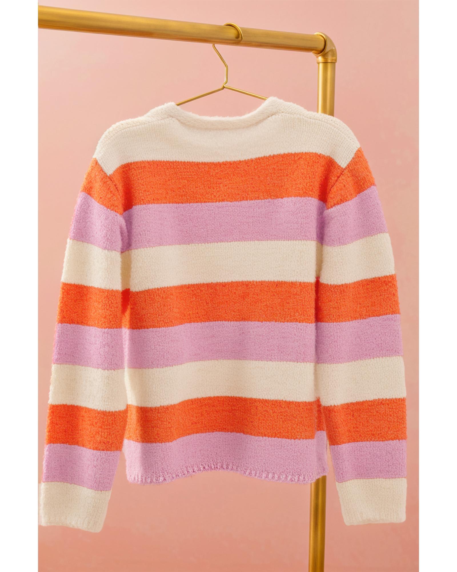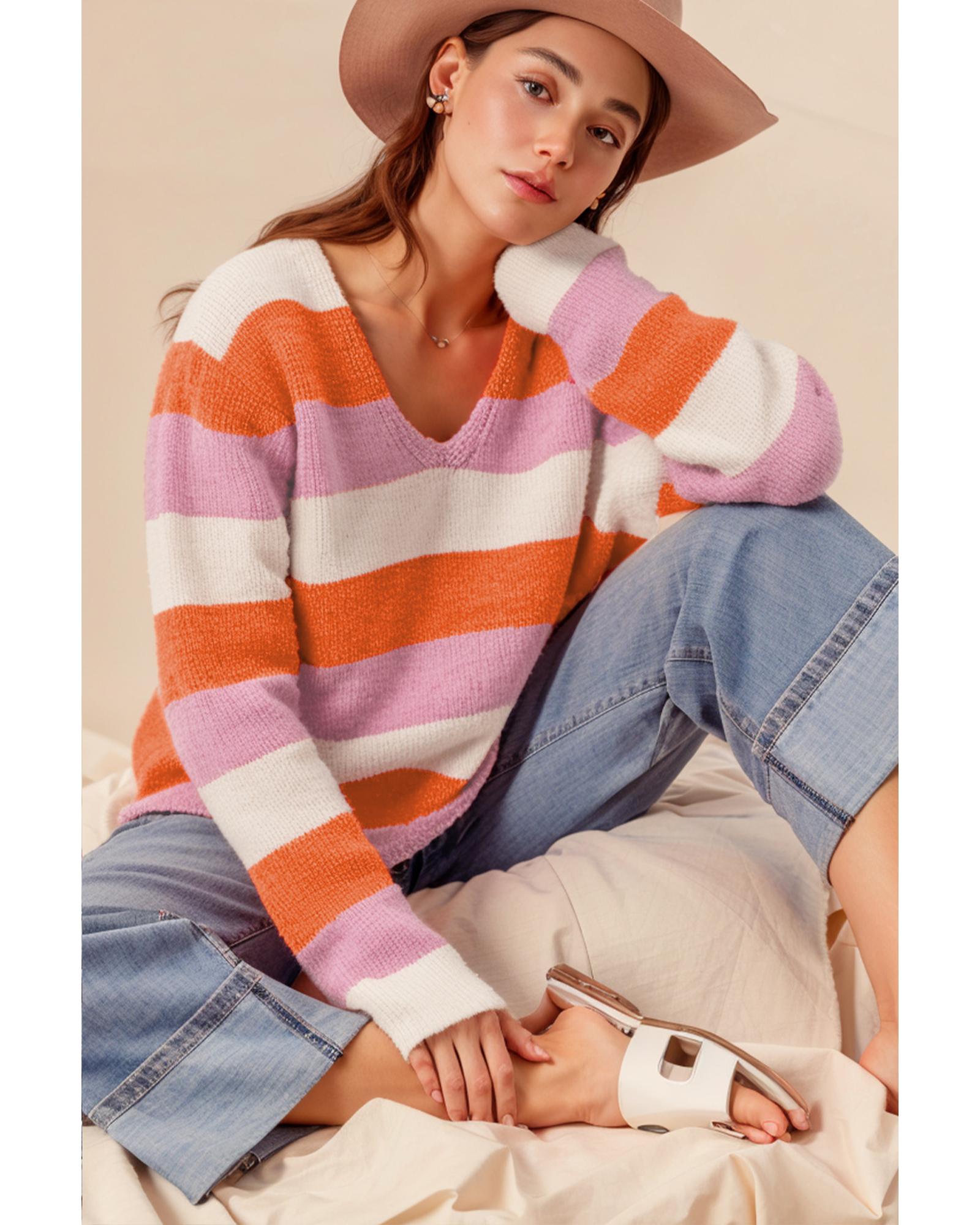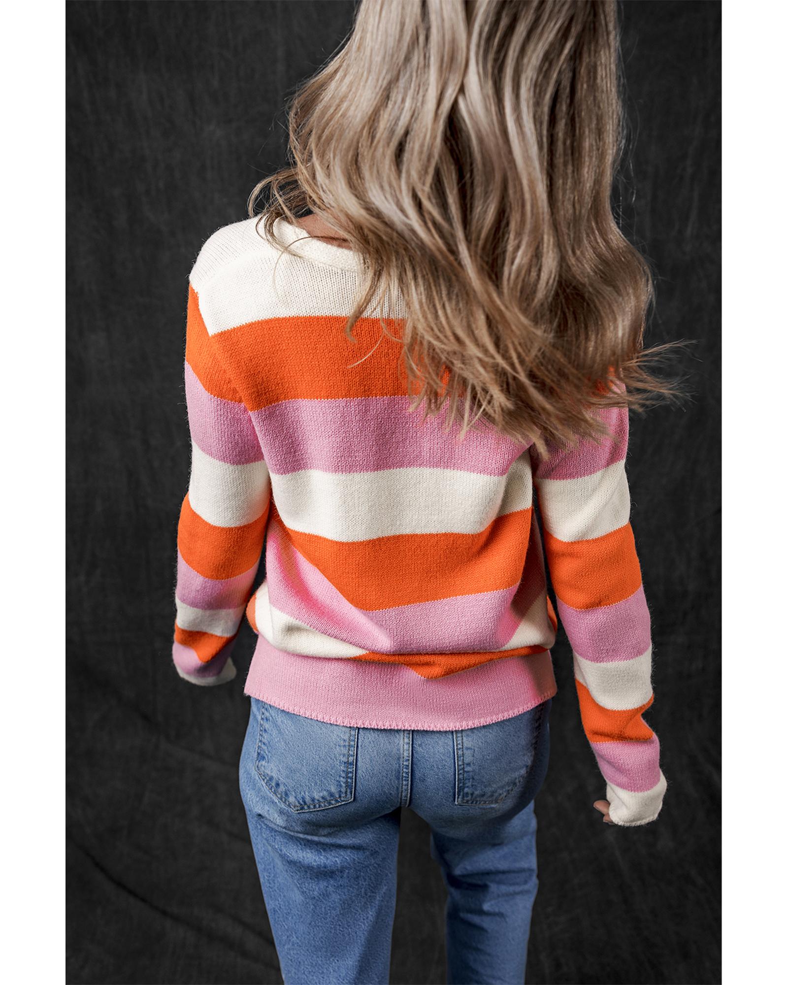 Orange Stripe Colorblock V Neck Casual Sweater – L