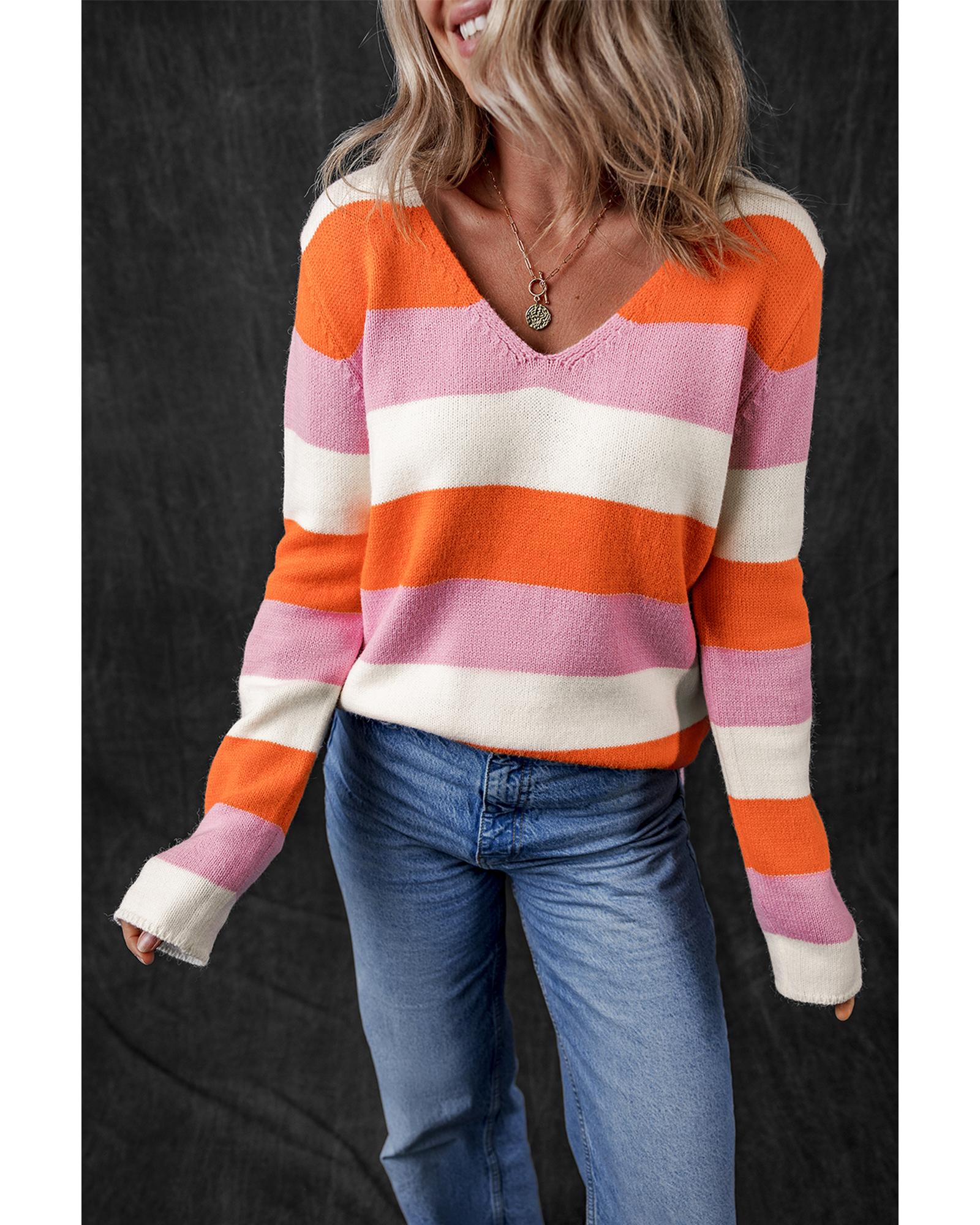 Orange Stripe Colorblock V Neck Casual Sweater – XL