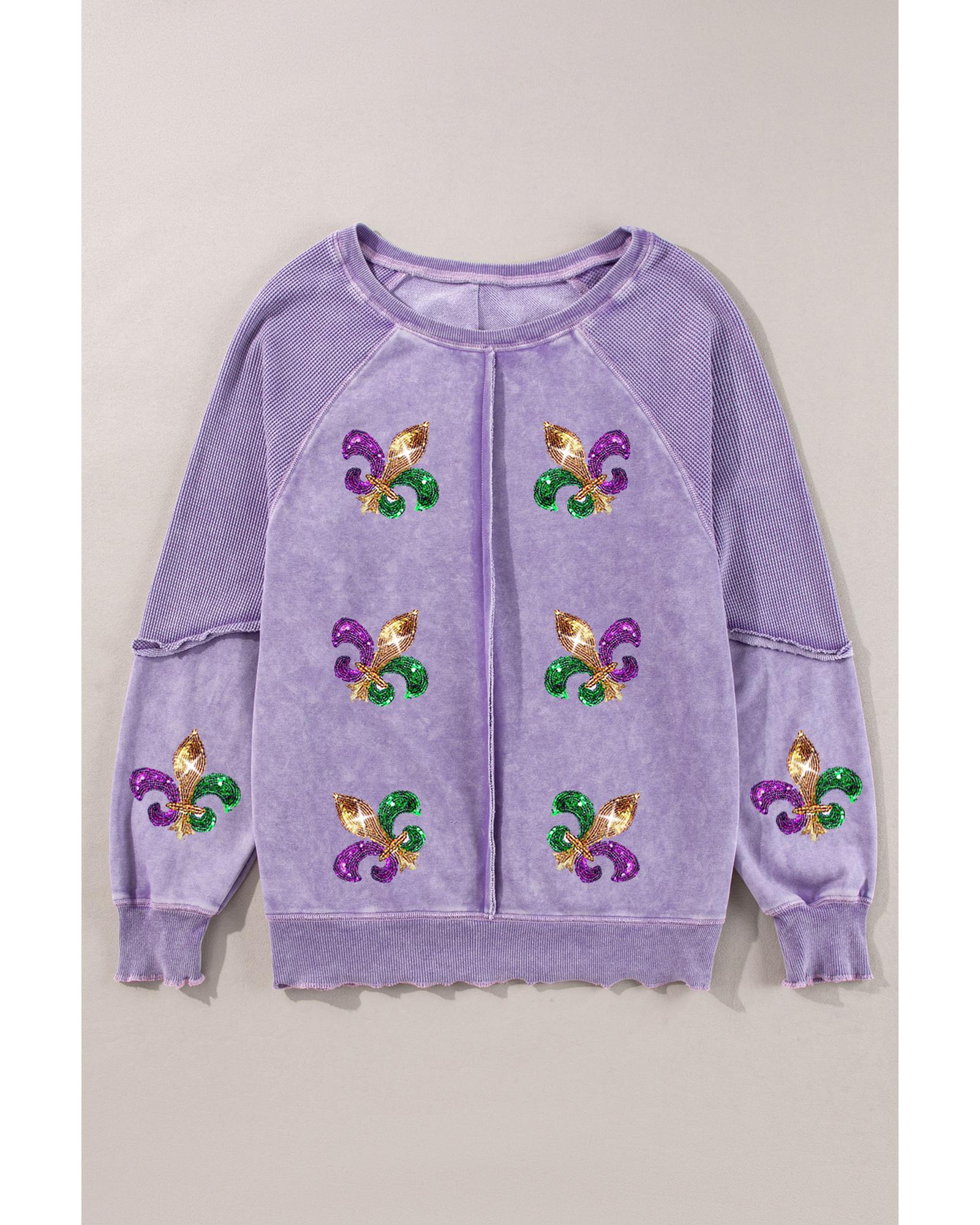 Orchid Petal Mardi Gras Patched Pattern Waffle Patchwork Sweatshirt – S
