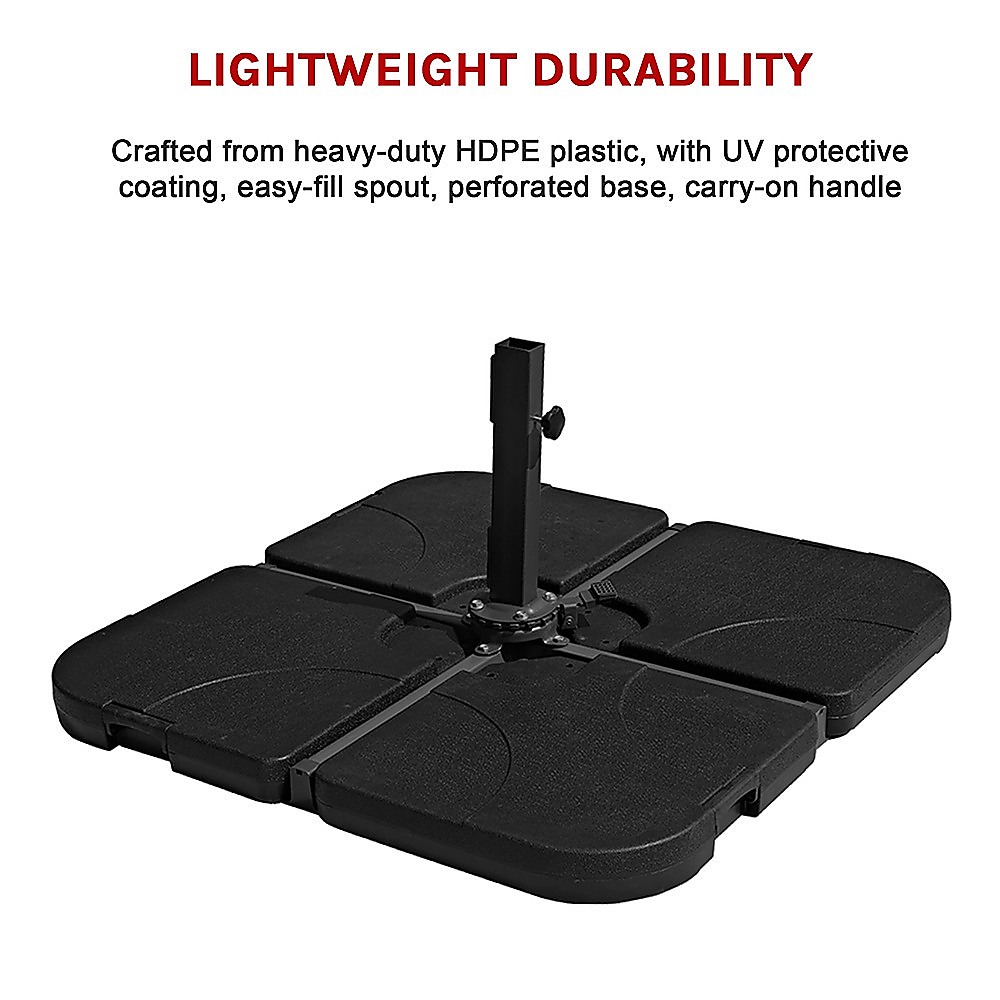 Crafted from heavy-duty HDPE with fade-resistant UV protection, this umbrella base weight is designed to last. With its four-plate construction, this base works with not only four-plate configurations but with two- and three-plate configurations as well, depending on your needs and those of your space. Each of the four parts can weigh up to 15 kilograms, giving the entire base a hefty 60.6 kilograms of support for your umbrella.