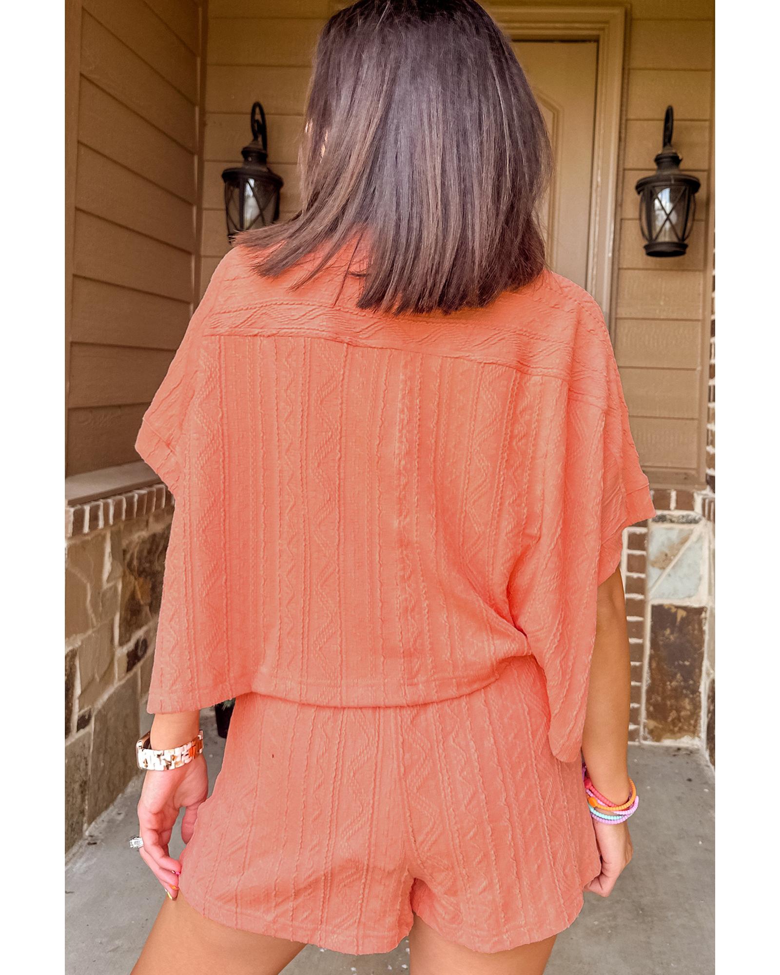 Pale Chestnut Textured Patched Pocket Short Sleeve Top Drawstring Shorts Set - M