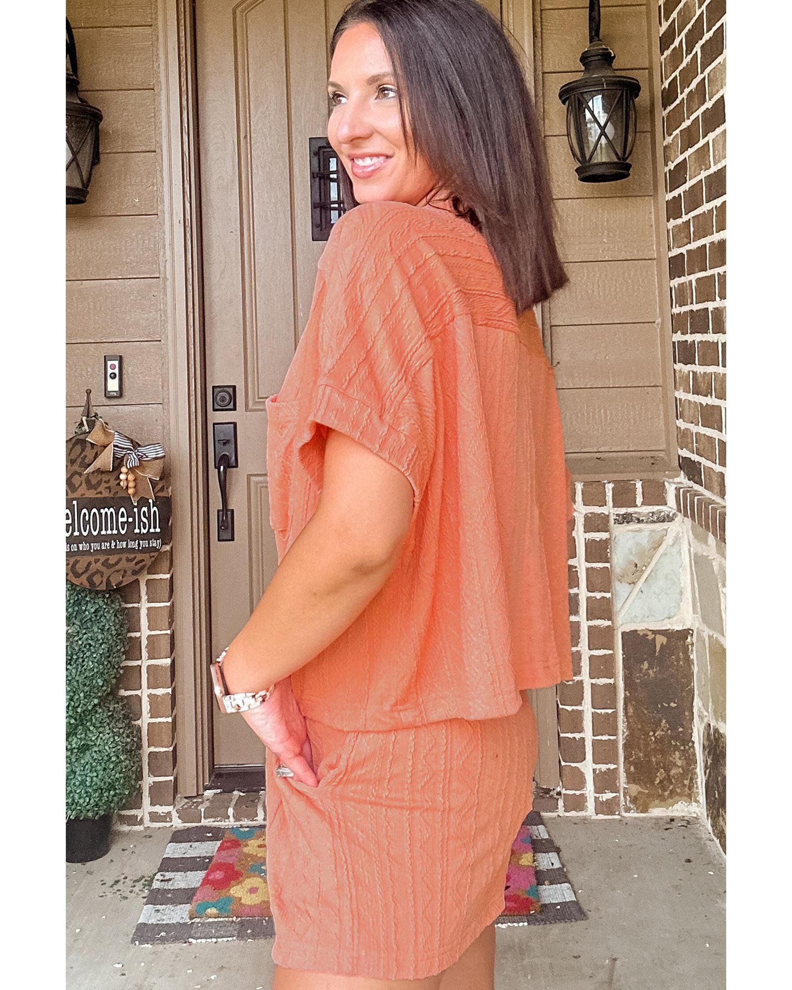 Pale Chestnut Textured Patched Pocket Short Sleeve Top Drawstring Shorts Set - S