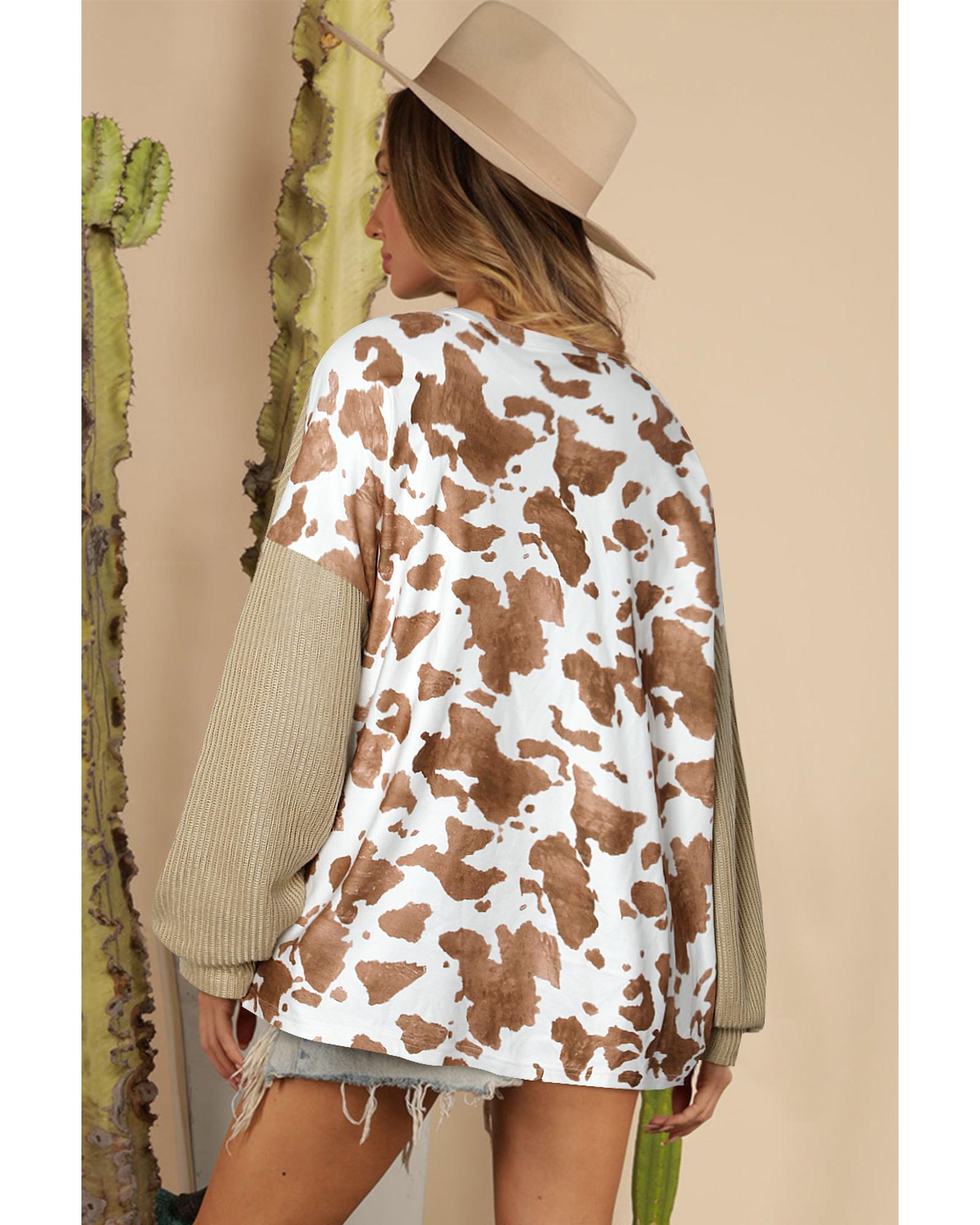 Pale Khaki Animal Print Textured Patch Lantern Sleeve Henley Blouse – L