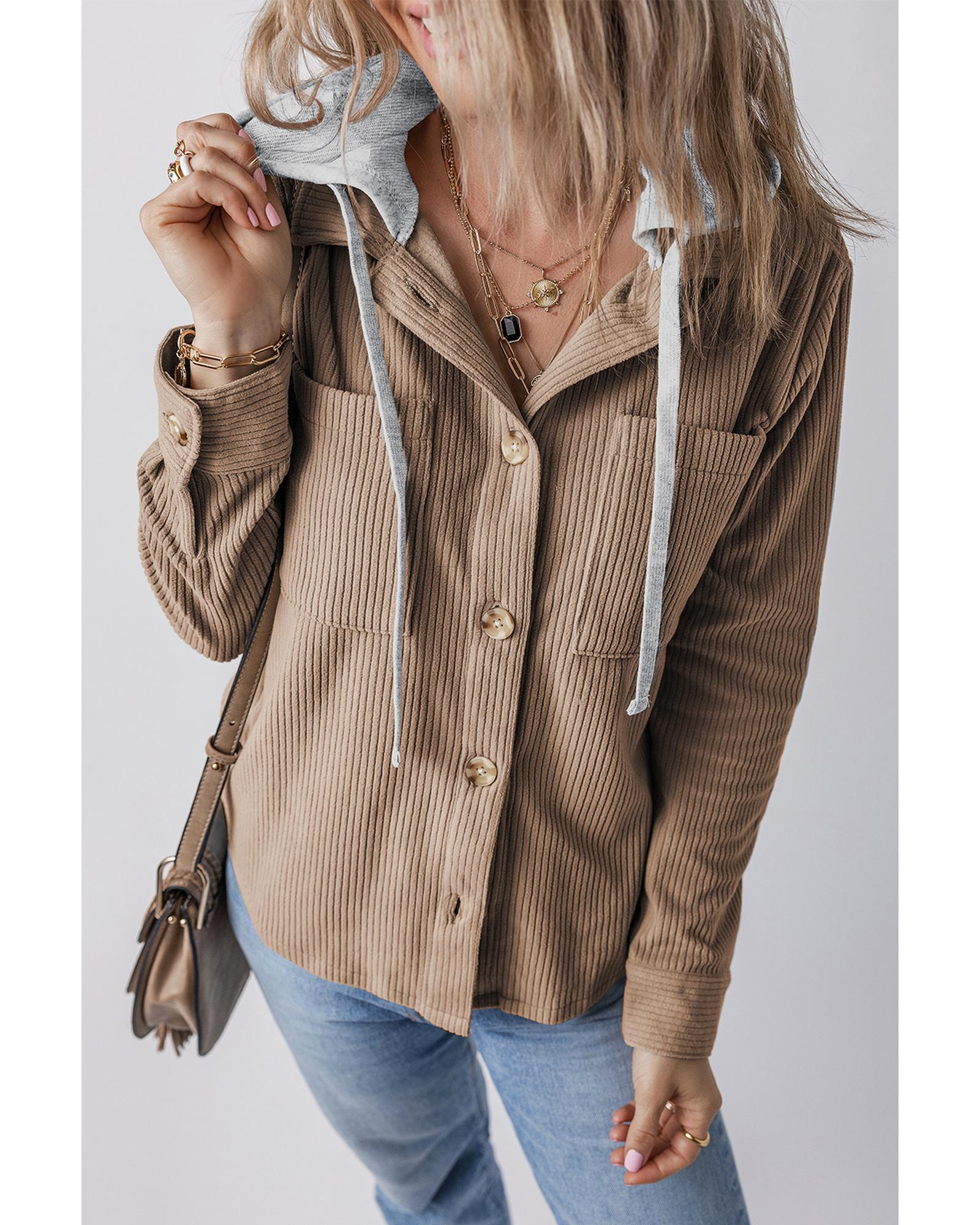 Pale Khaki Hooded Drawstring Pockets Corduroy Shacket - L