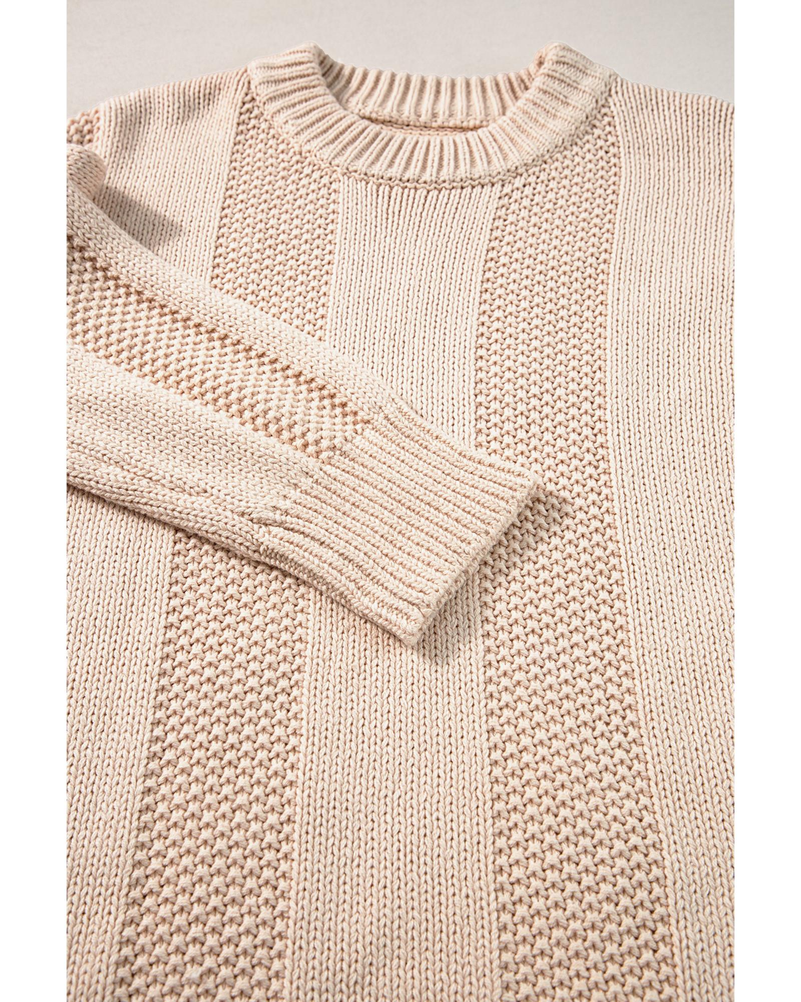 Pale Khaki Solid Color Cable Knit Ribbed Loose Sweater – L