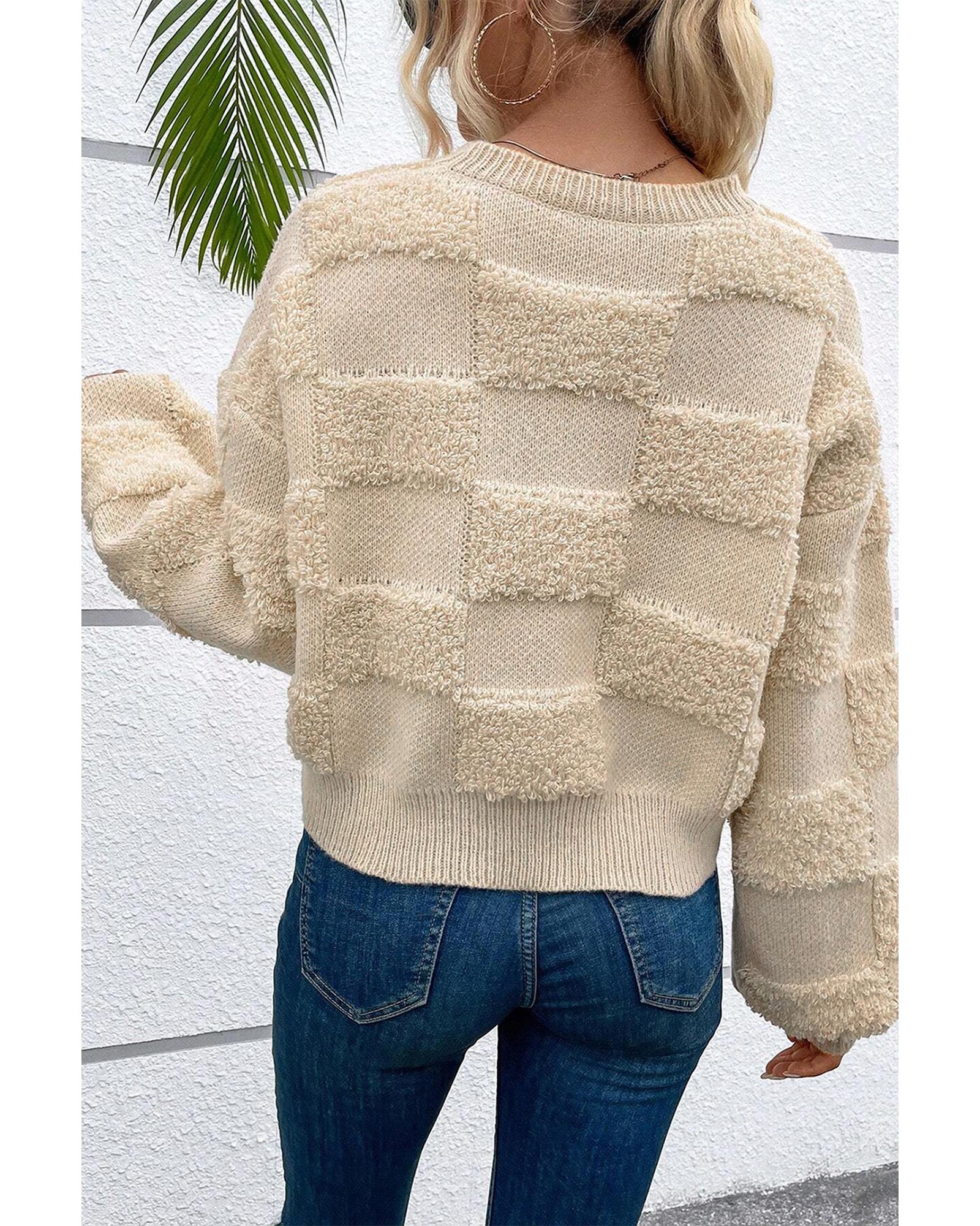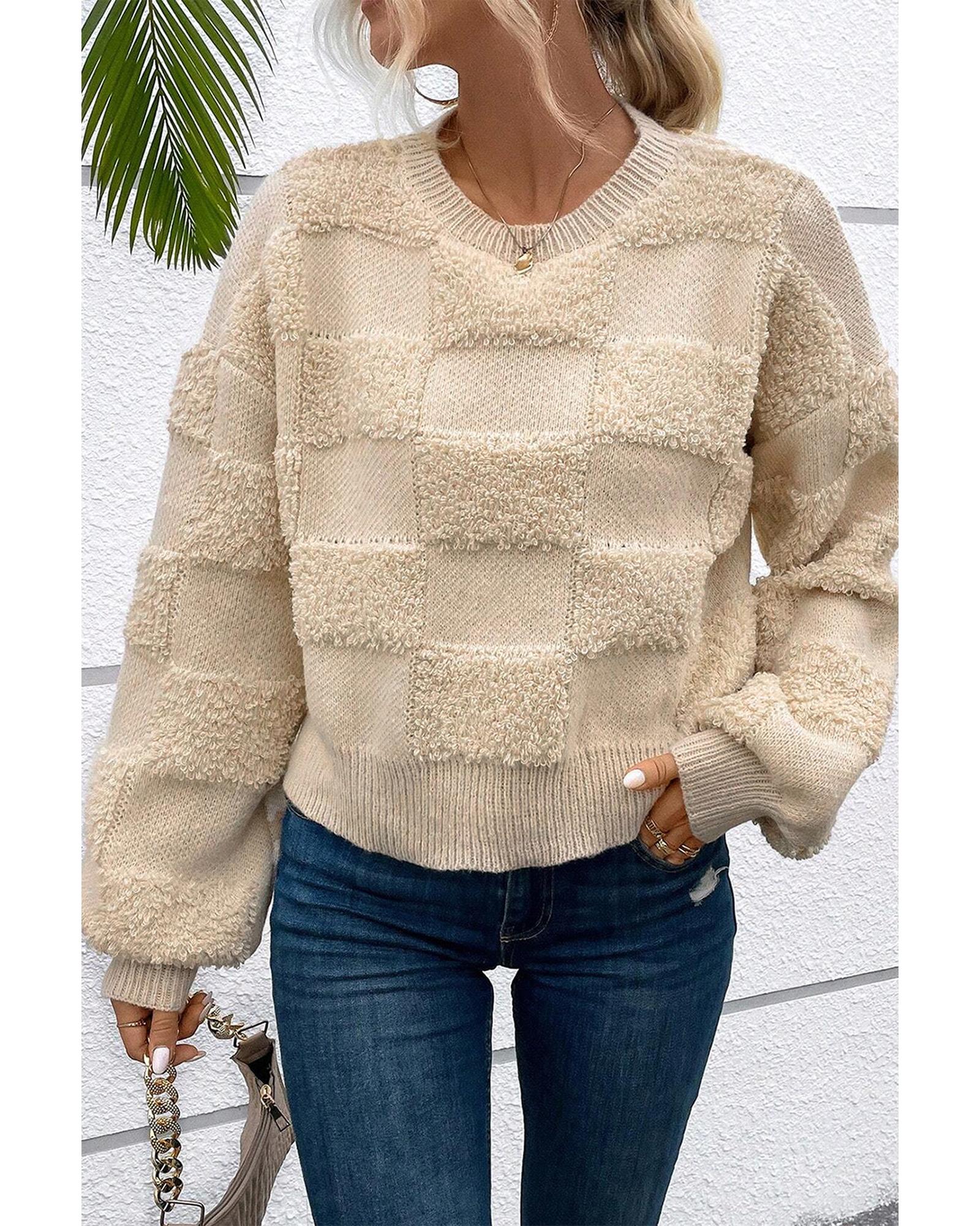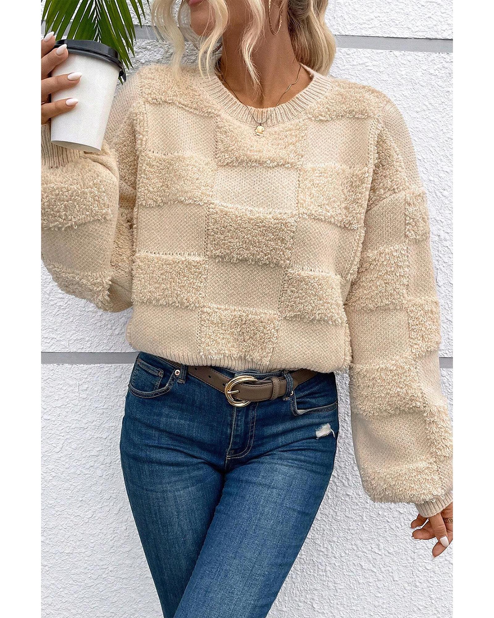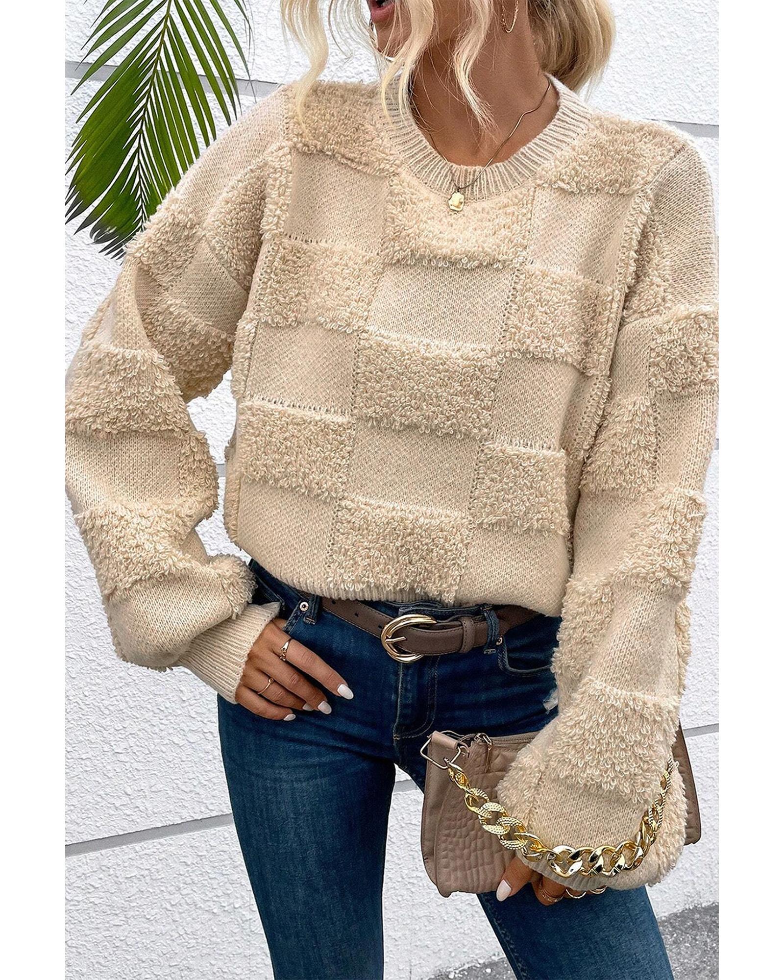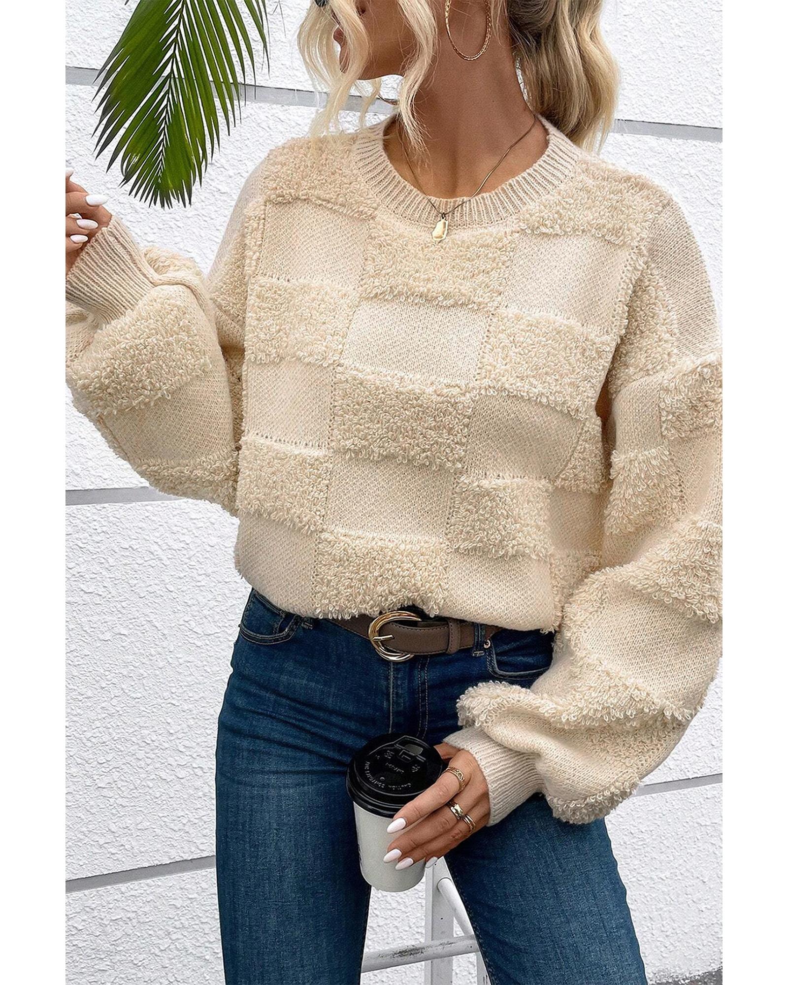 • Parchment Checkered Sherpa Crew Neck Loose Sweater