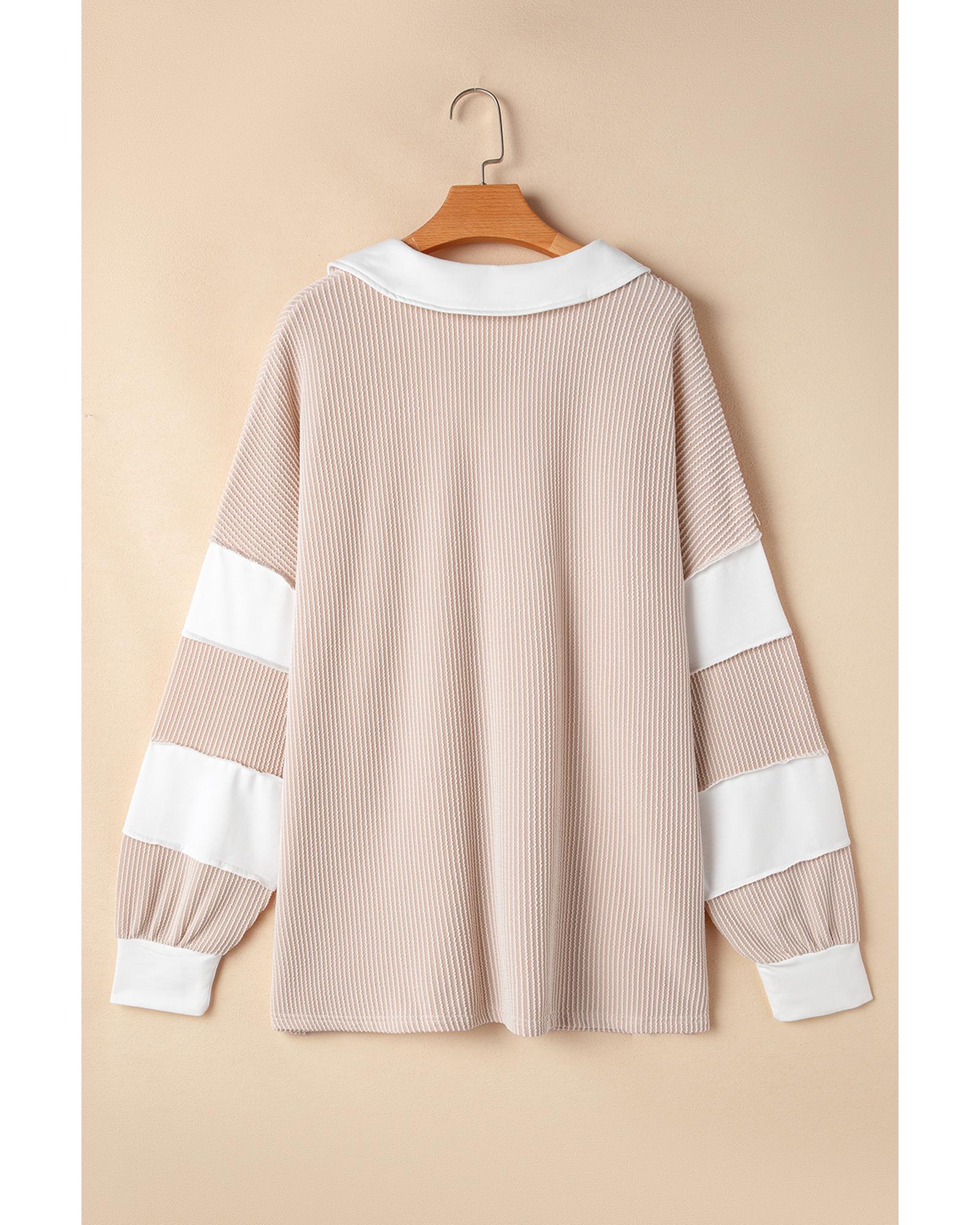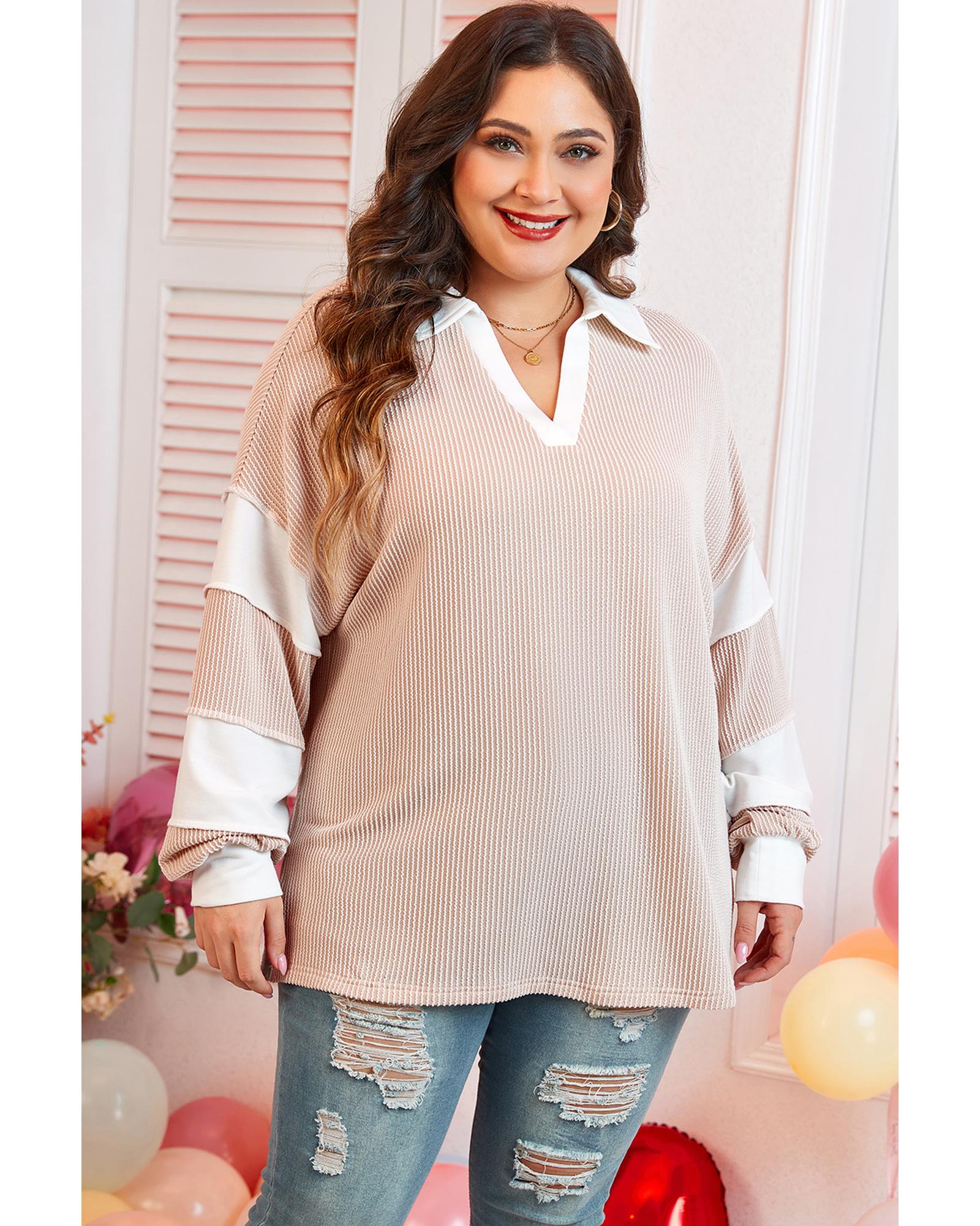 Parchment Corded Colorblock Long Sleeve Slit V Neck Plus Top – 2X