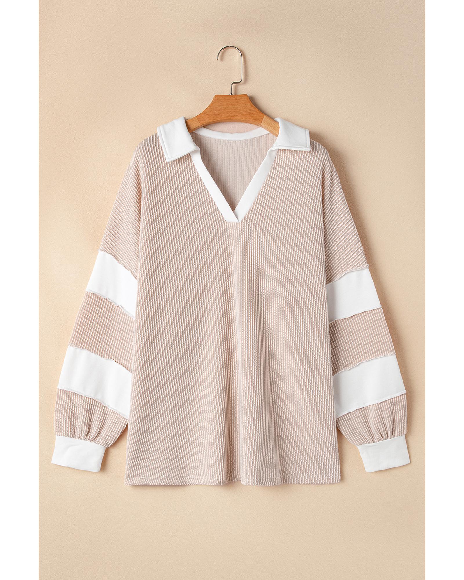 Parchment Corded Colorblock Long Sleeve Slit V Neck Plus Top – 3X