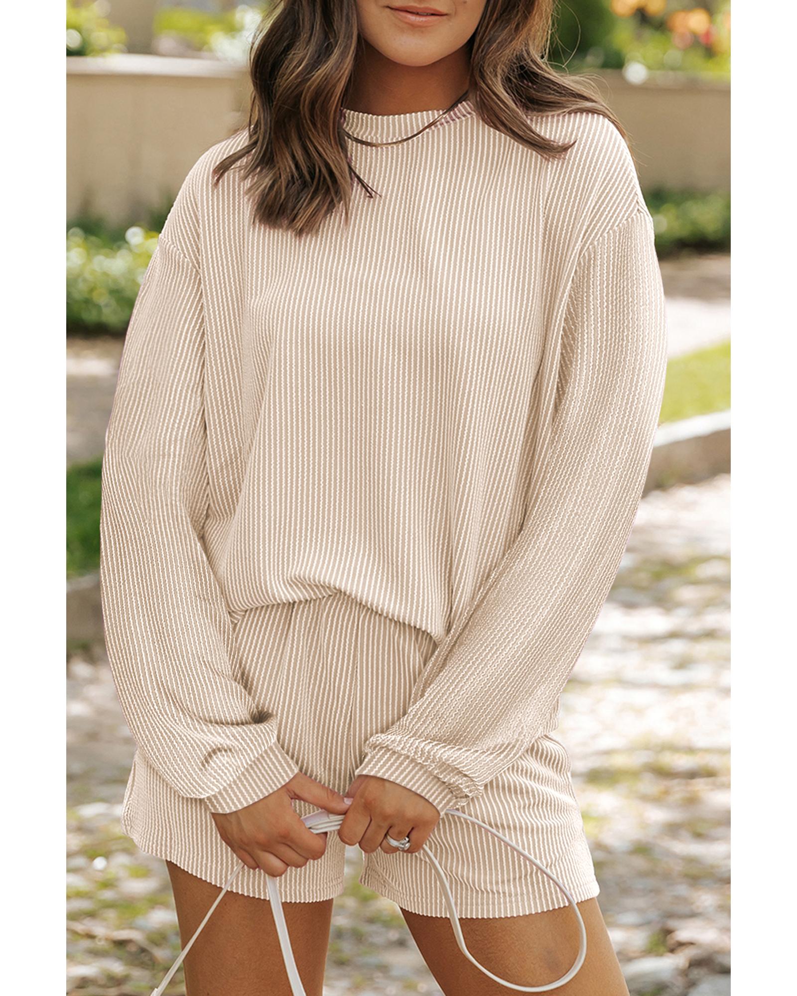 Parchment Corded Knit Long Sleeve Top and High Waist Shorts Set – 2XL