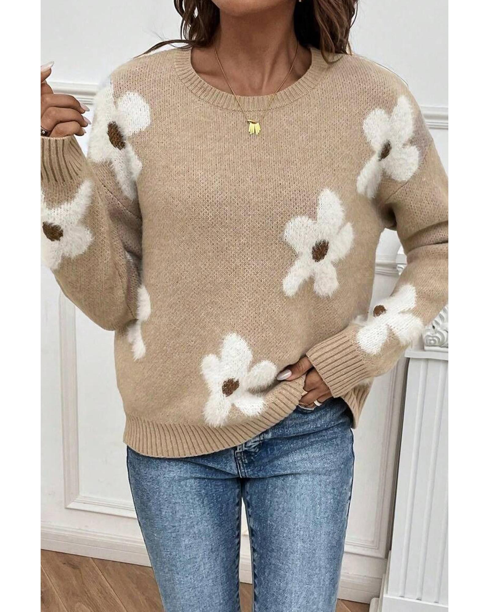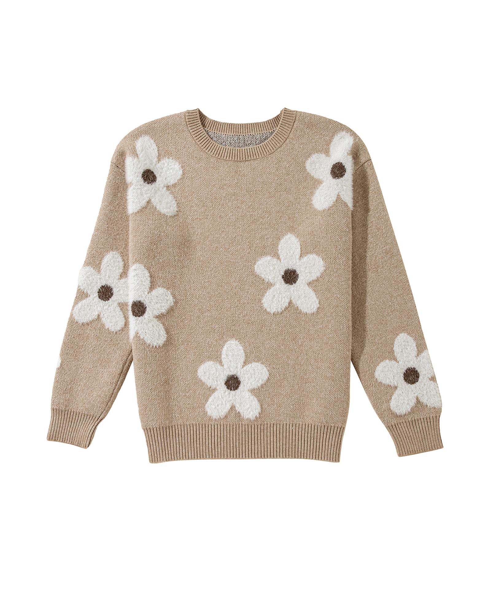 - Parchment Flower Pattern Ribbed Trim Crew Neck Sweater