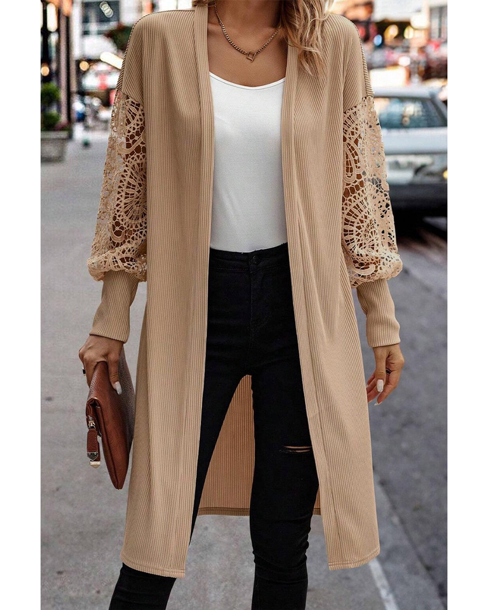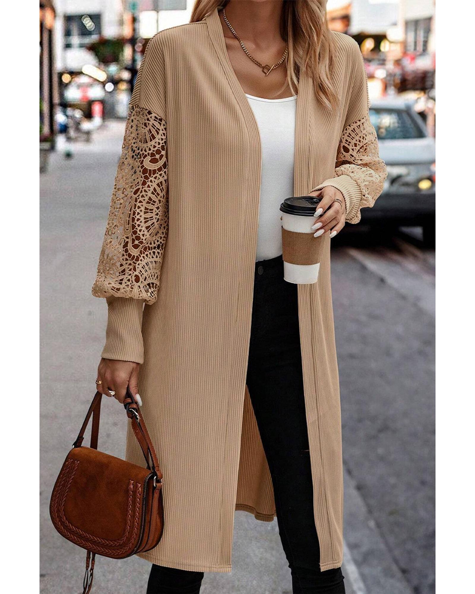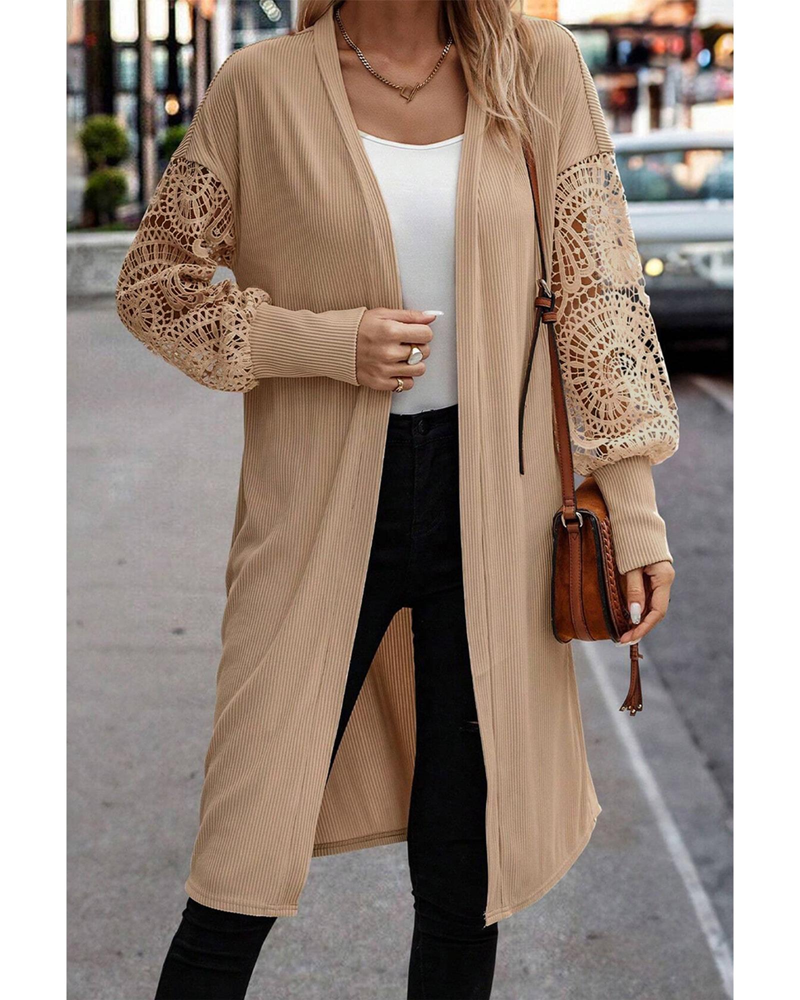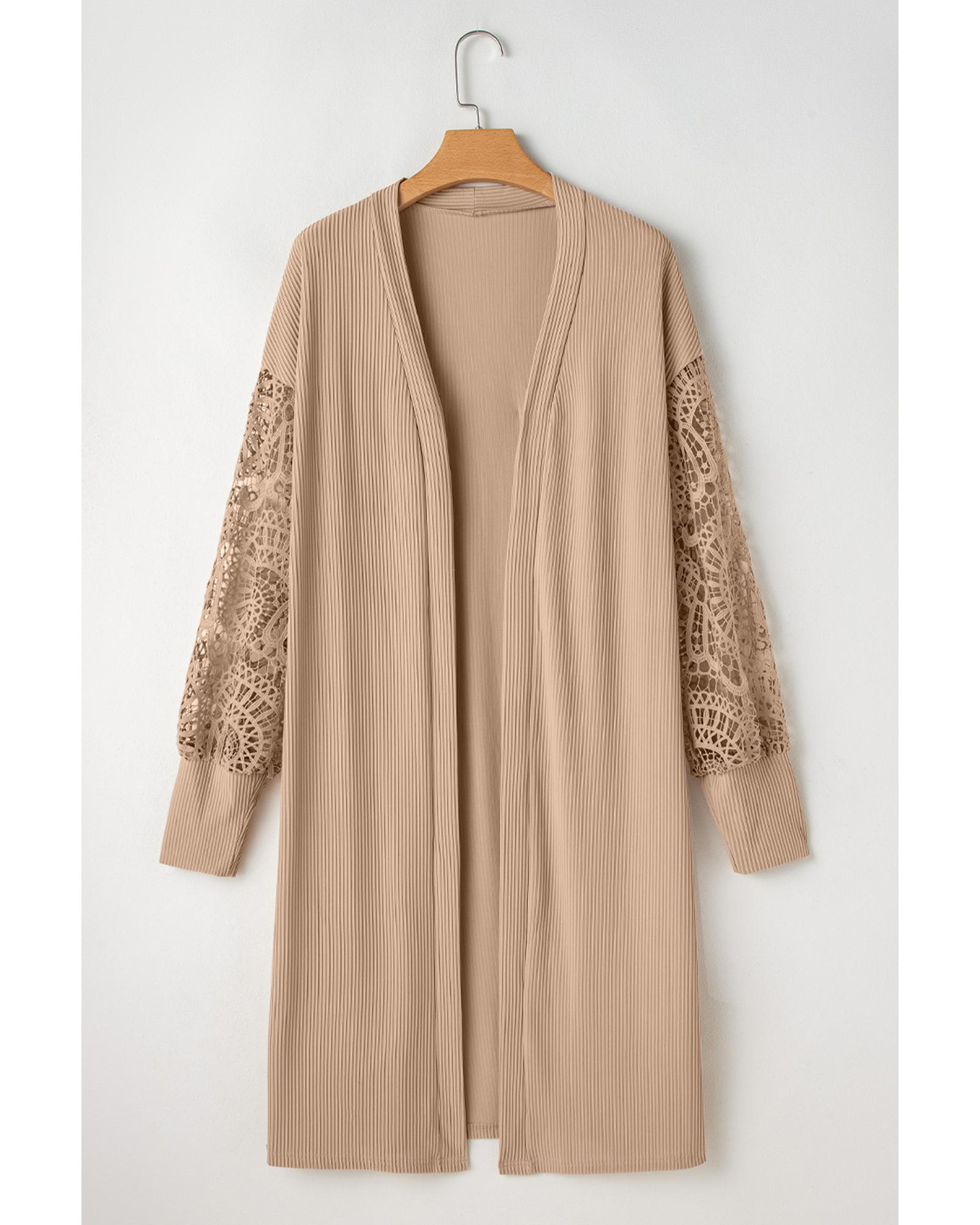 Parchment Lace Patchwork Ribbed Knit Open Front Duster Cardigan – M