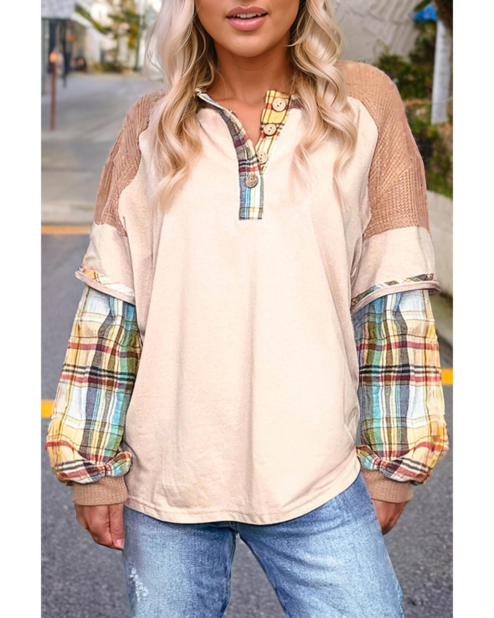 Parchment Plus Size Plaid Patchwork Layered Henley Top – 1X