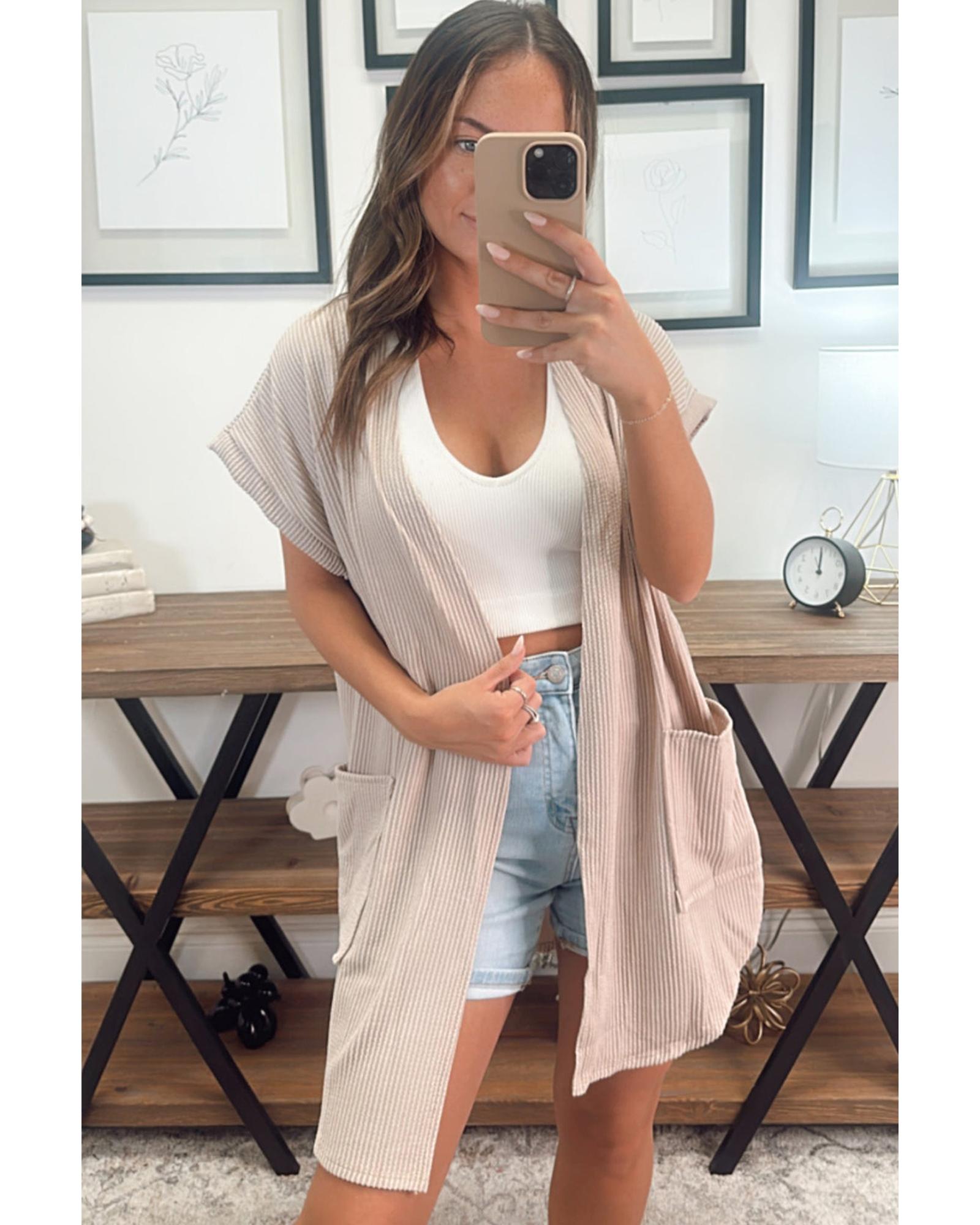 Parchment Ribbed Pocketed Short Sleeve Open Front Top – XL