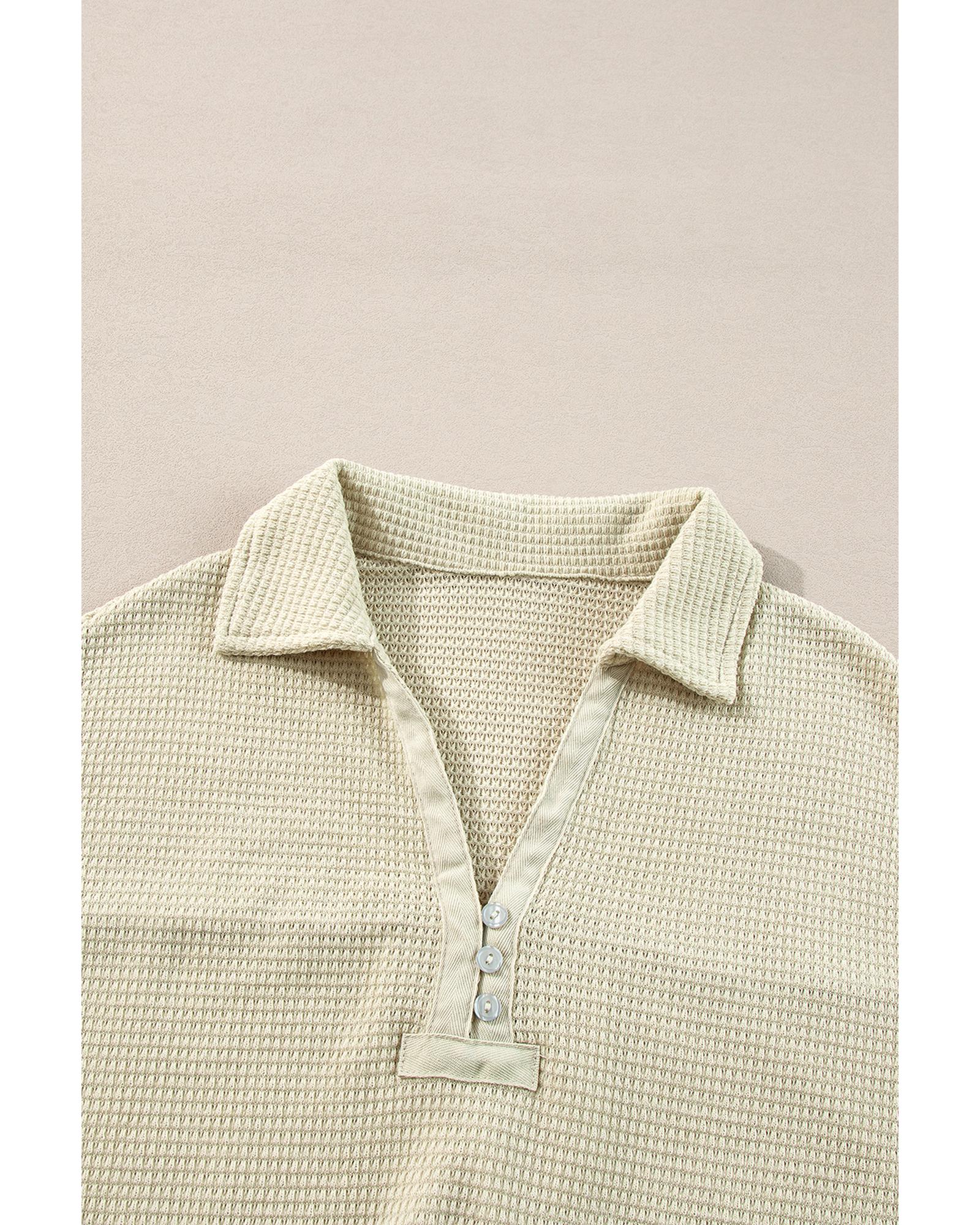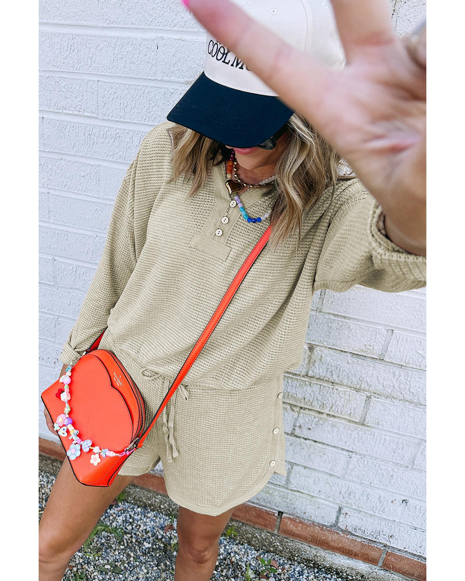 Parchment Textured Buttoned Long Sleeve Top 2 Piece Shorts Set – L