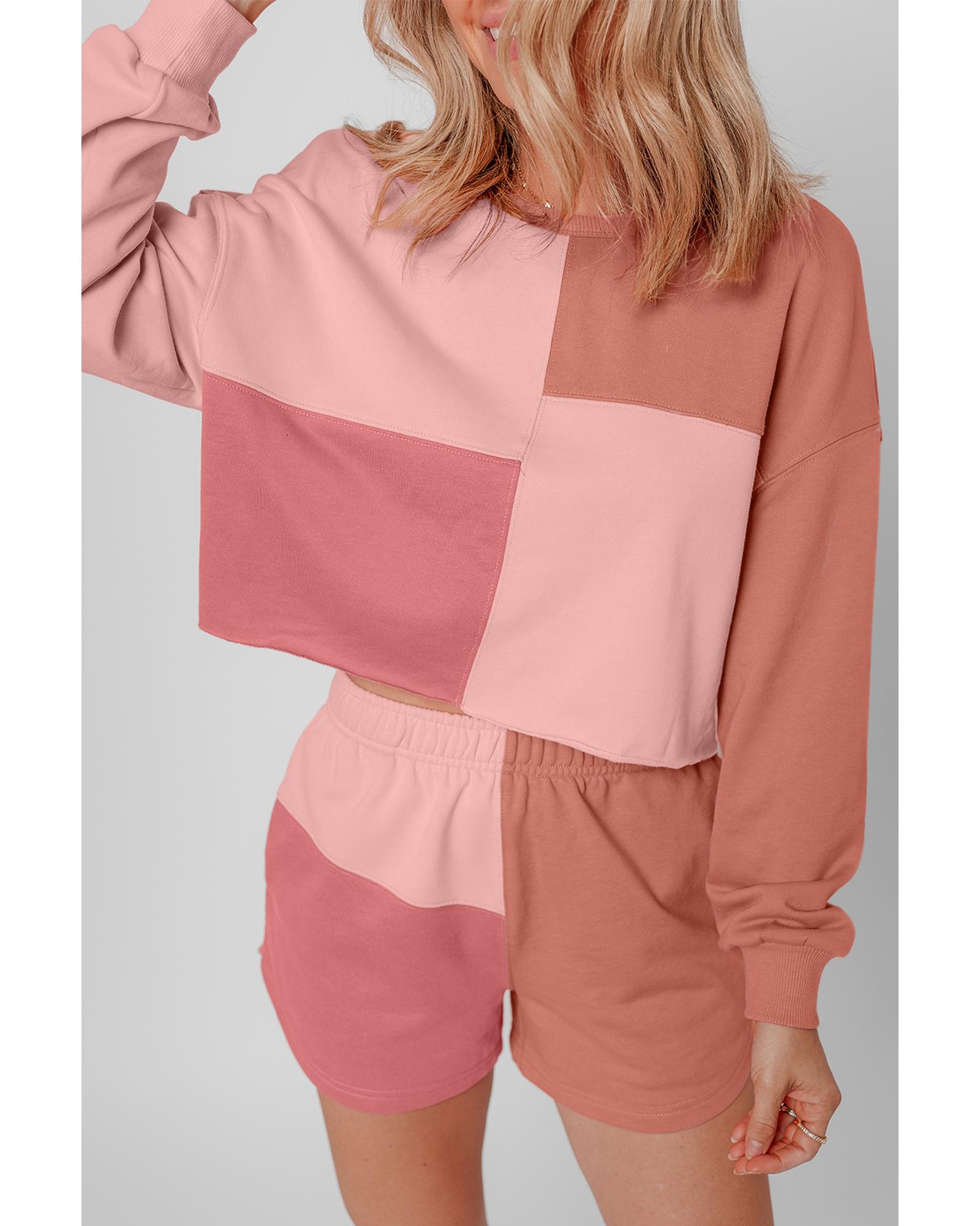 Peach Blossom Colorblock Patchwork Long Sleeve Shorts Outfit - S
