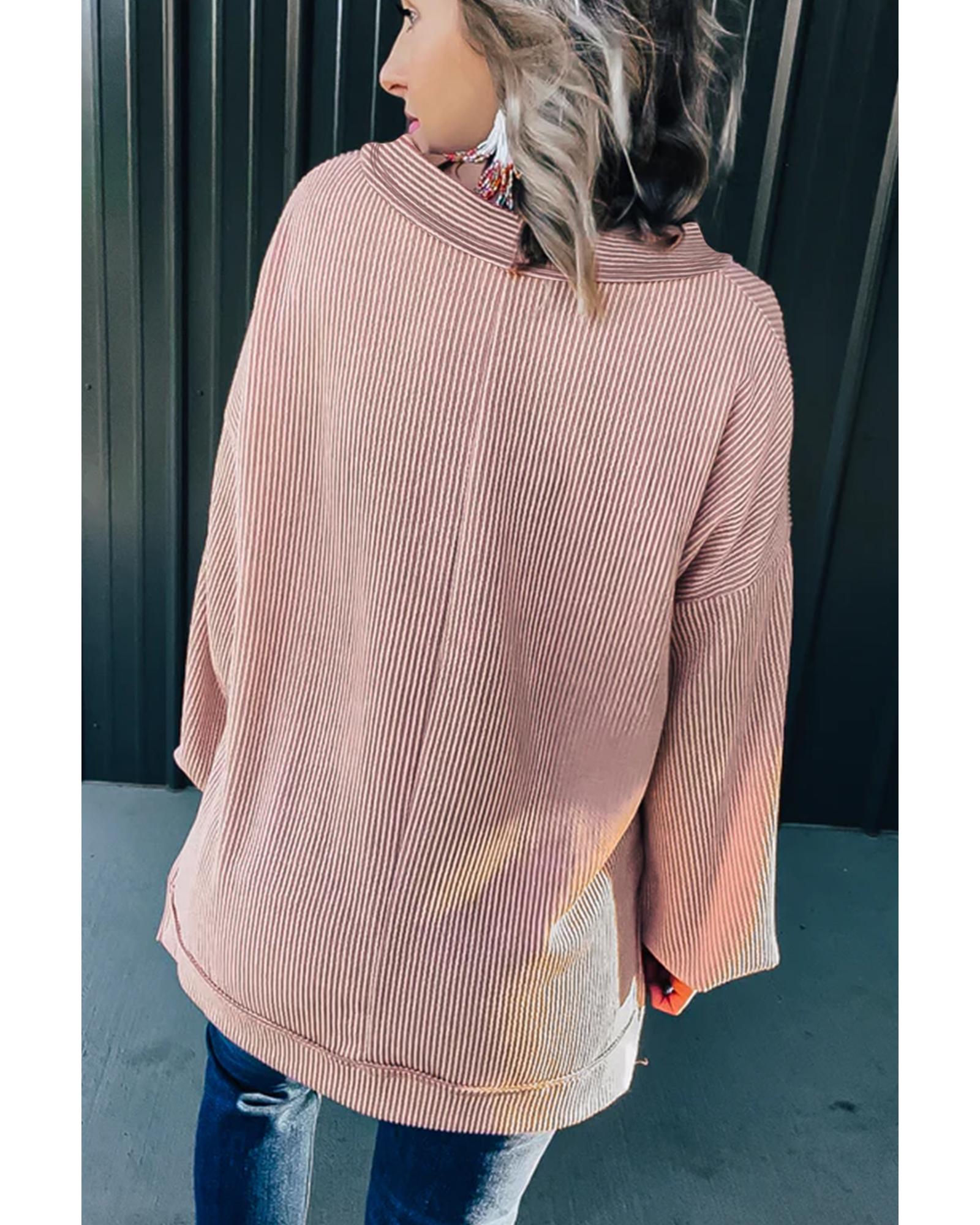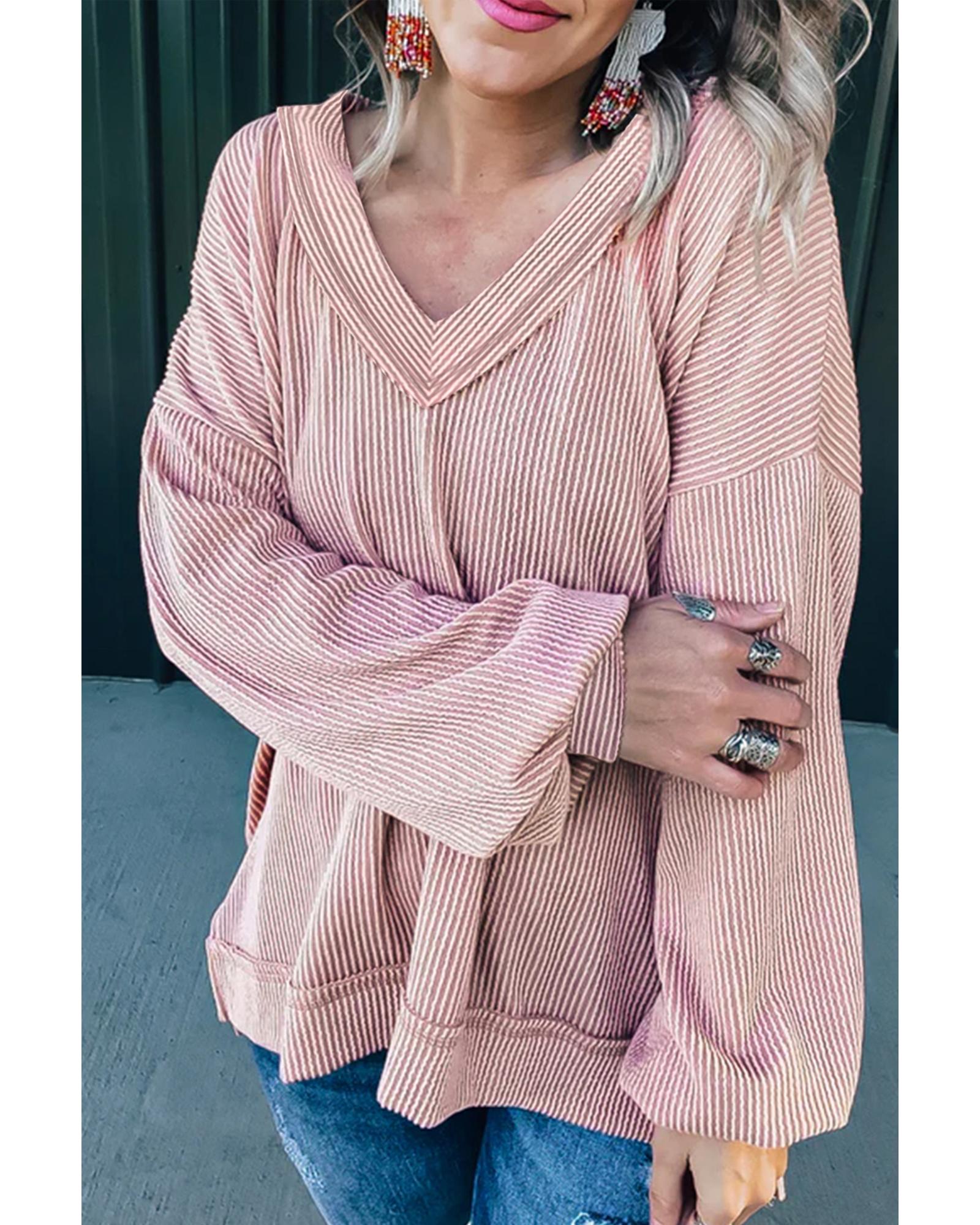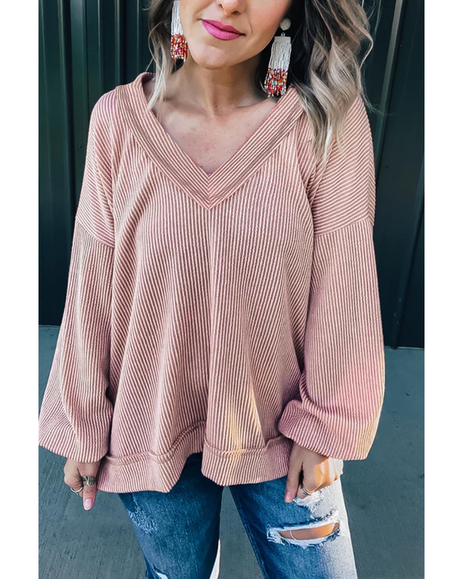 - Peach Blossom Loose V Neck Bubble Sleeve Knit Ribbed Top