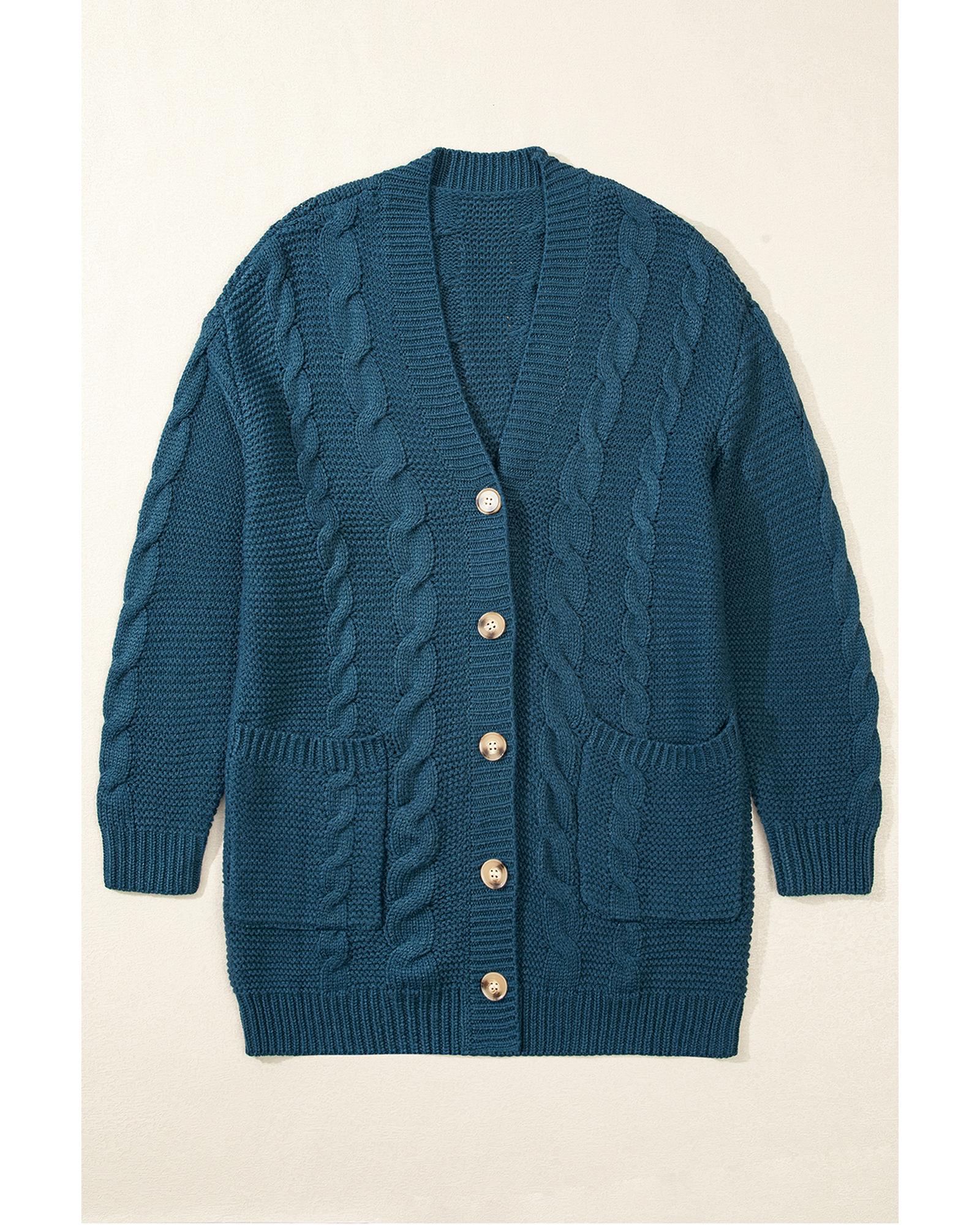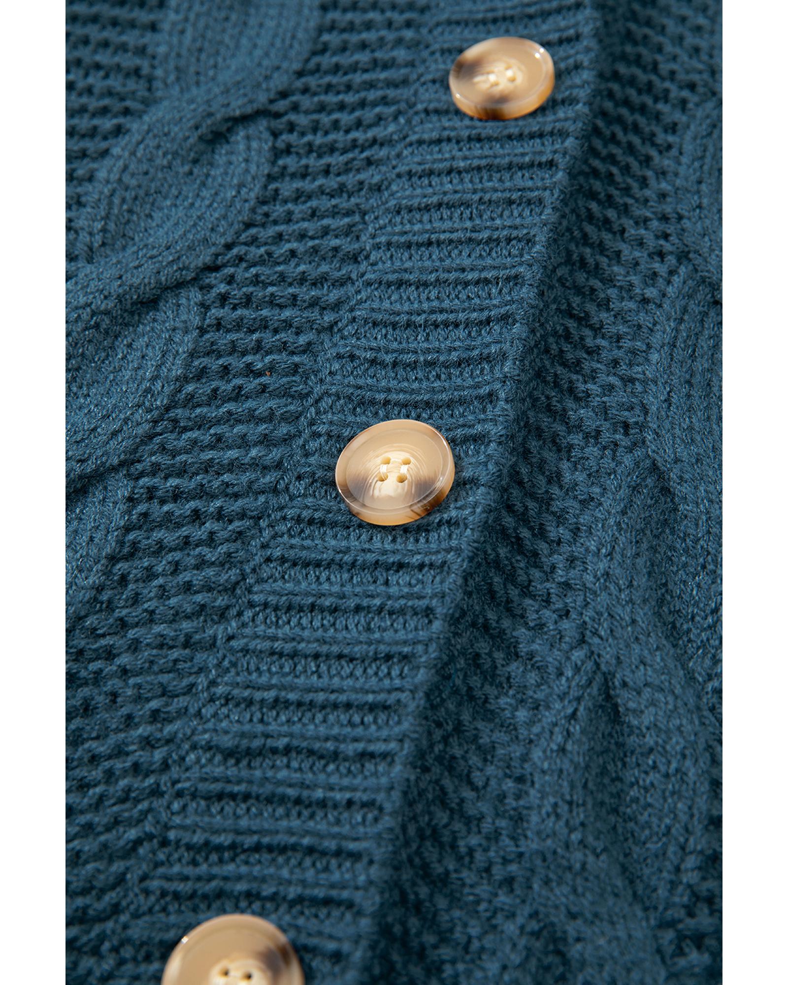 - Peacock Blue Cable Knit Button Front Pocketed Baggy Cardigan