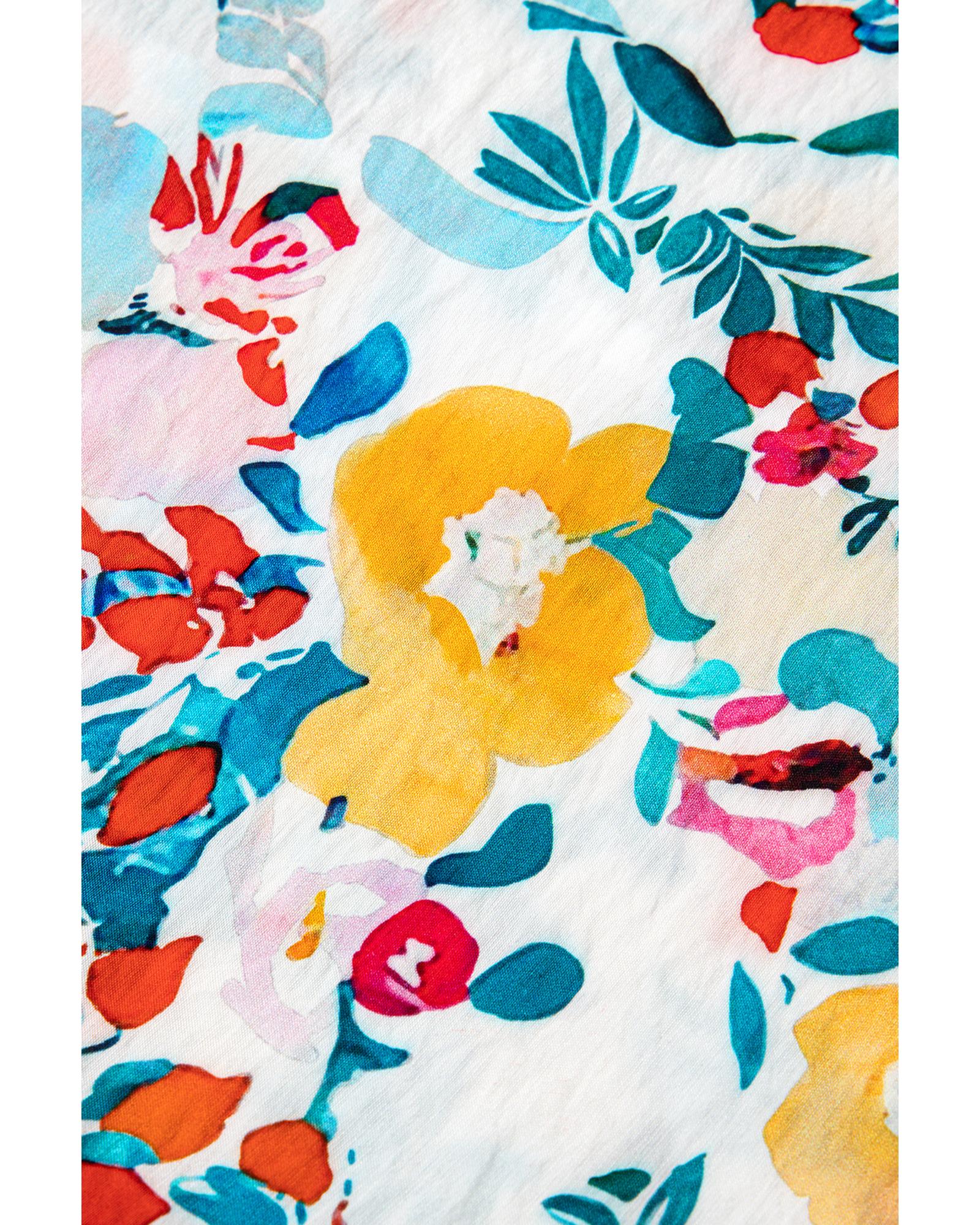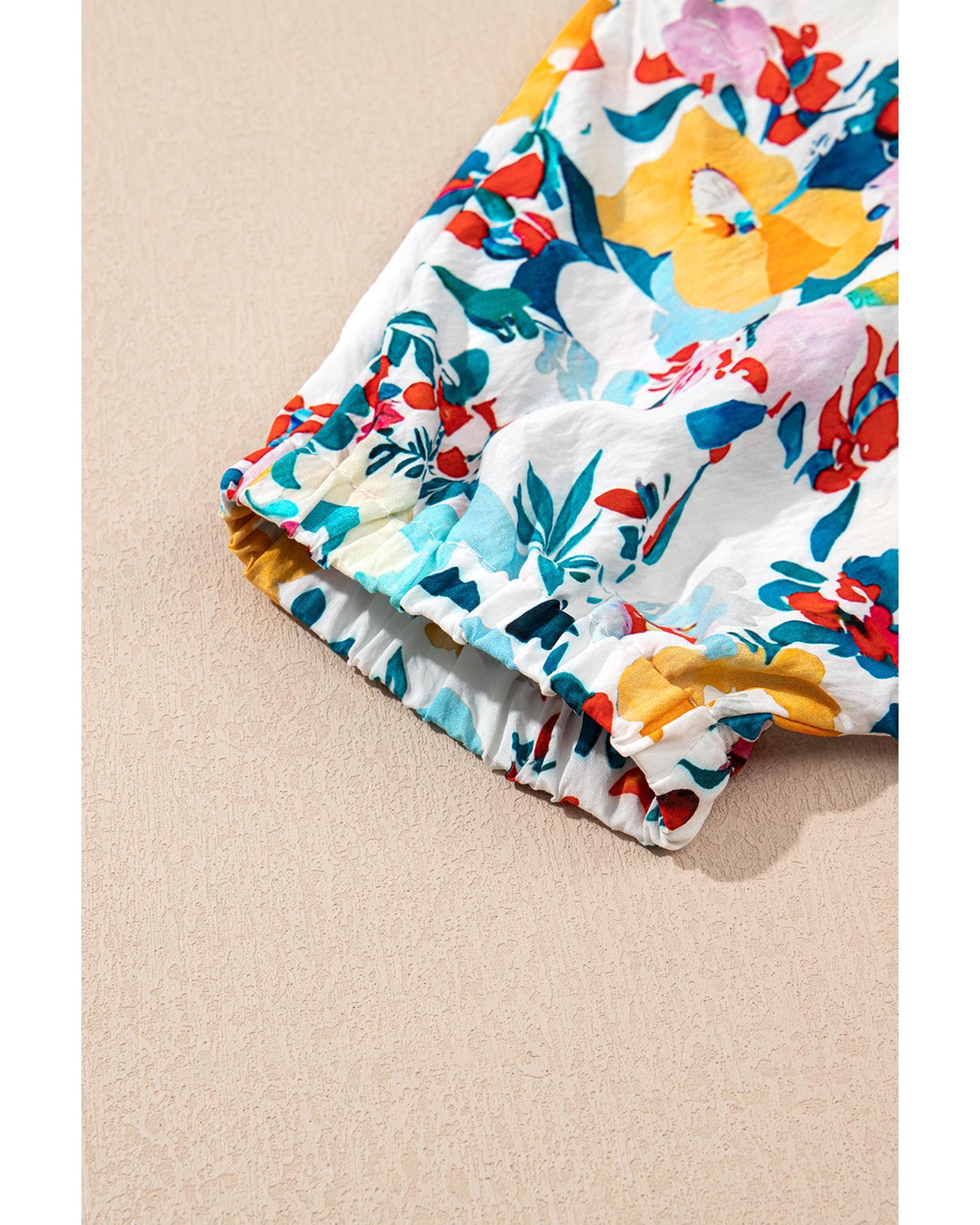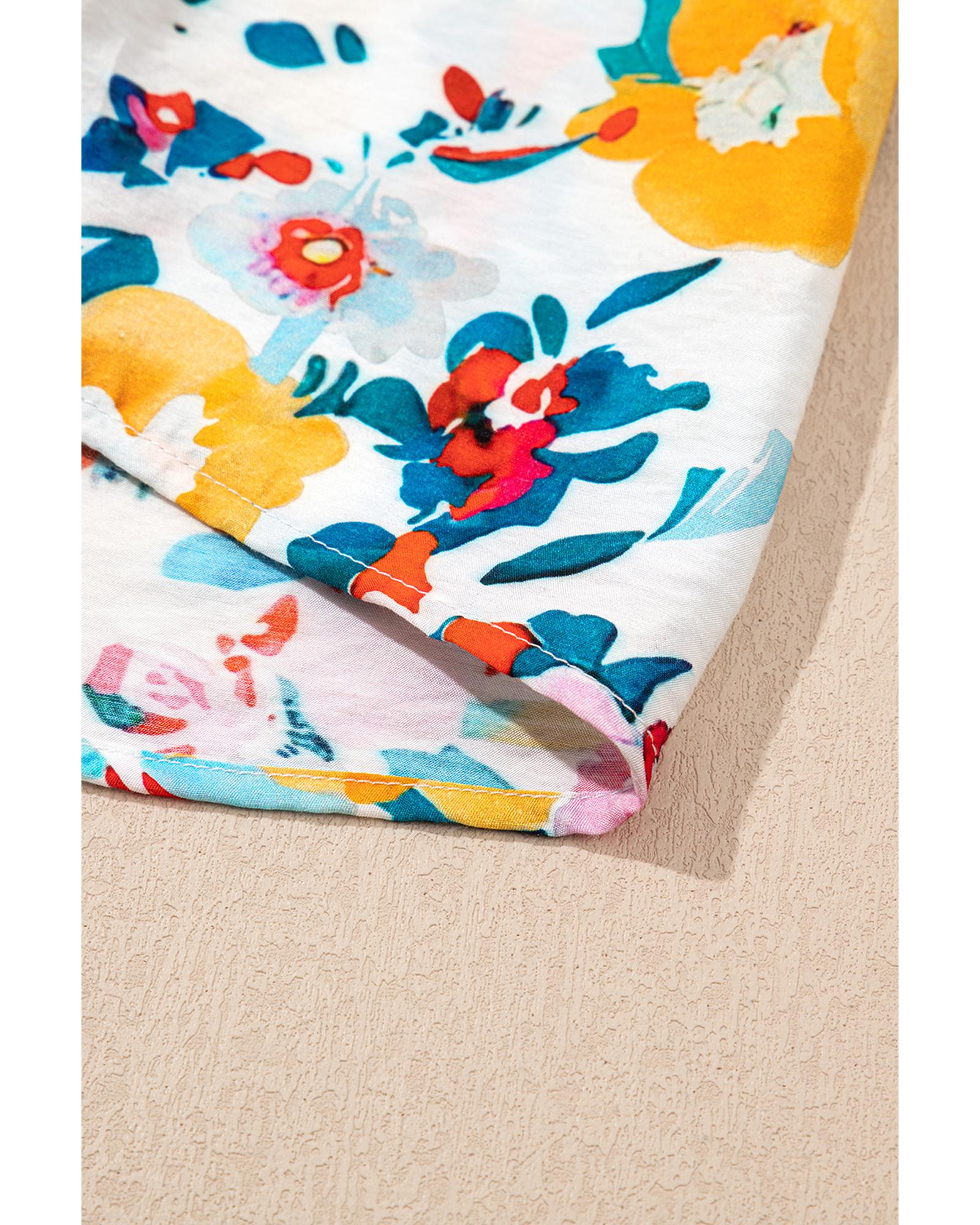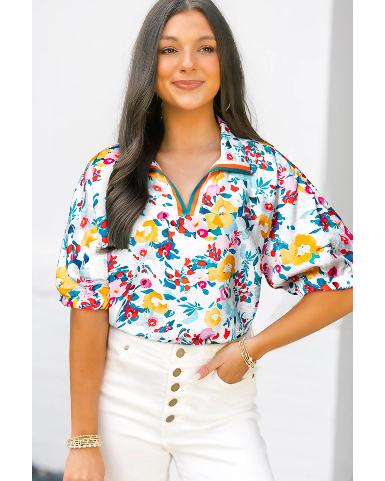 Peacock Blue Floral Print Slit V Neck Short Sleeve Blouse – L