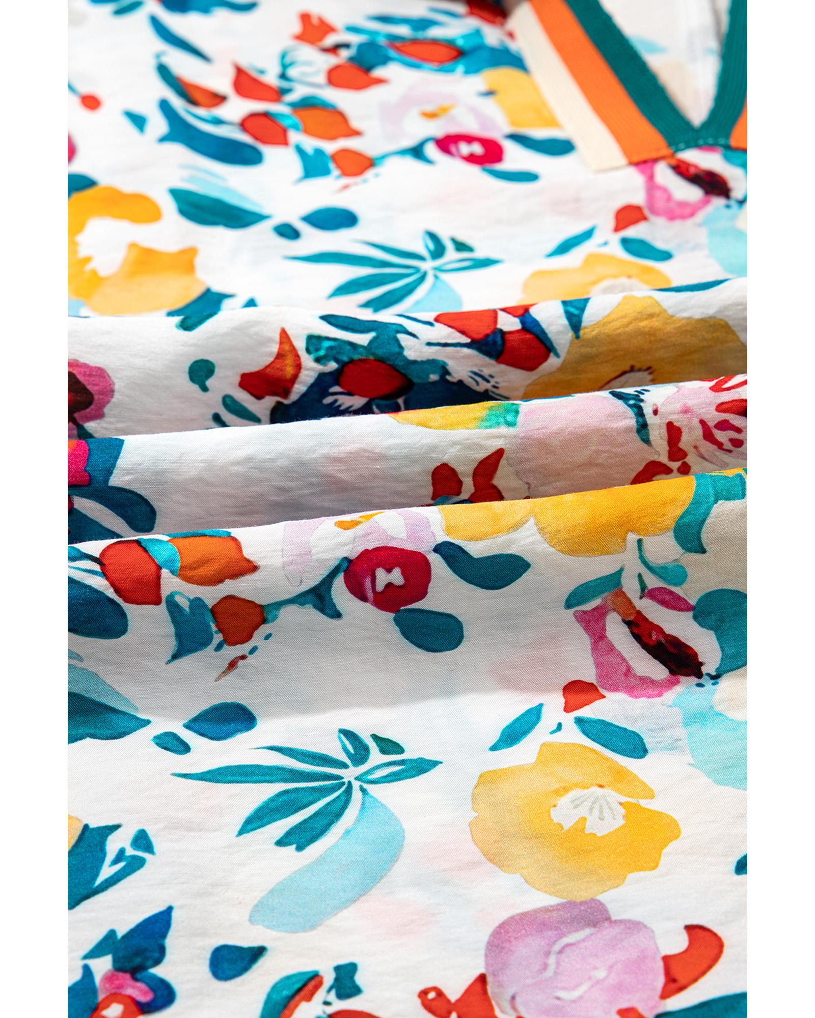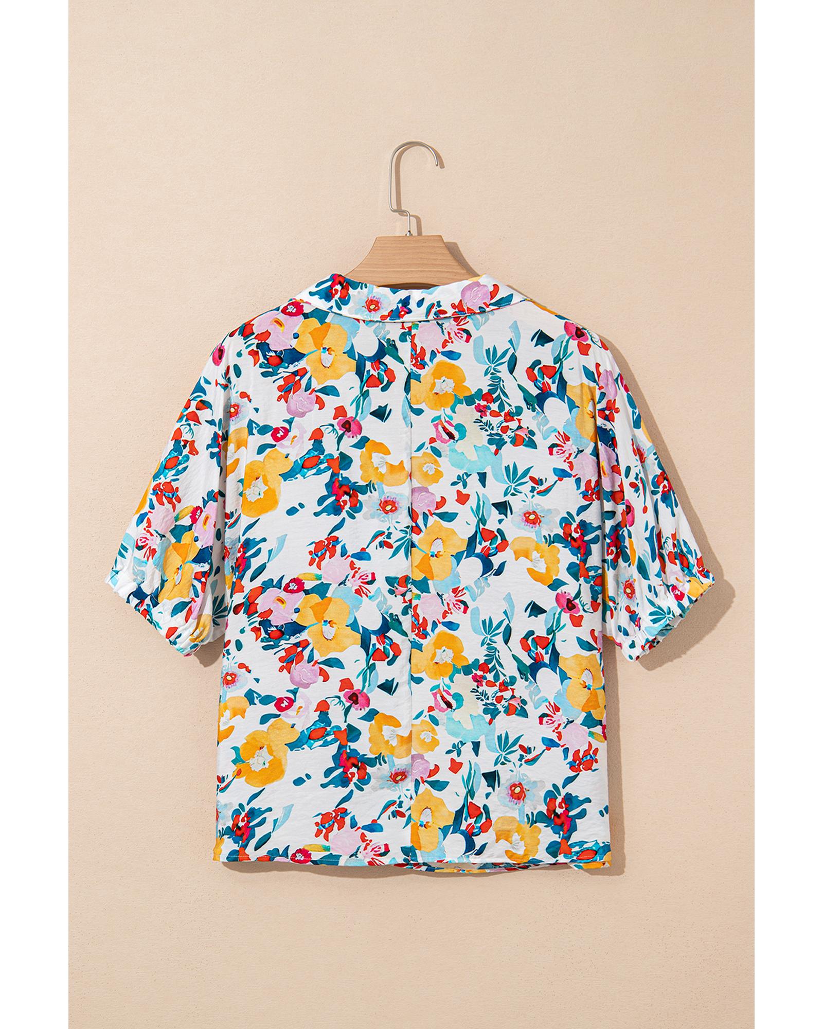 Peacock Blue Floral Print Slit V Neck Short Sleeve Blouse – S