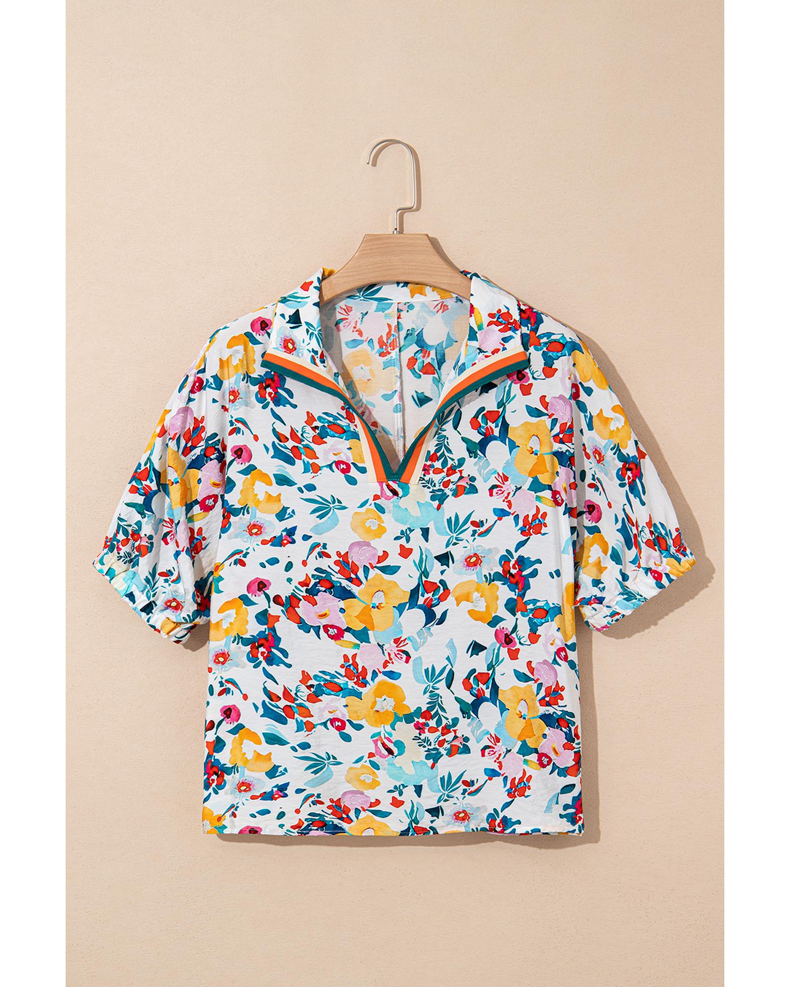 Peacock Blue Floral Print Slit V Neck Short Sleeve Blouse – XL