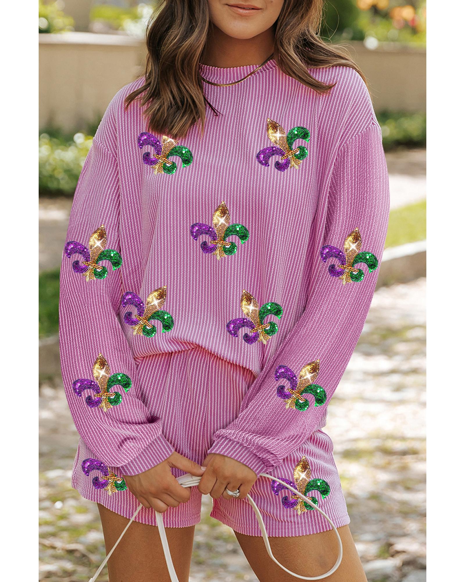 Phalaenopsis Mardi Gras Fleur de Lis Patched Corded Long Sleeve Top and Shorts – M