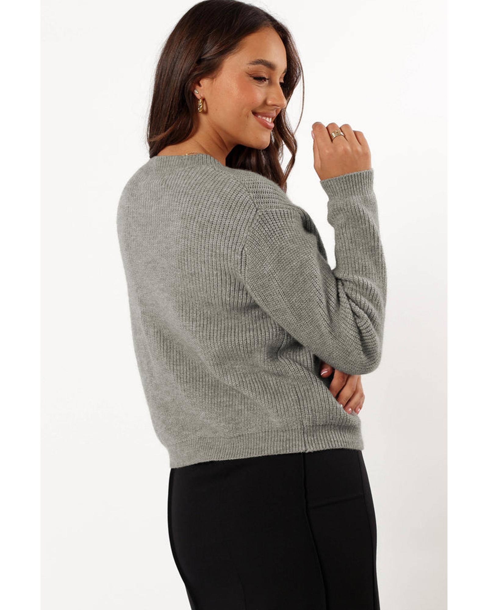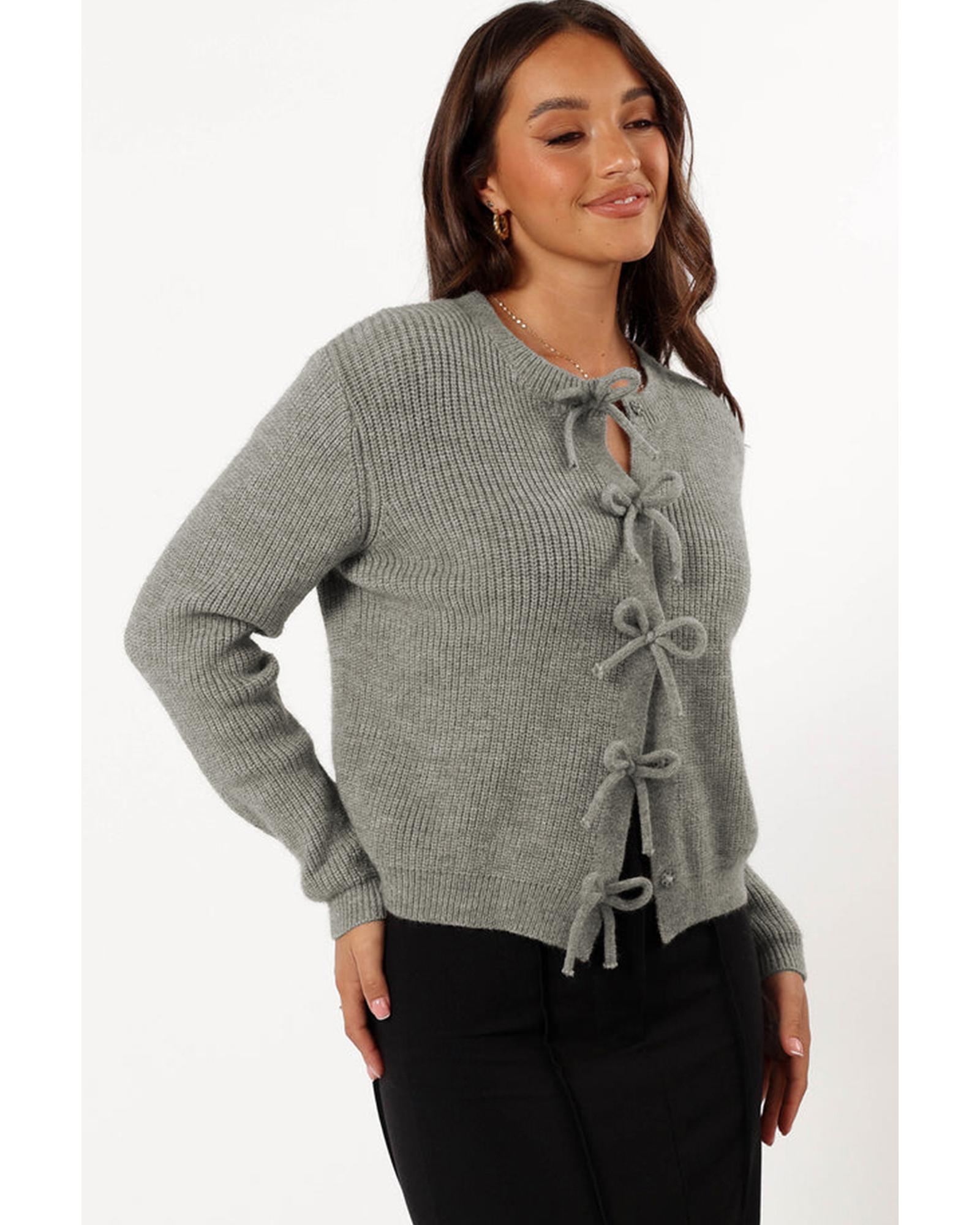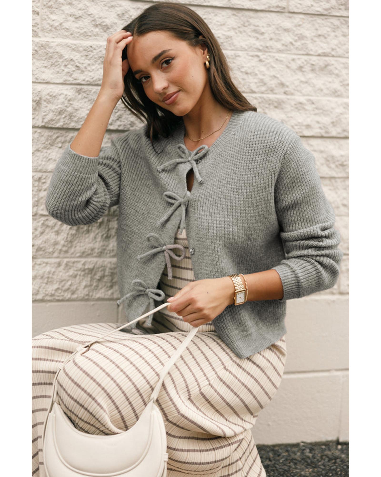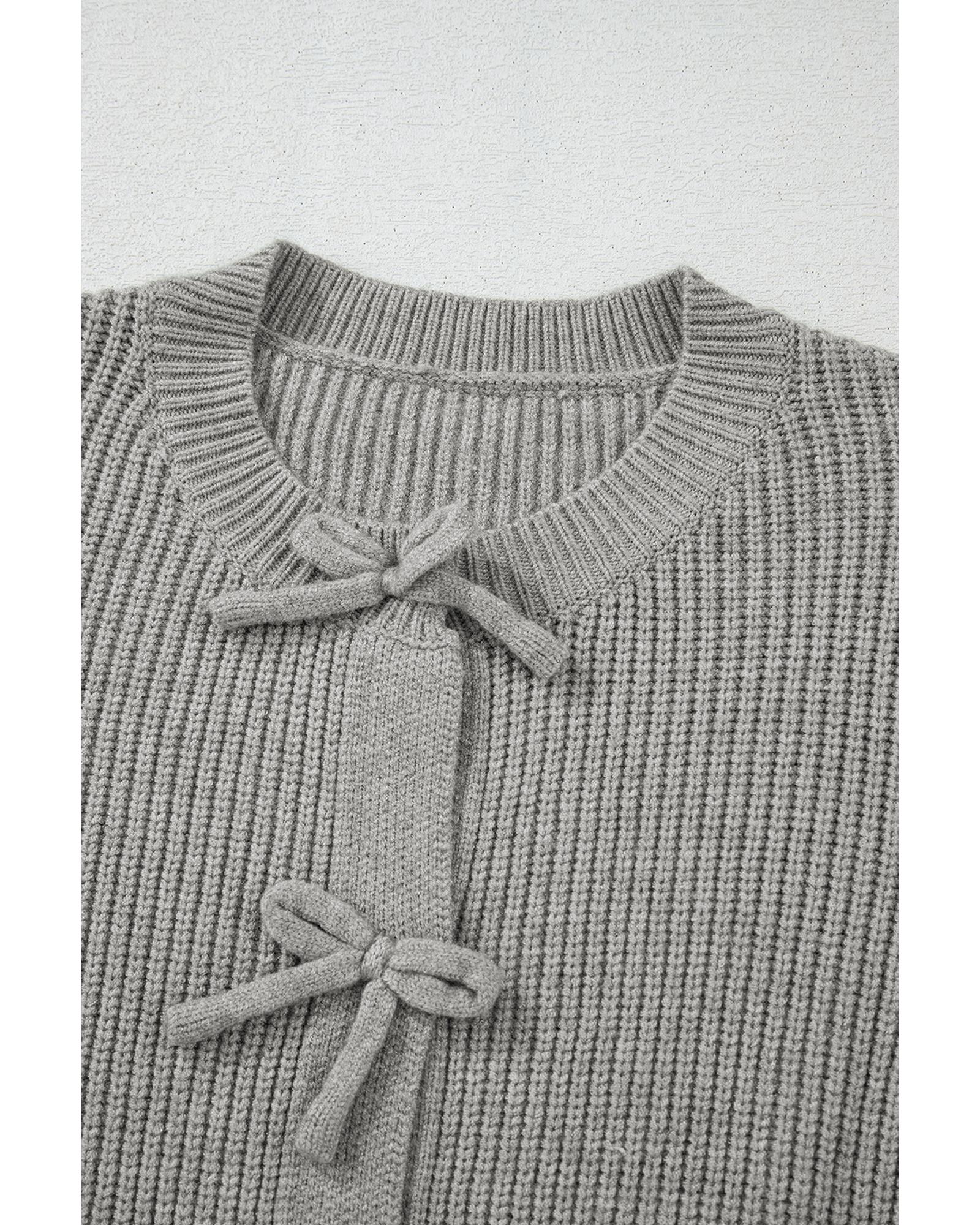 Philippine Gray Ribbed Knit Bow Front Buttoned Cardigan – L