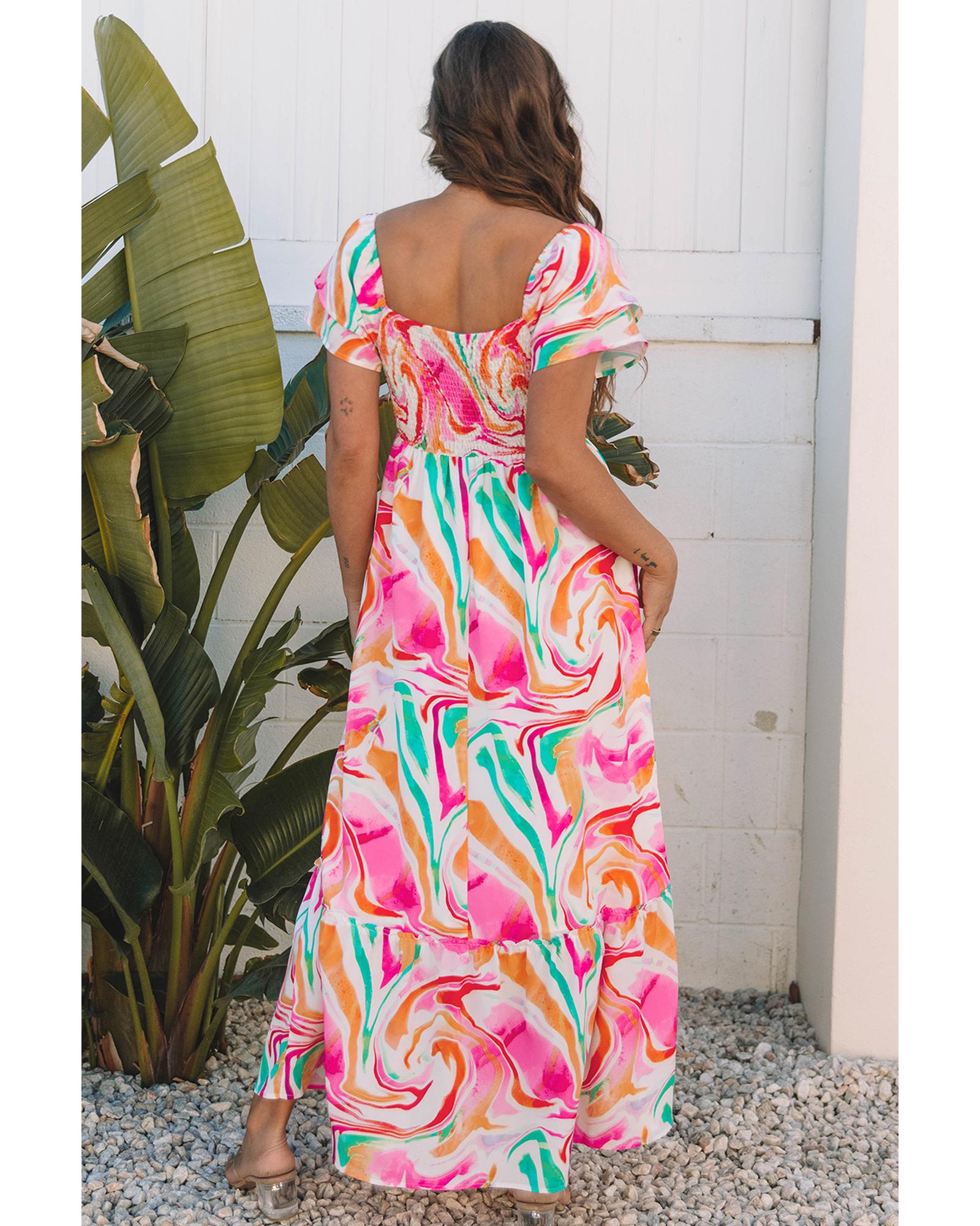 Pink Abstract Print Ruffled Sleeve Smocked Bust Maxi Dress – S