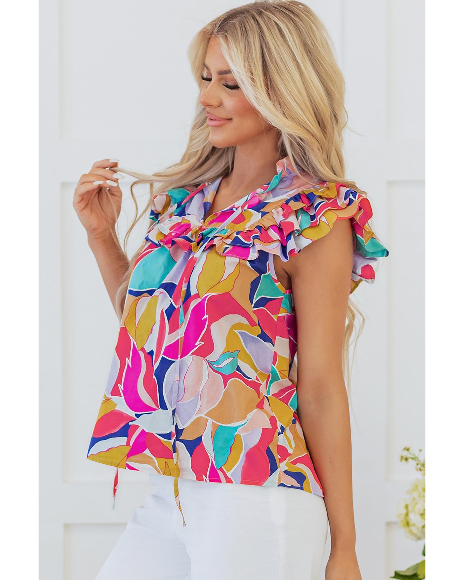 Pink Abstract Printed Ruffled Flutter Sleeve Tied Split V Neck Blouse – L