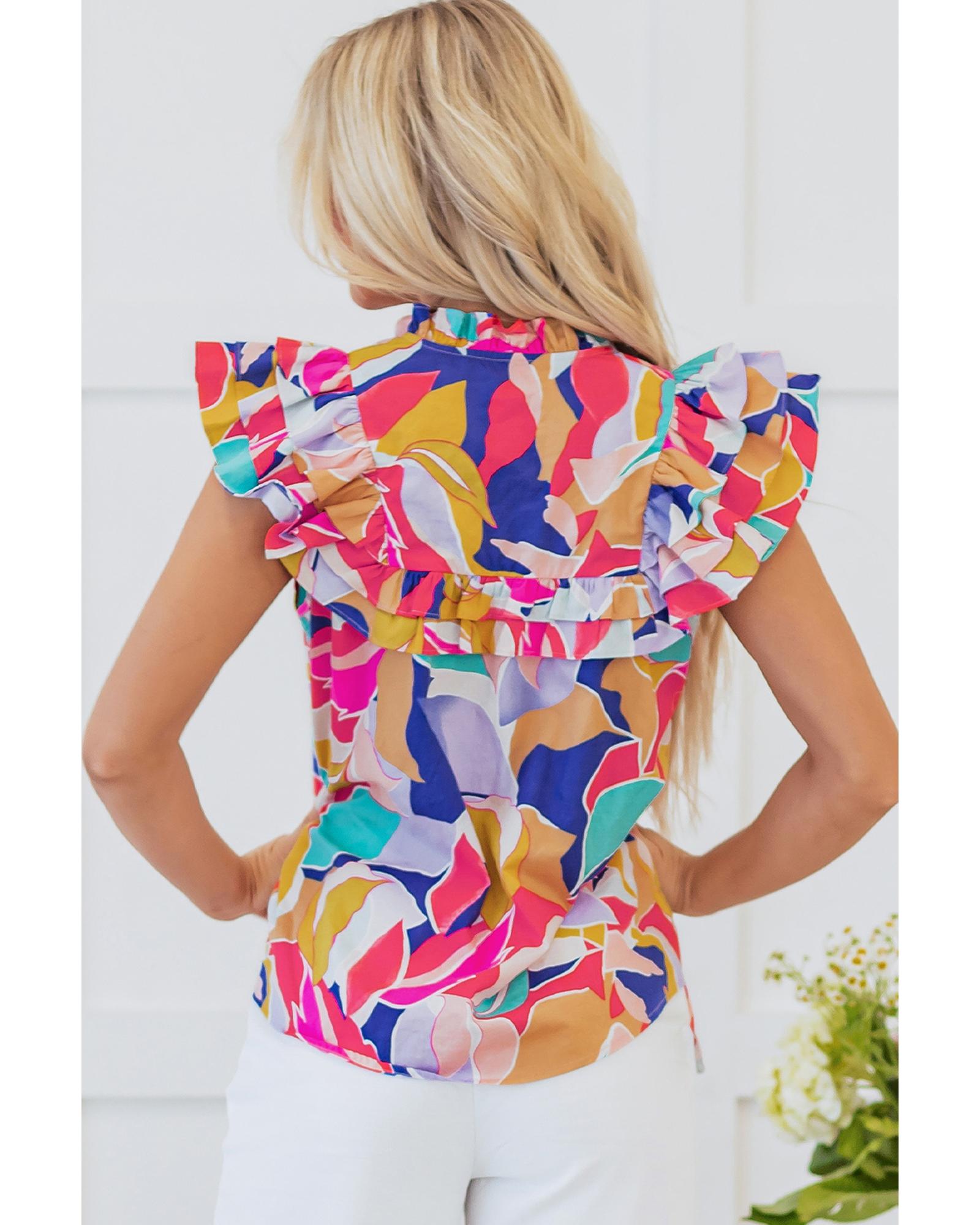 Pink Abstract Printed Ruffled Flutter Sleeve Tied Split V Neck Blouse – S