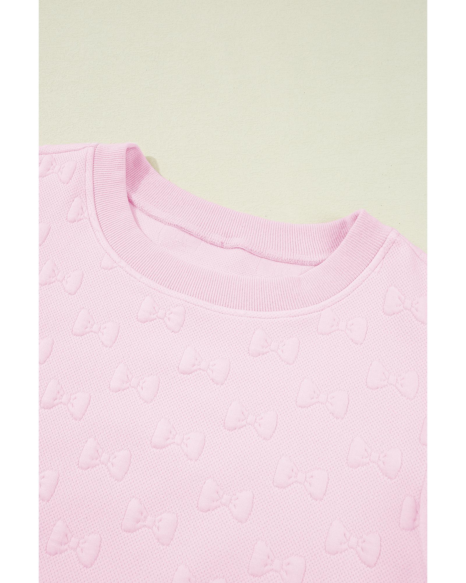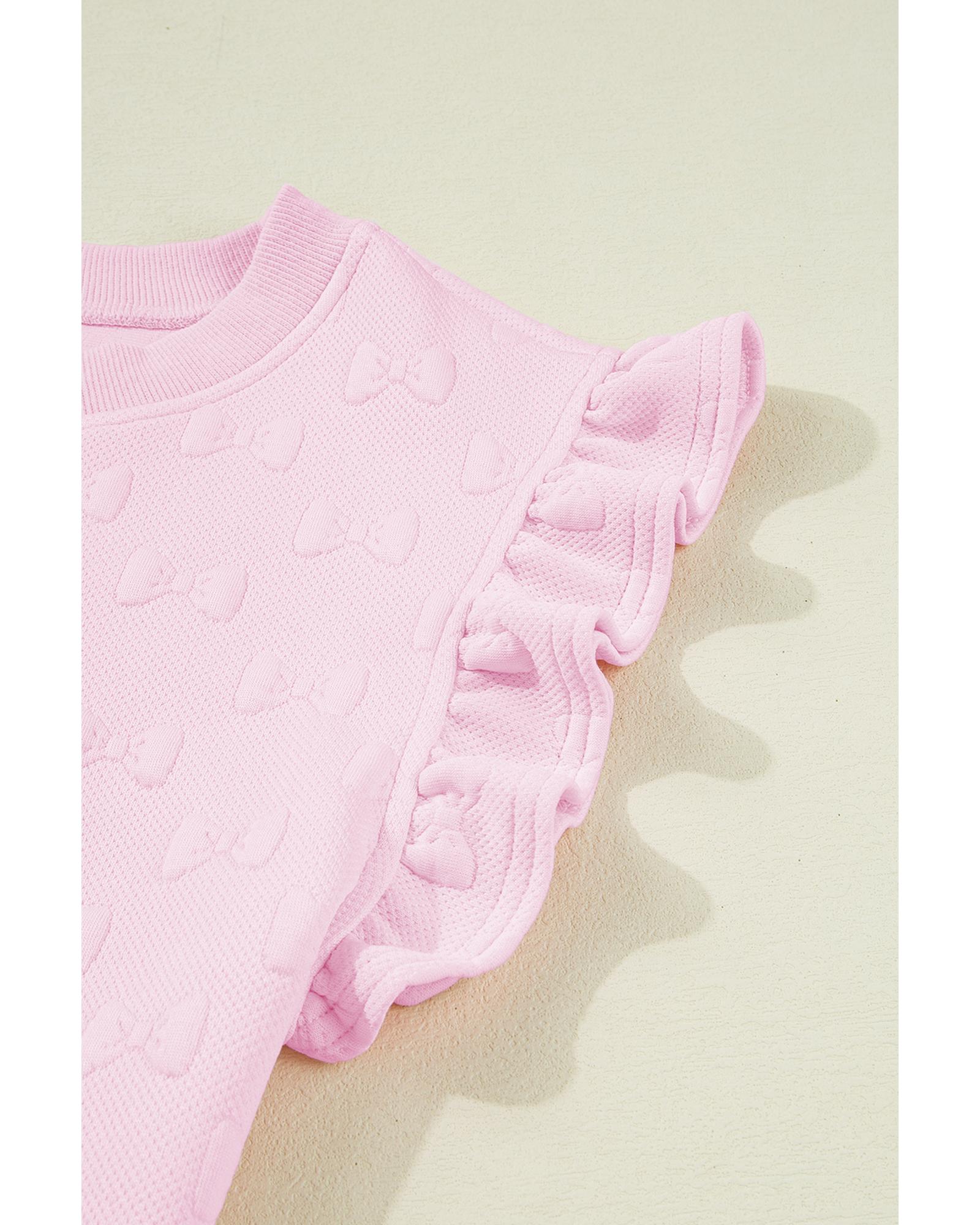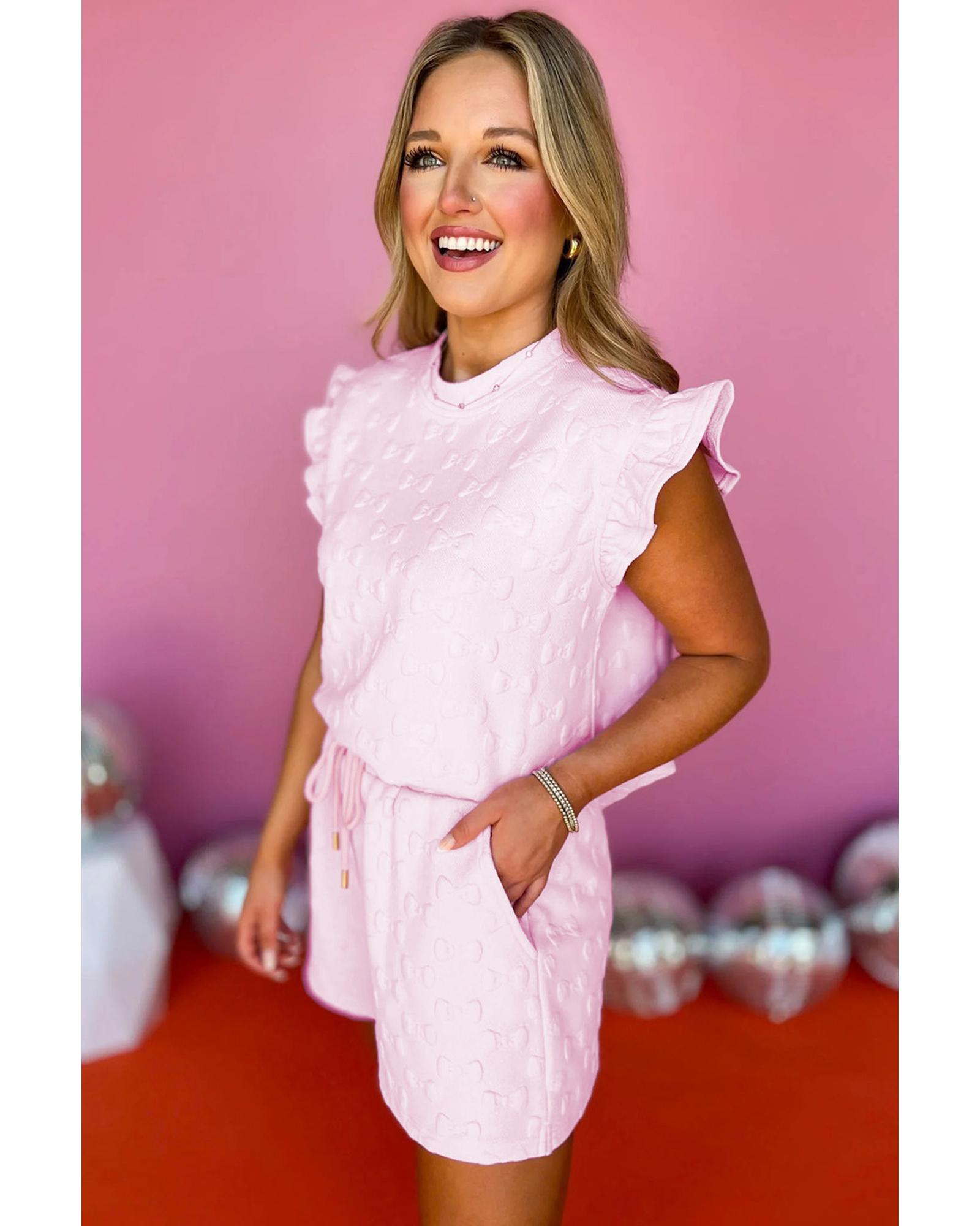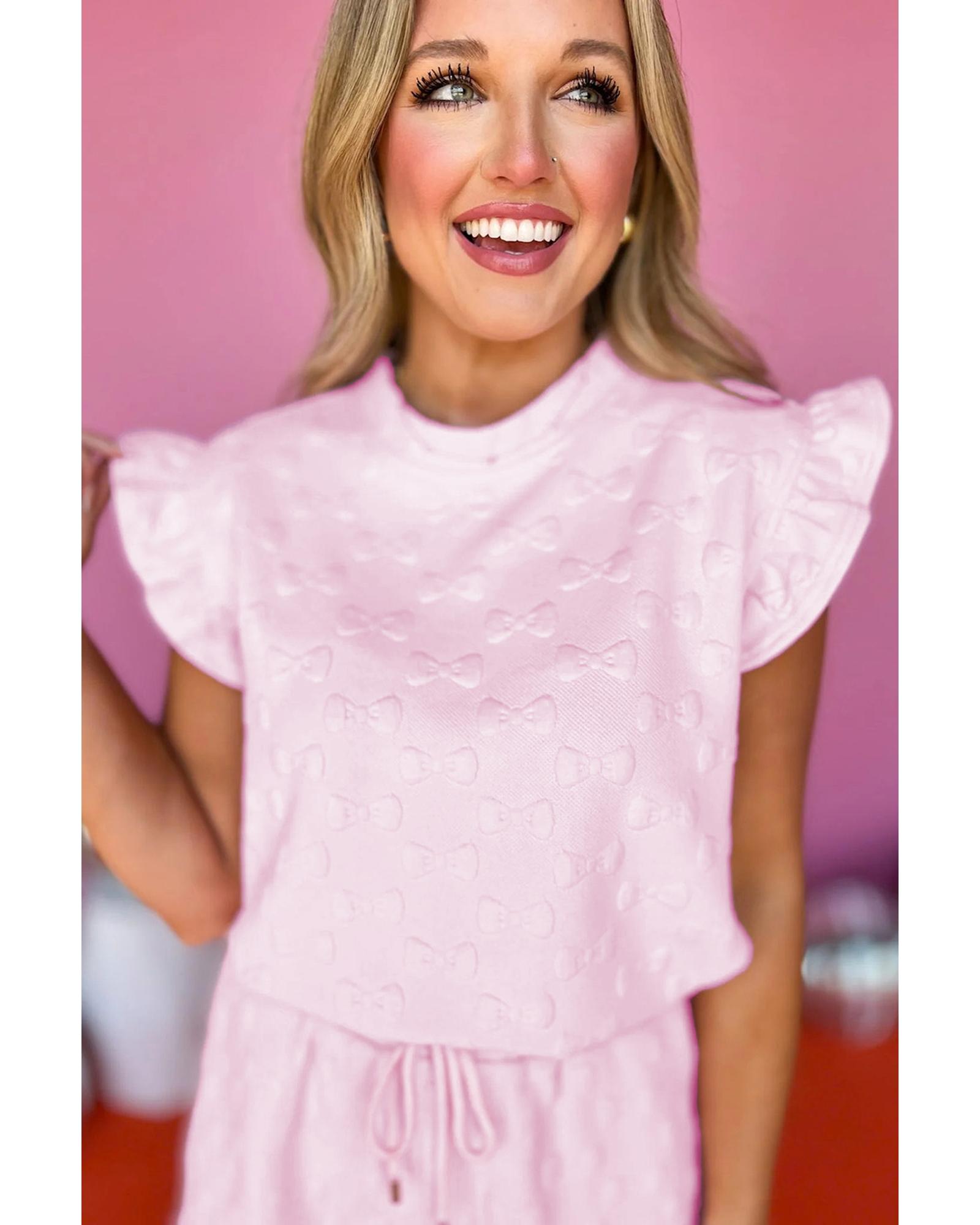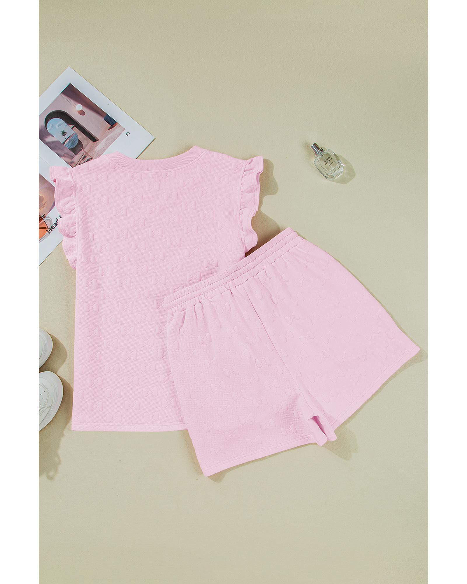 Pink Bow Jacquard Ruffle Sleeve Short 2pcs Outfit – L