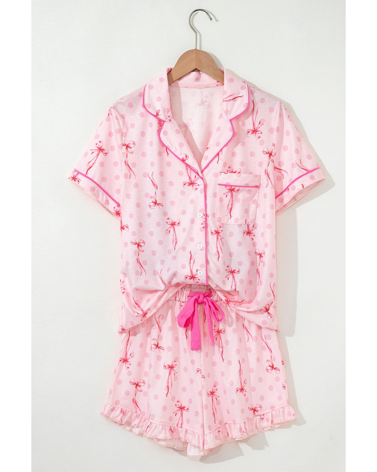Pink Bow Print Contrast Pipping Short Pajamas Set – S