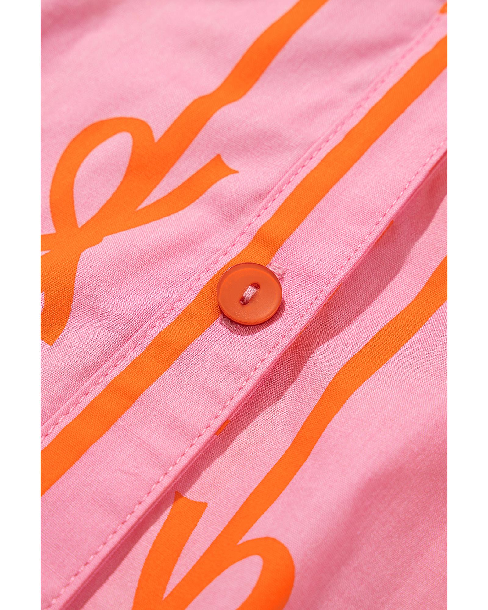 Pink Bowknot Striped Printed Bubble Sleeve Buttoned Belted Mini Dress – L
