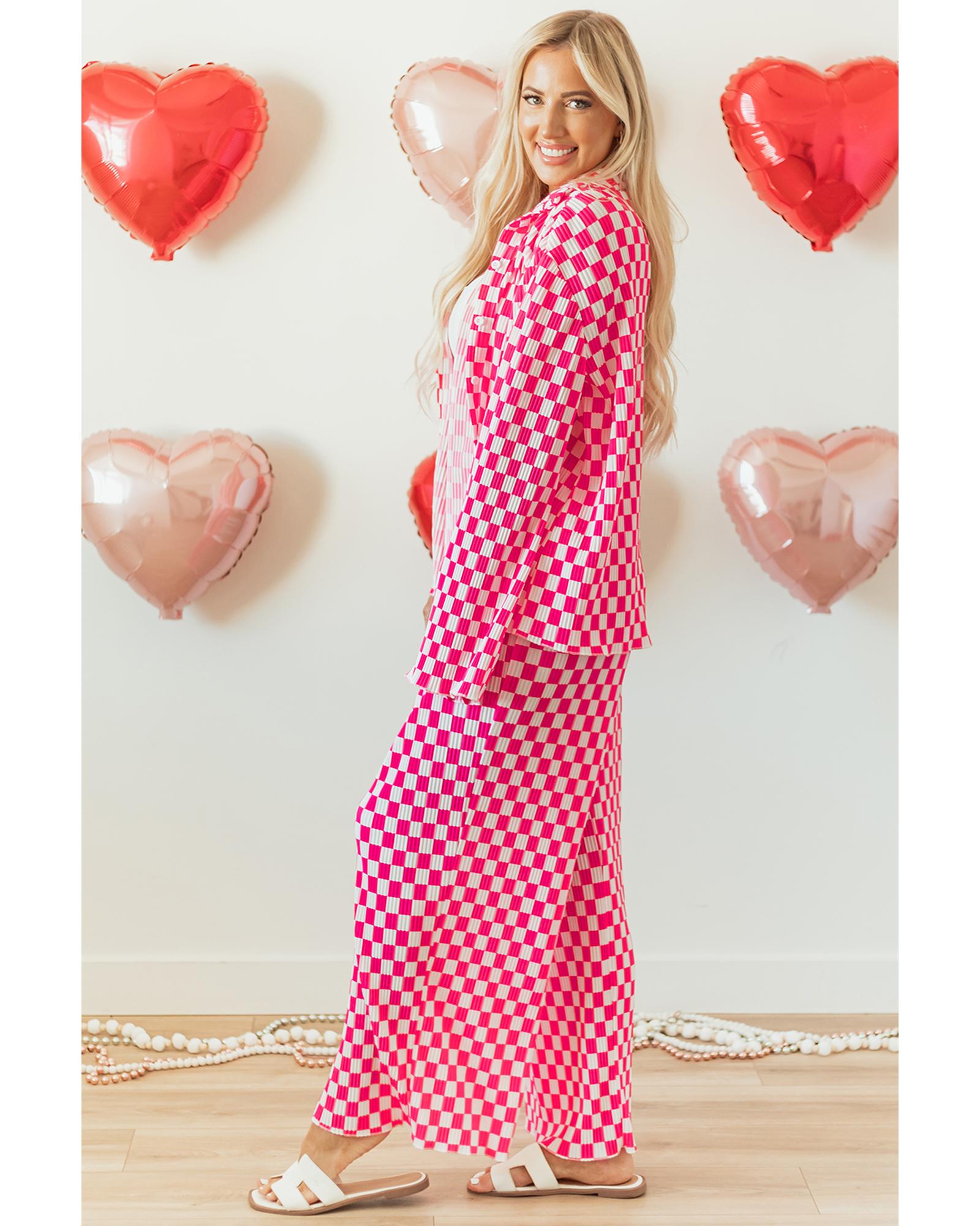 Pink Checkered Buttoned Shirt and High Waist Pants Pajama Set – S