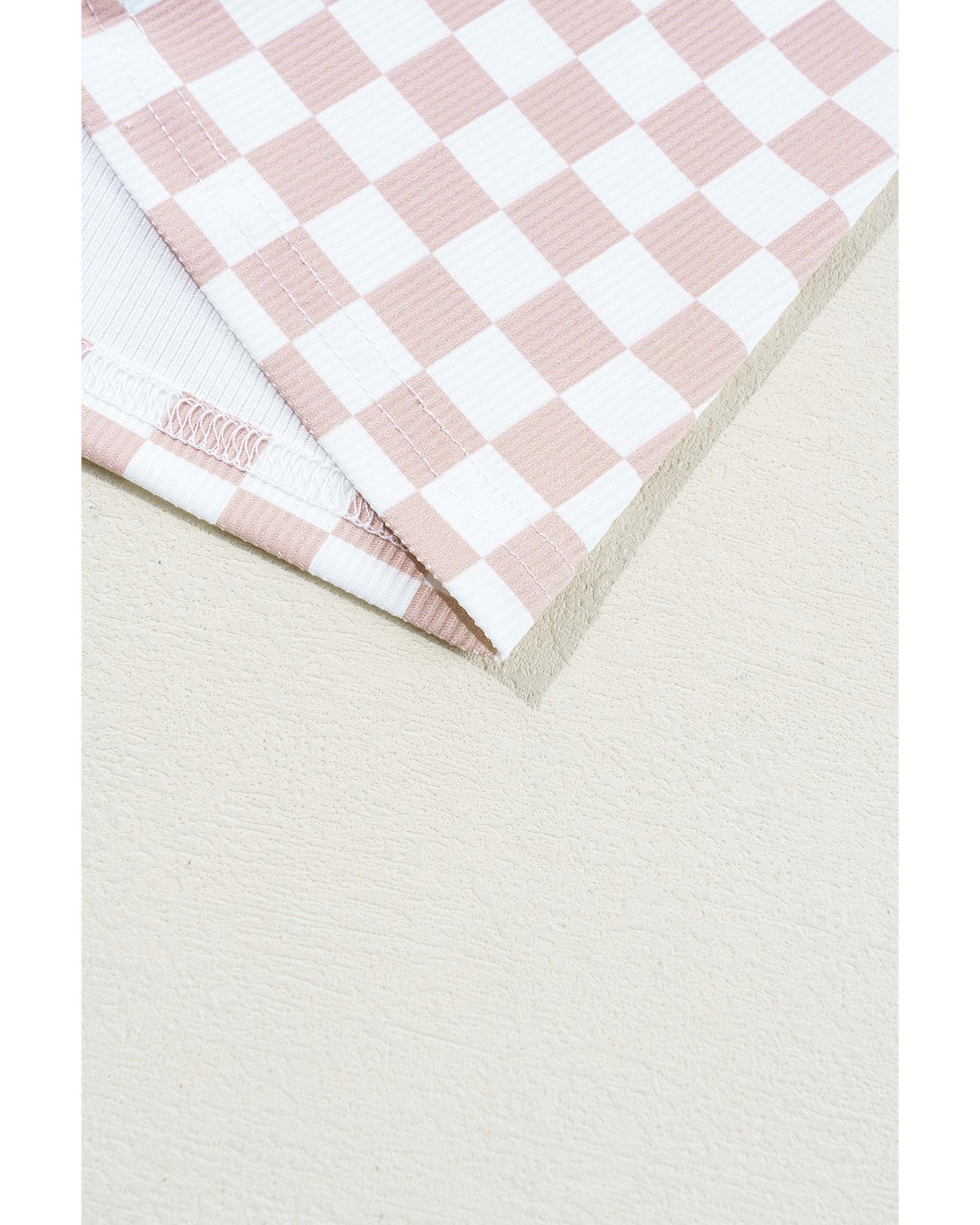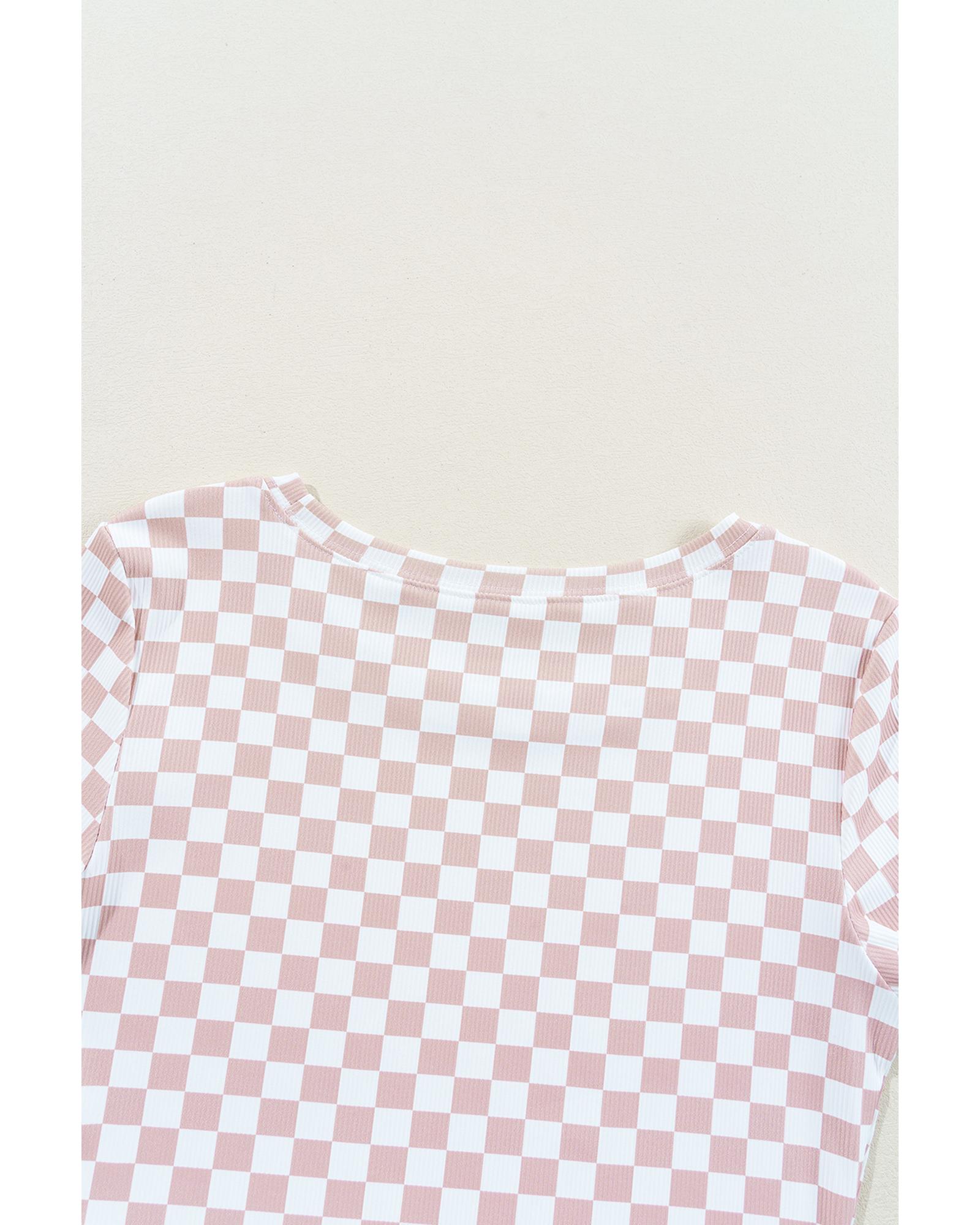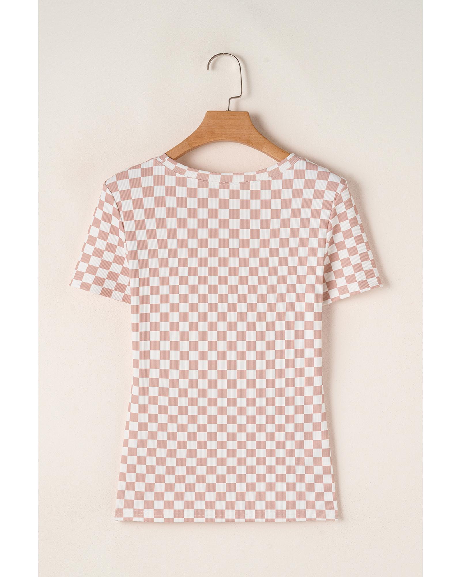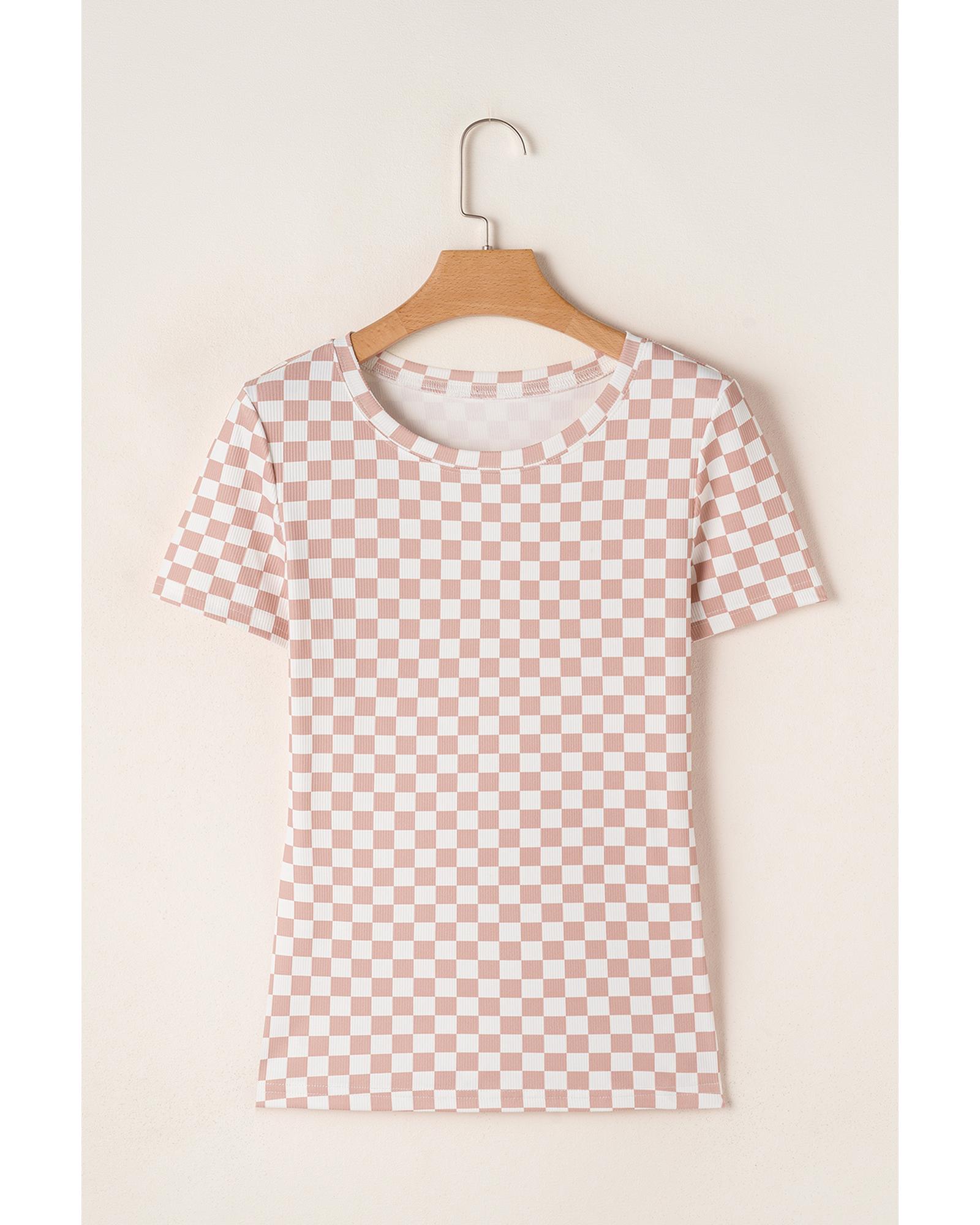 Pink Checkered Ribbed Slim Fit Crew Neck T Shirt – S