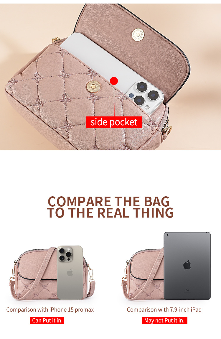 • Compact Yet Capable: Perfectly sized to carry all your daily necessities, such as your phone, wallet, keys, lipstick, and other small essentials, without the bulk of a large handbag.