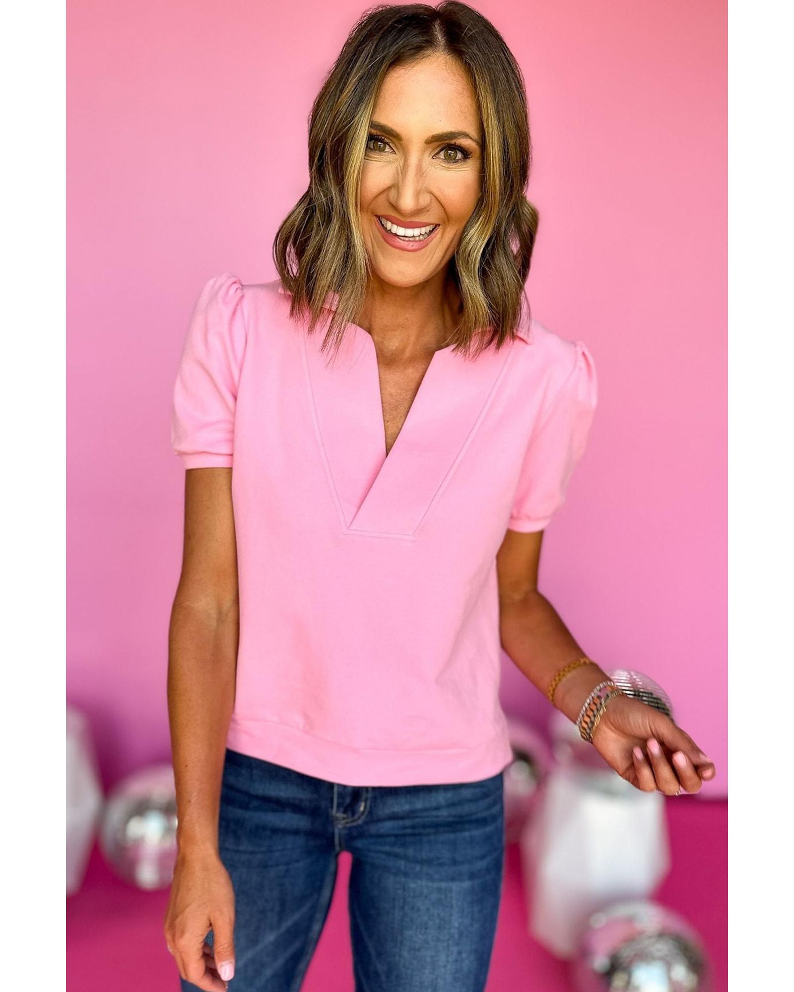 Pink Collared V Neck Puff Sleeve T-shirt – XL