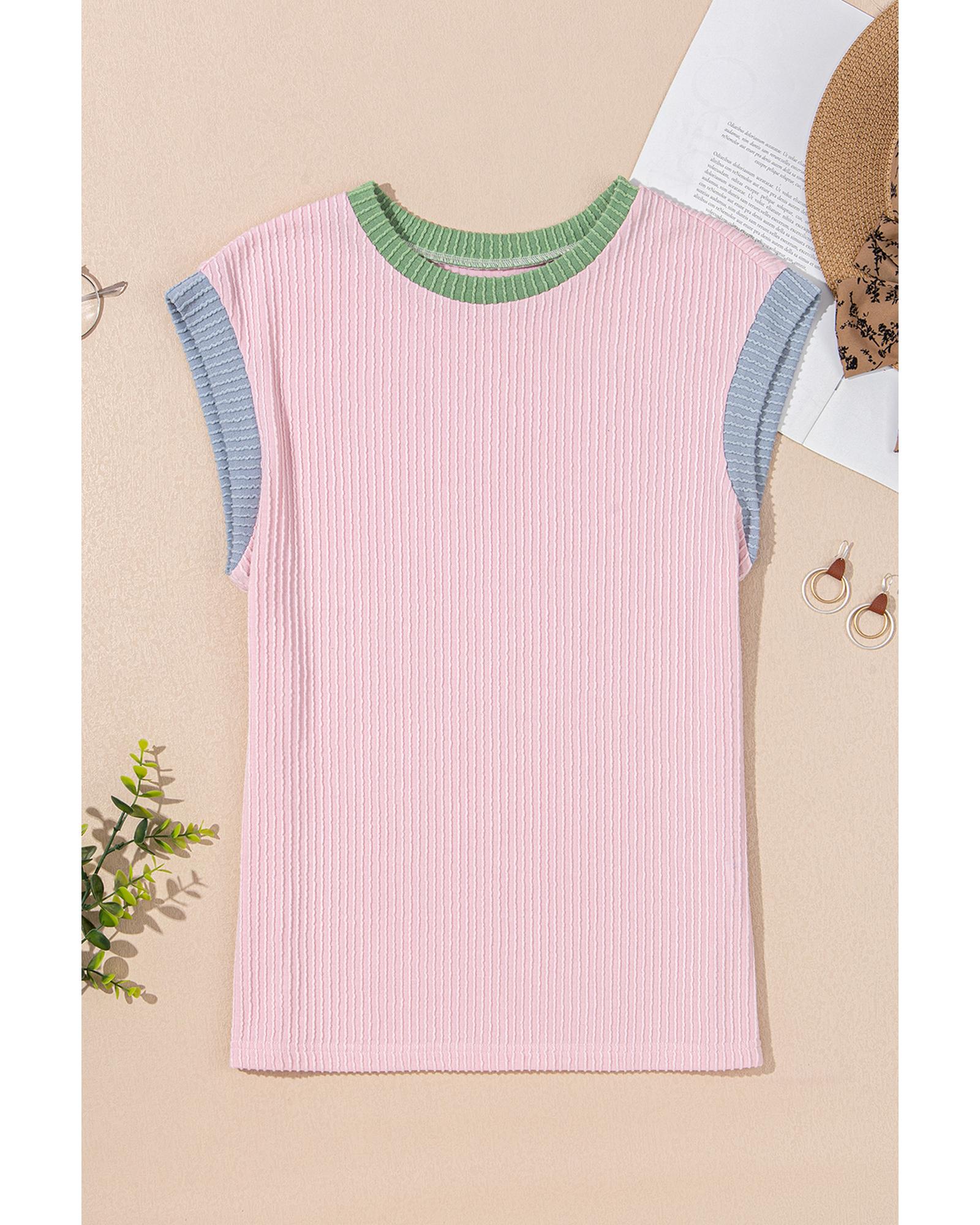 • Pink Color Block Corded Knit Crew Neck Tee