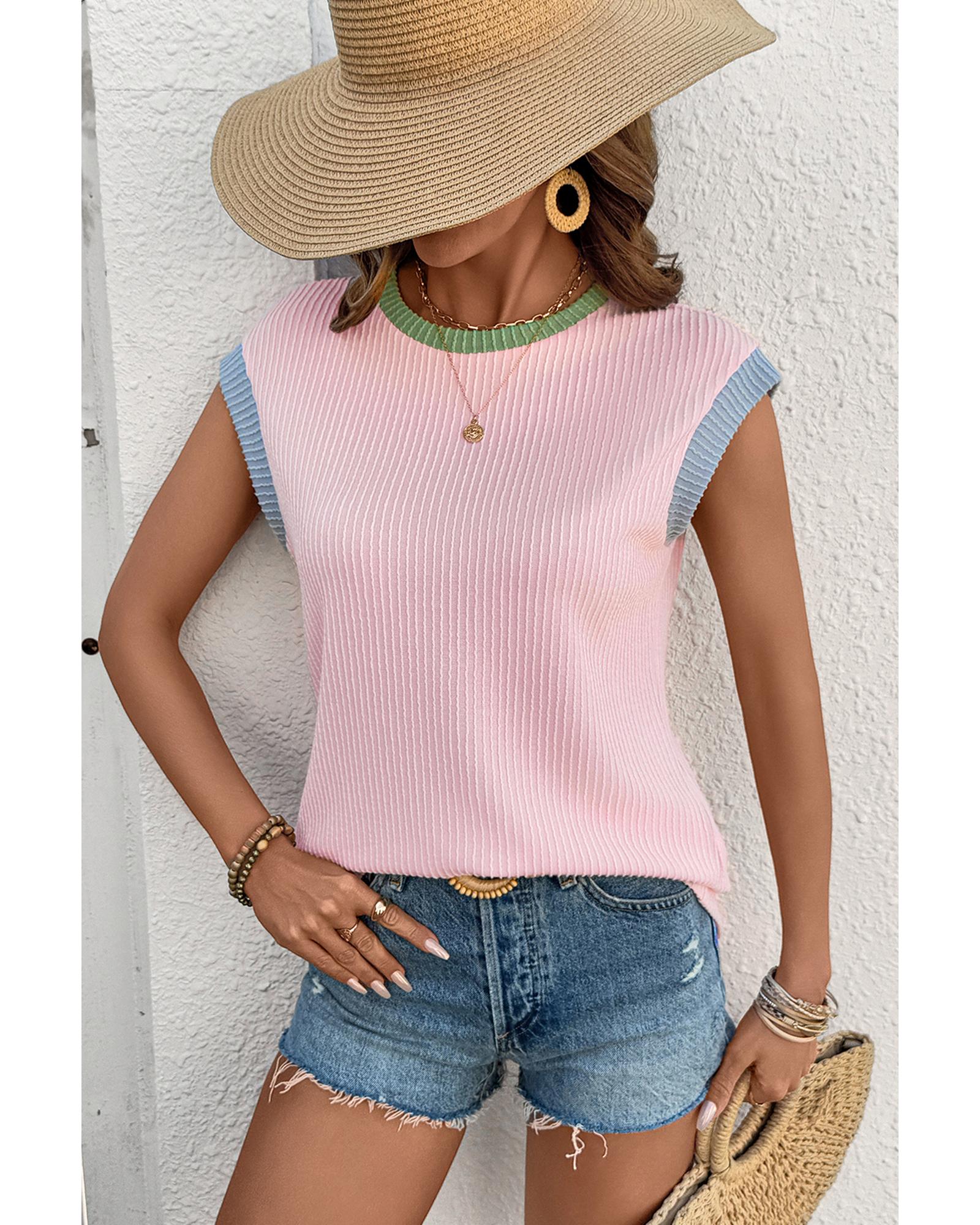 Pink Color Block Corded Knit Crew Neck Tee – S