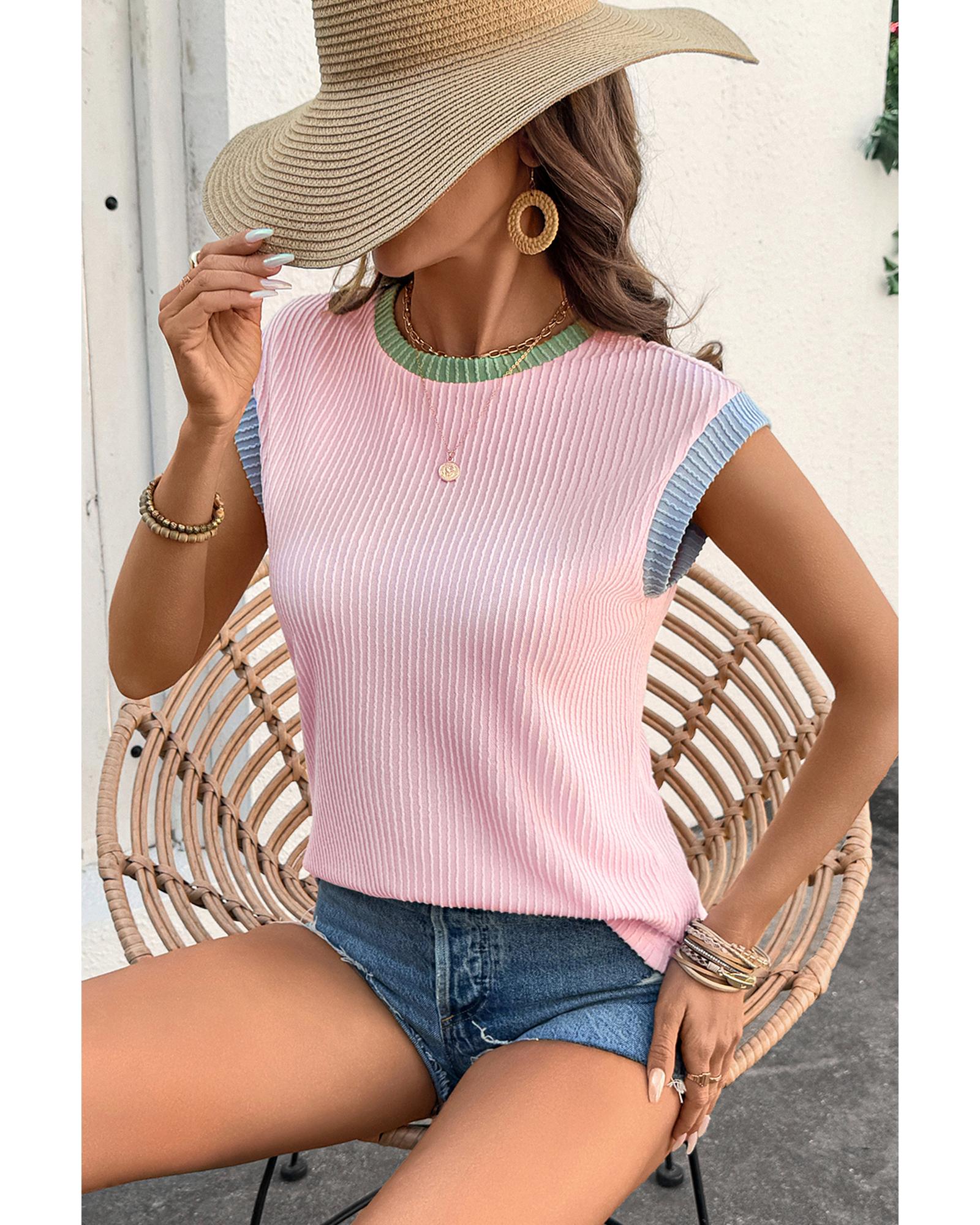 - Pink Color Block Corded Knit Crew Neck Tee